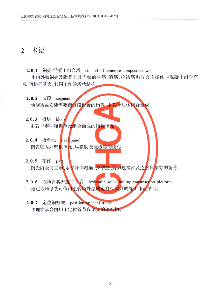公路桥梁钢壳-混凝土组合塔施工技术规程(T/CHCA 001—2026)