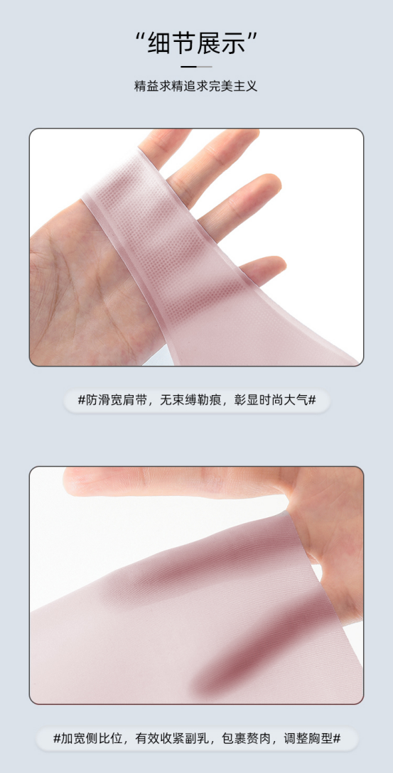 加宽肩带 均匀受力 能够牢牢固定防滑不掉肩 再也不用隔一段时间就躲进洗手间把内衣“归位”了。 即使套上紧身T恤,也看不见内衣轮廓 就像隐形了!一年四季想穿什么衣服都可以! 其次肩带还配合着密集的小孔孔, 将透气性做到最大化!!!!