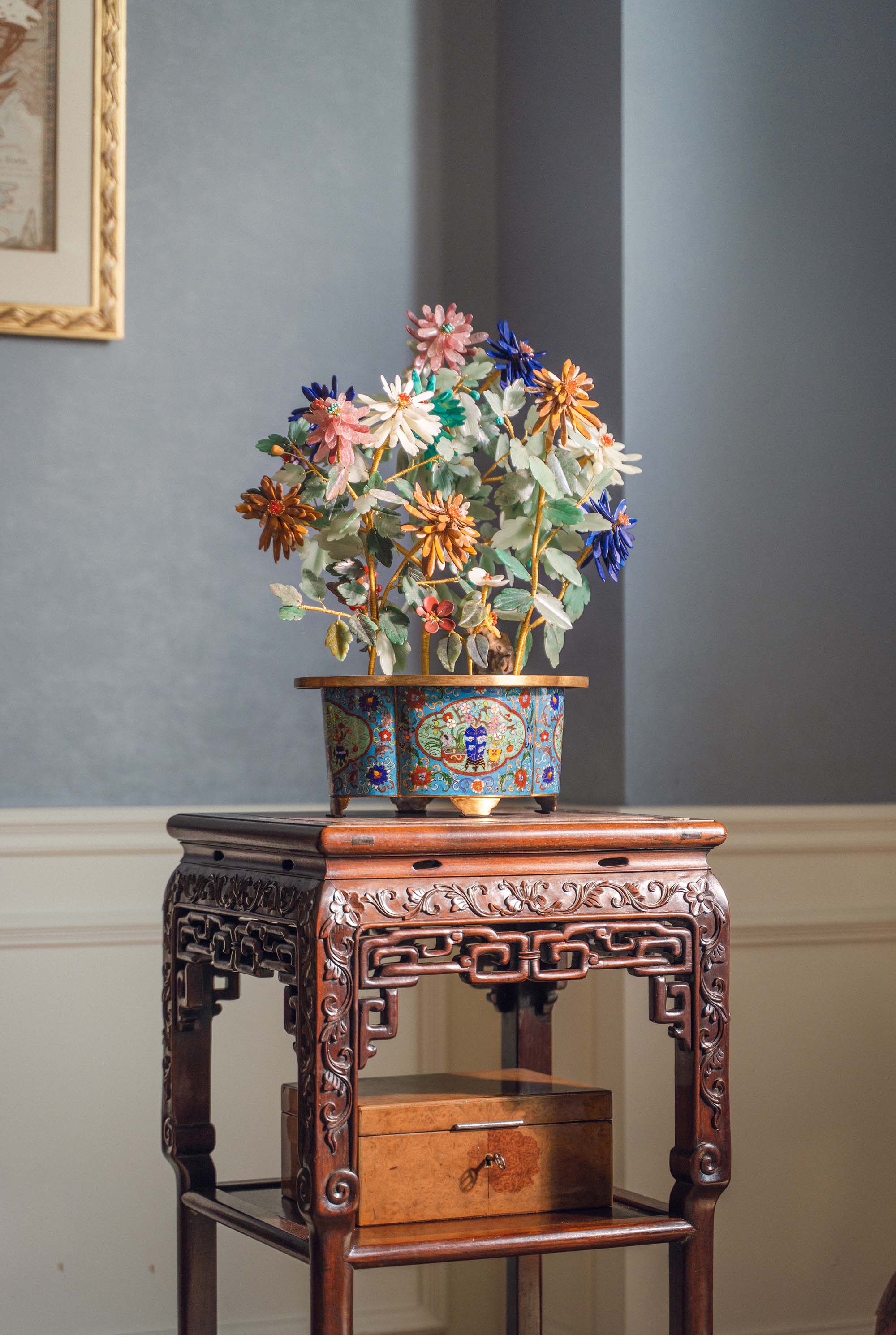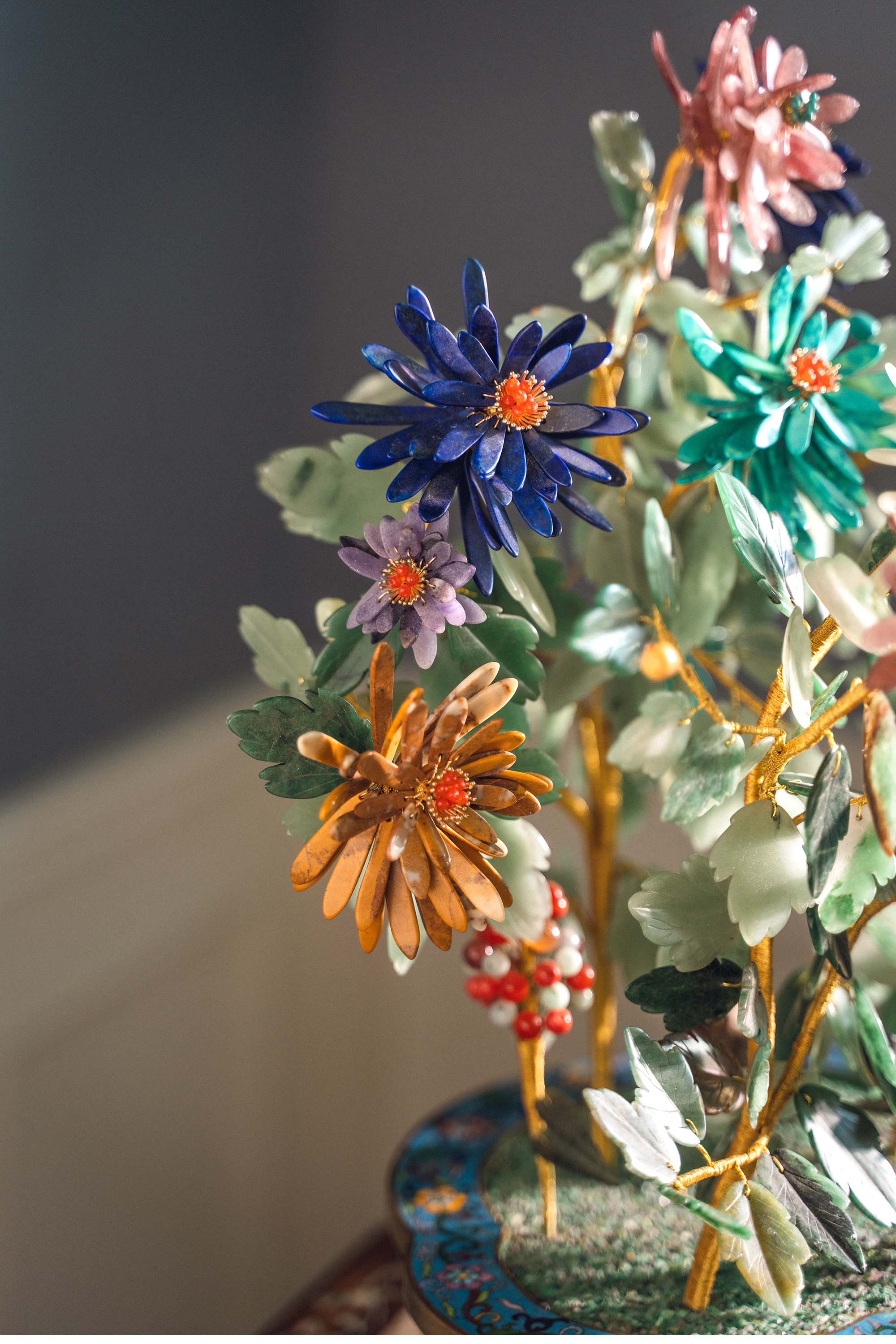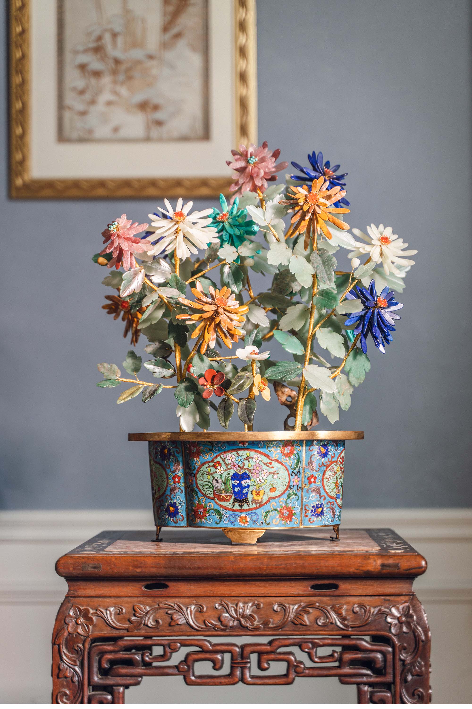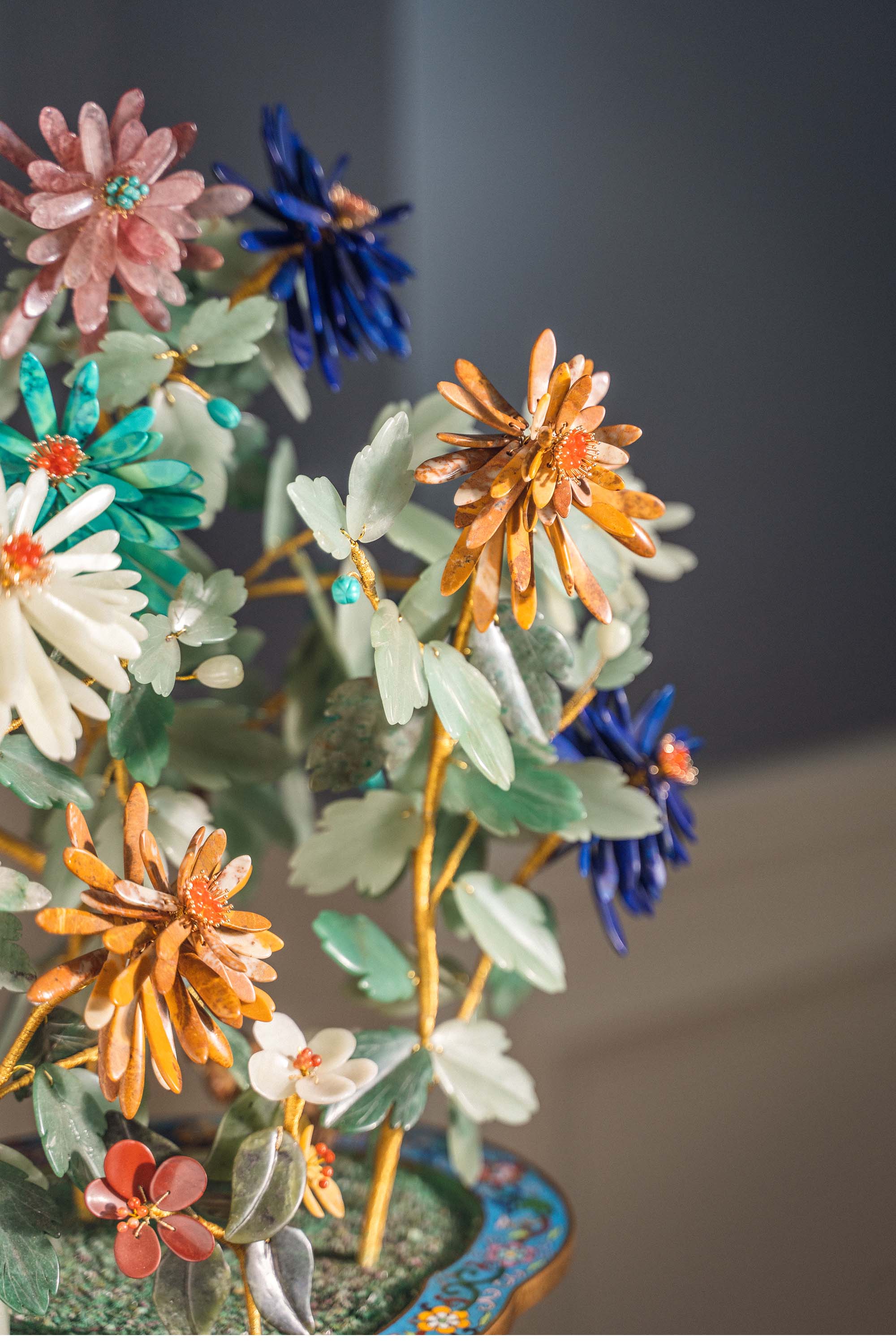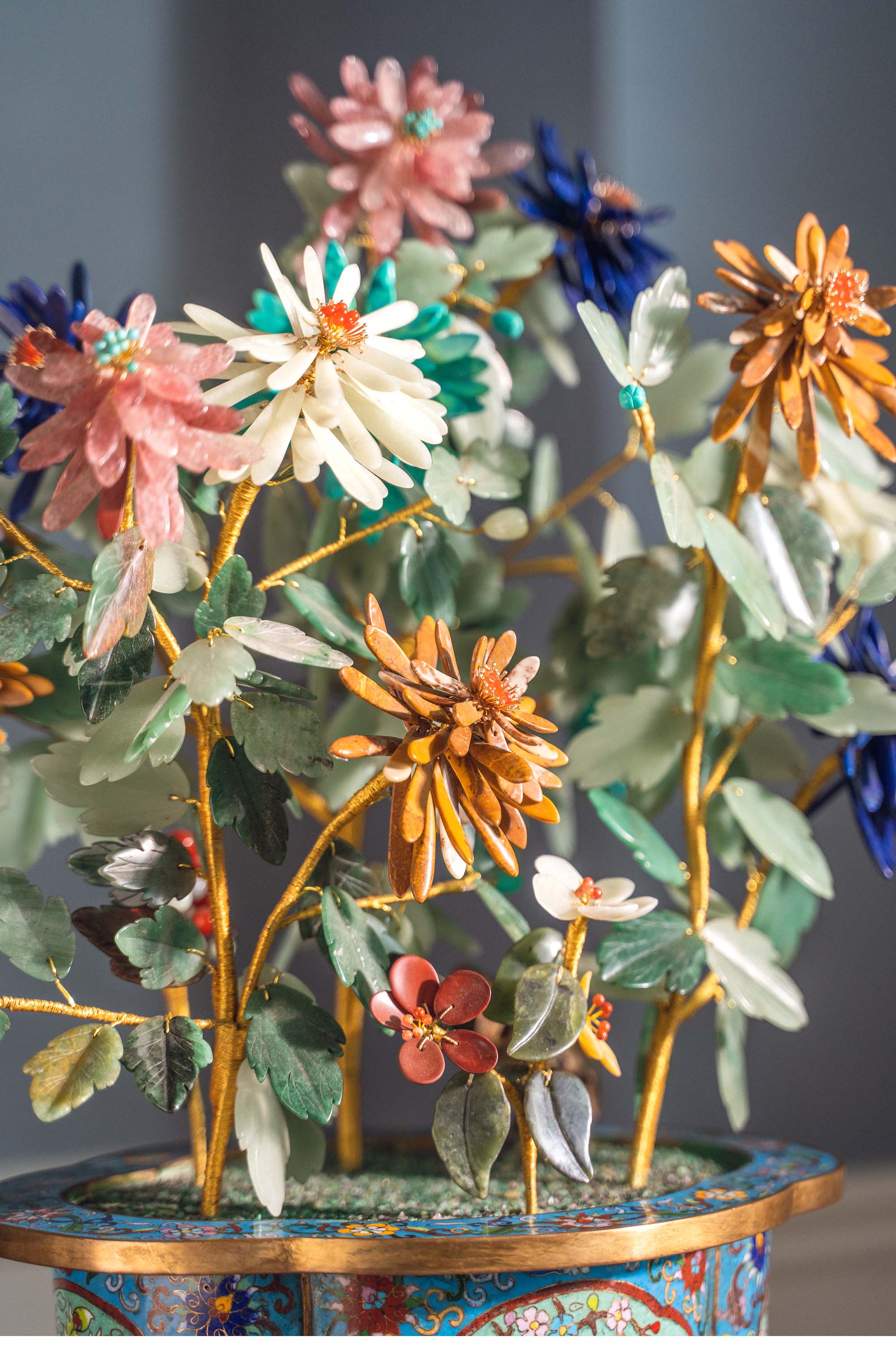 21世纪中国出品博古花卉纹景泰蓝盆装饰「彩菊齐绽」珍宝像生盆景