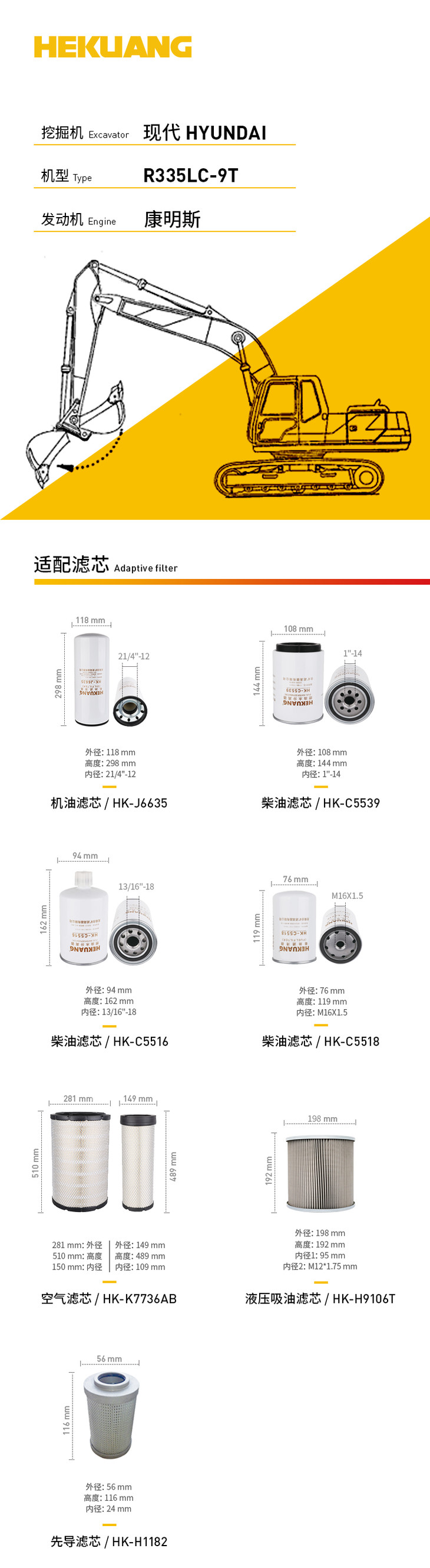 现代R335LC-9T(康明斯)挖掘机滤芯 机油柴油空气滤芯 液压油先导滤芯