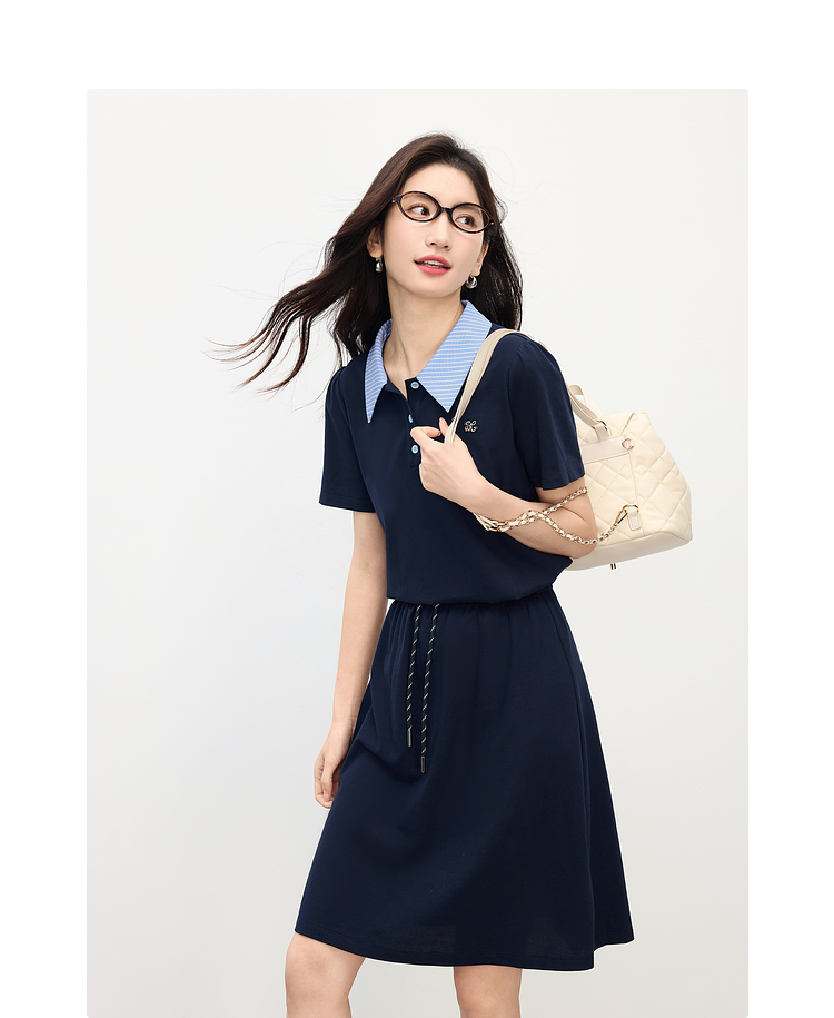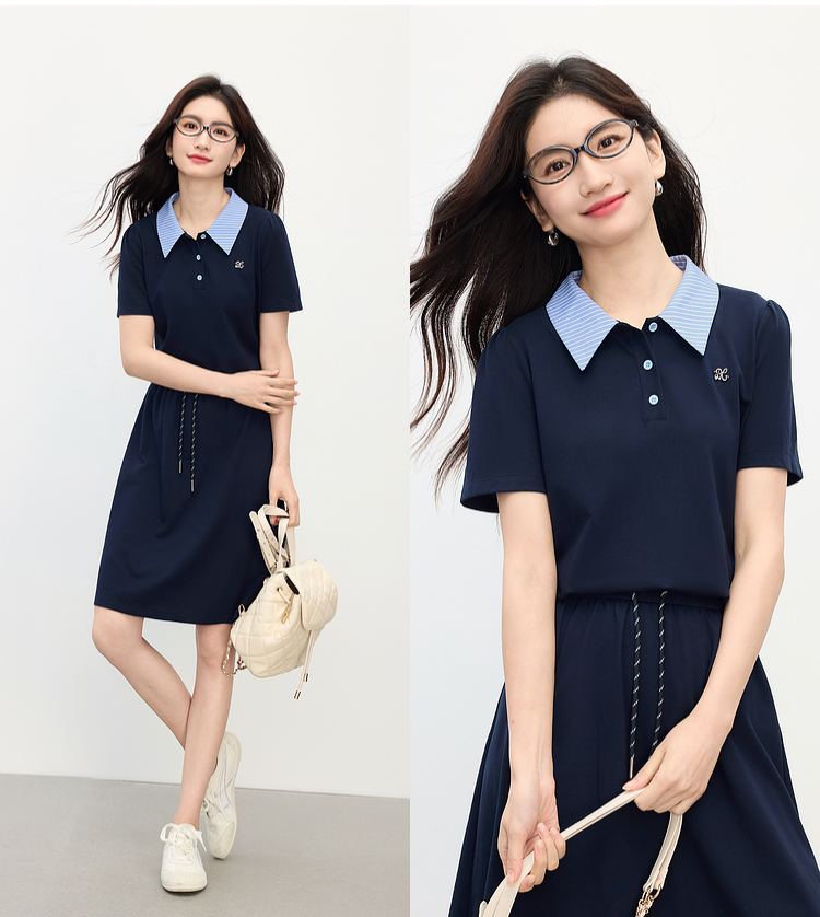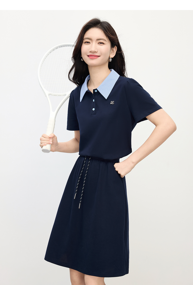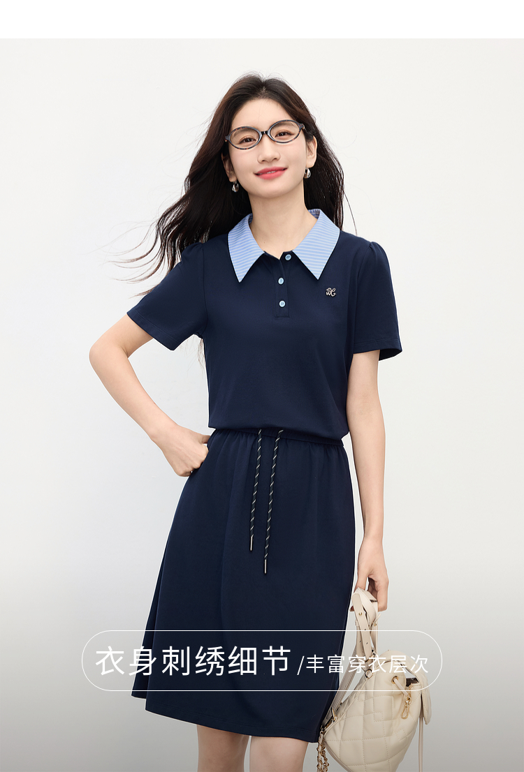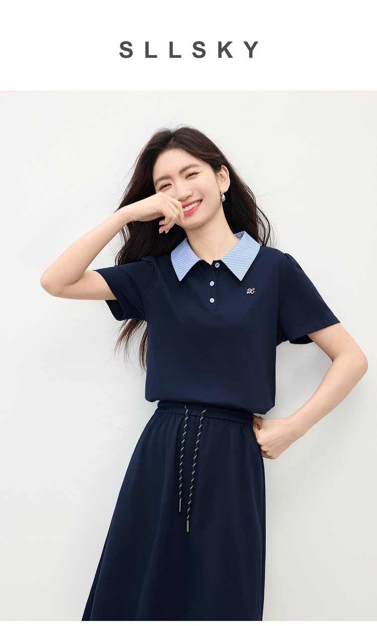 【专属特价】熙世界夏季套装女2025新款休闲撞色POLO领T恤上衣半身伞裙两件套