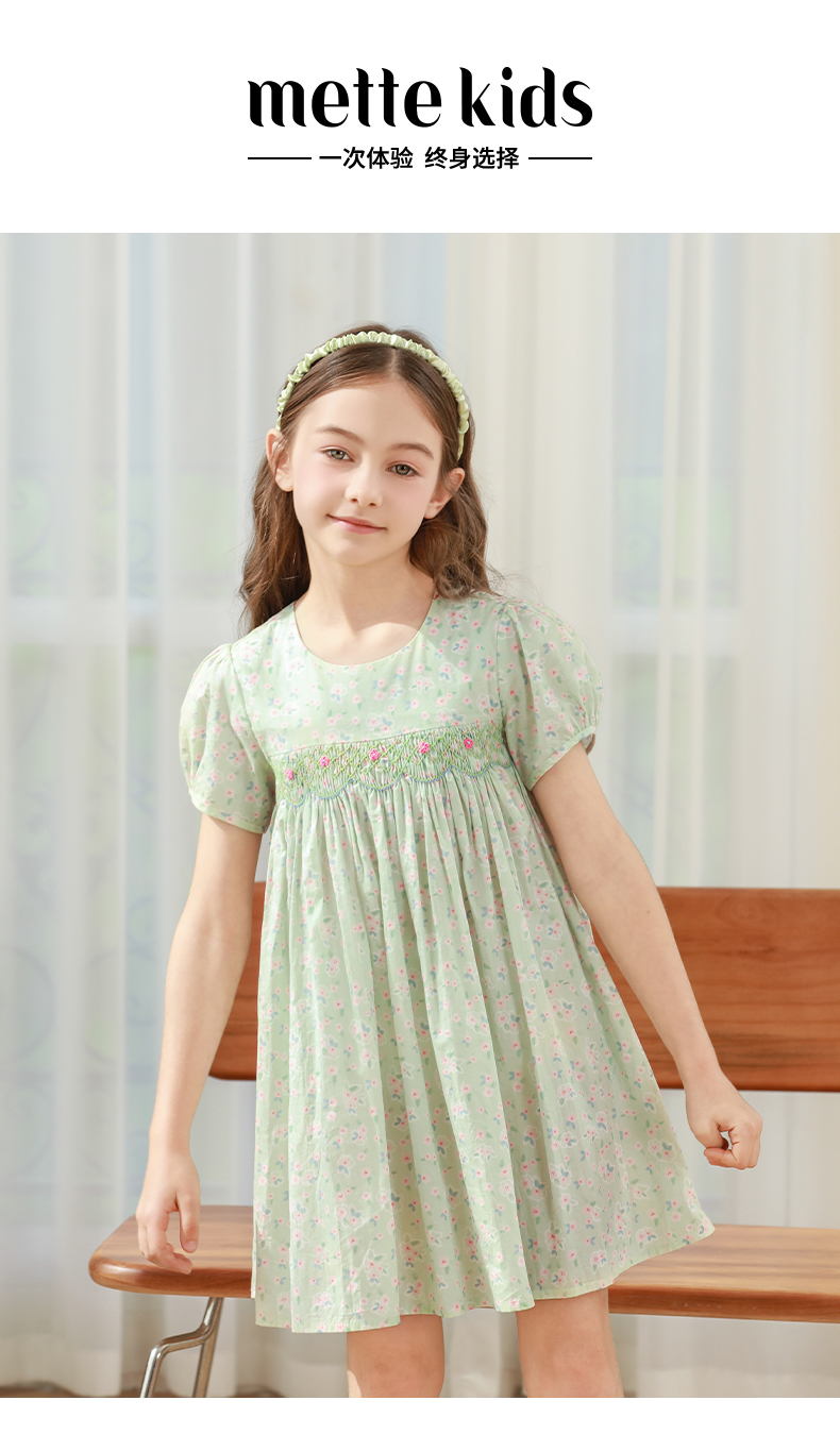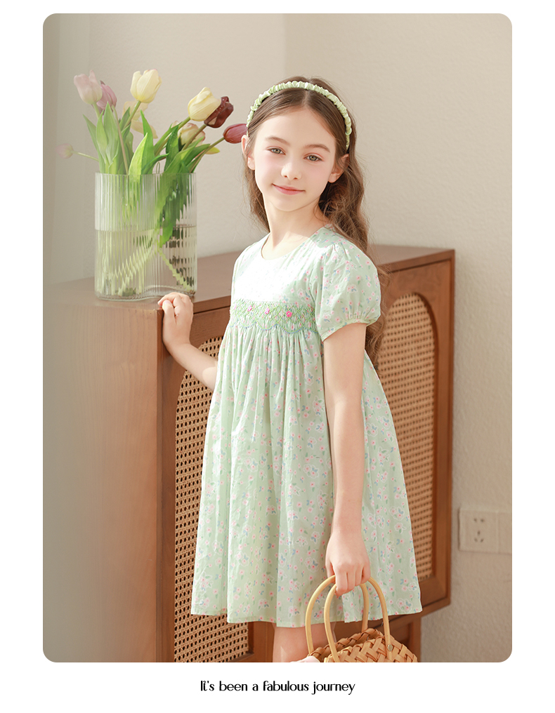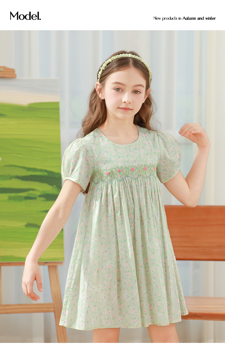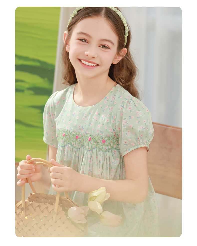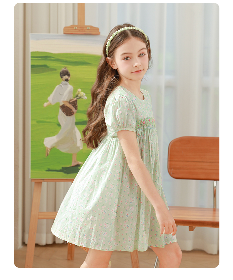 女童连衣裙2024夏季新款儿童绿色绣花纯棉裙子泡泡袖碎花公主裙