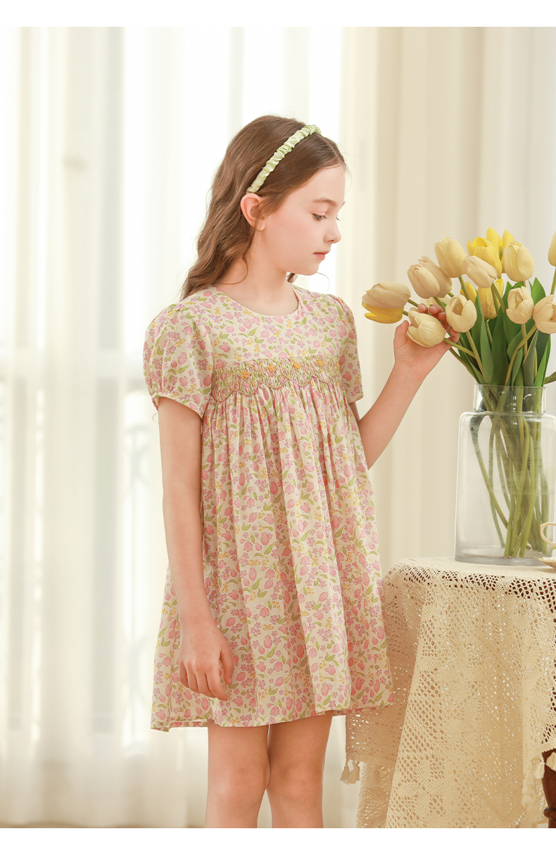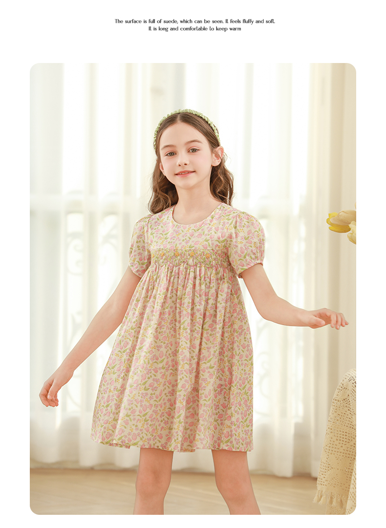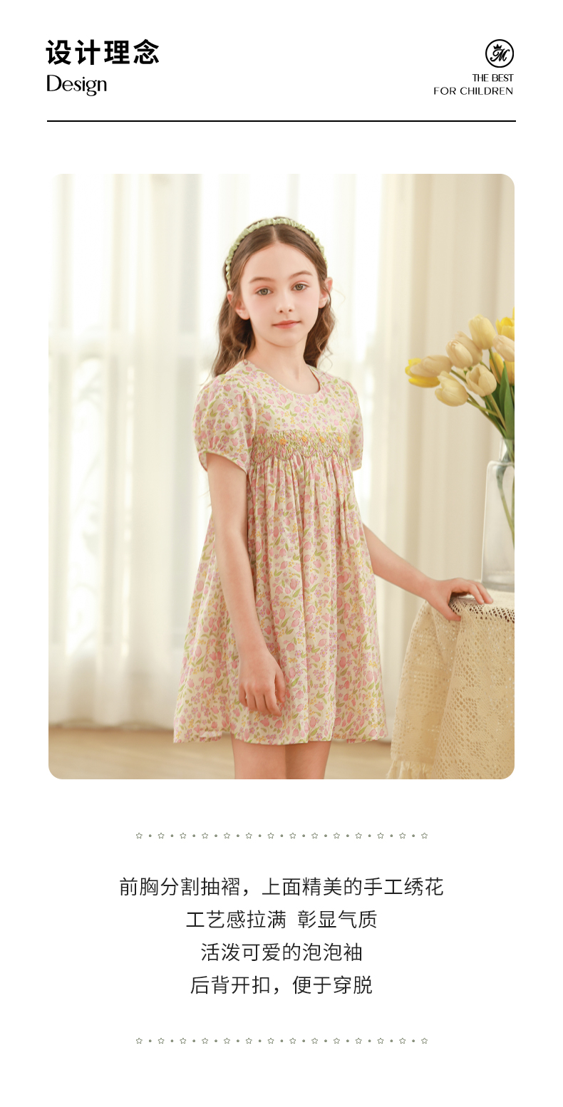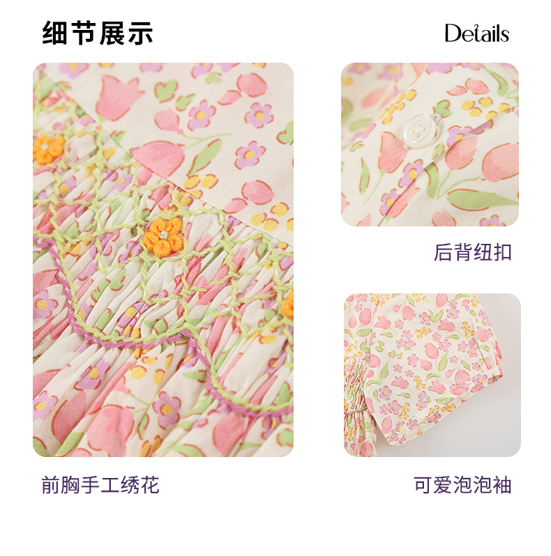 女童连衣裙2024夏季新款儿童绿色绣花纯棉裙子泡泡袖碎花公主裙