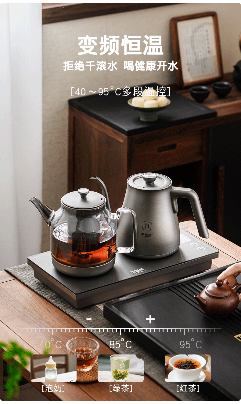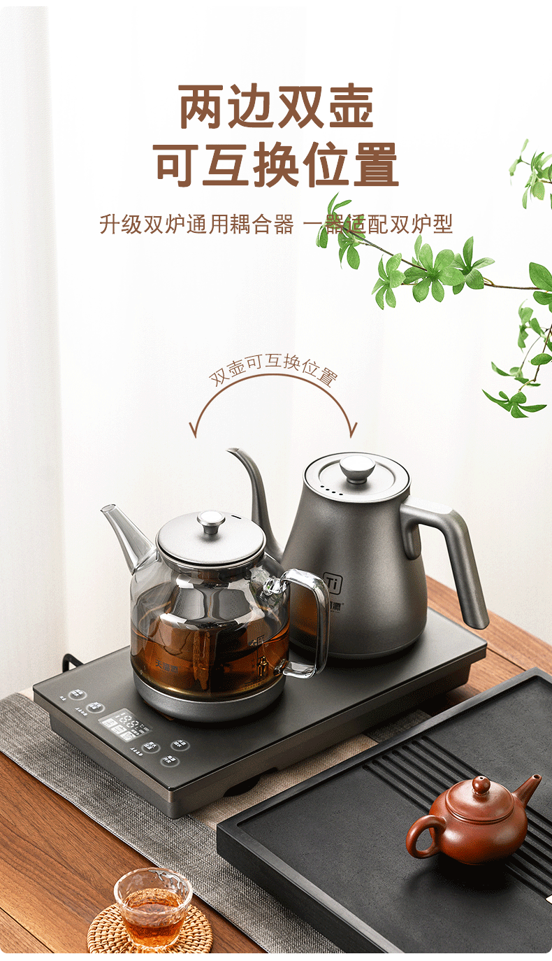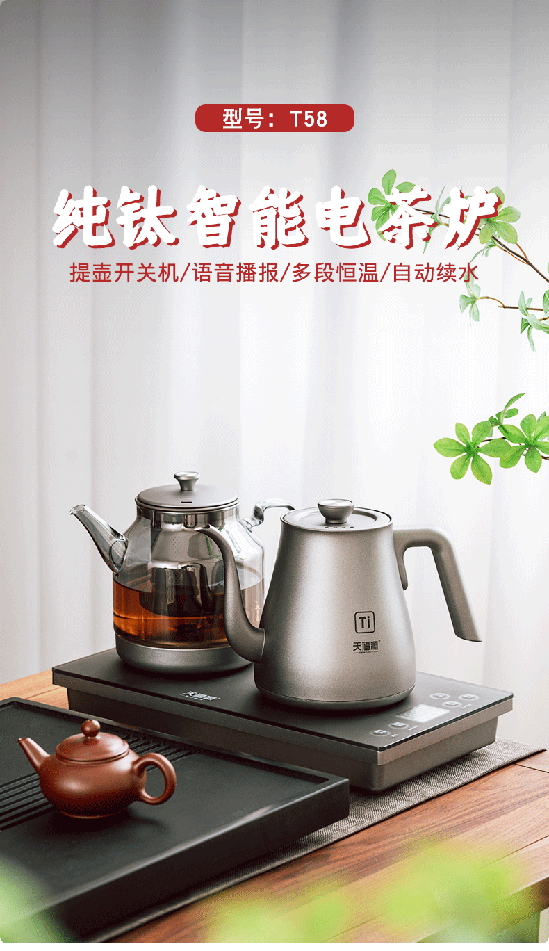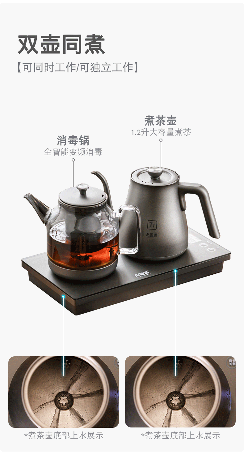 天福源/T58双壶款/T5单炉/钛晶纯钛烧水壶消毒锅双炉自动上水电热茶炉变频恒温煮茶器