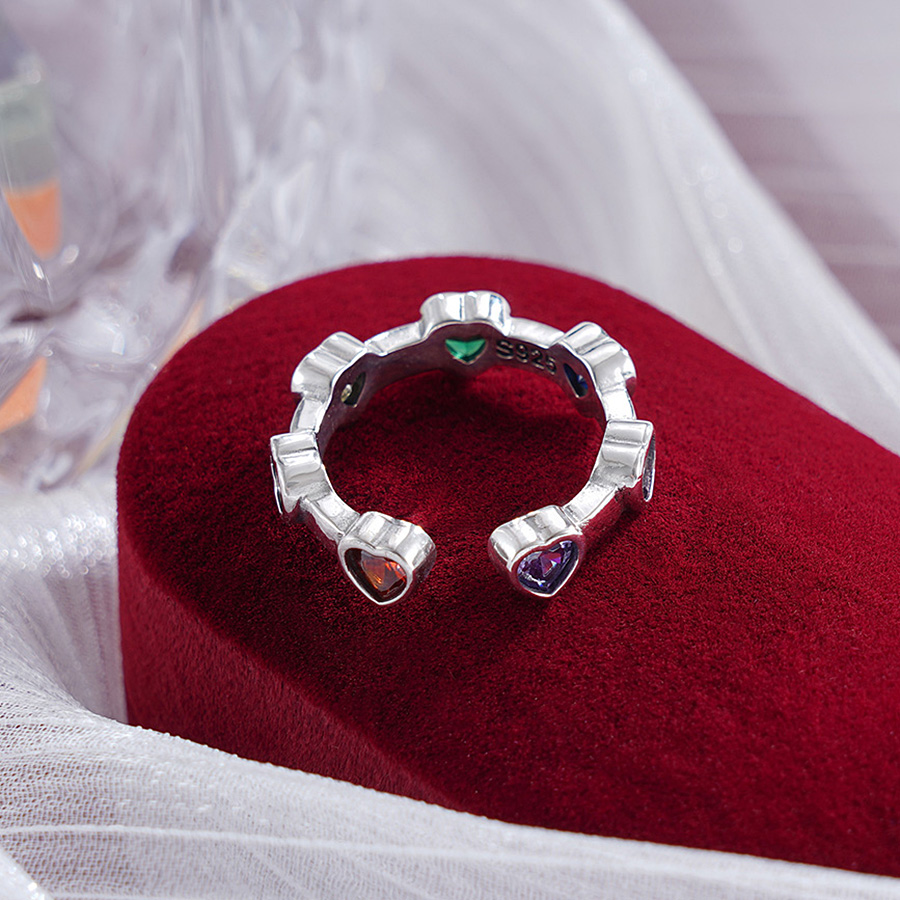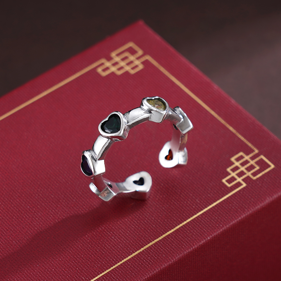 【寓意】:一款颜值在线的小众戒指,纯银金属勾勒出爱心,配上五彩锆石,洋溢出别样的浪漫。寓意心心相依,甜蜜相伴。
