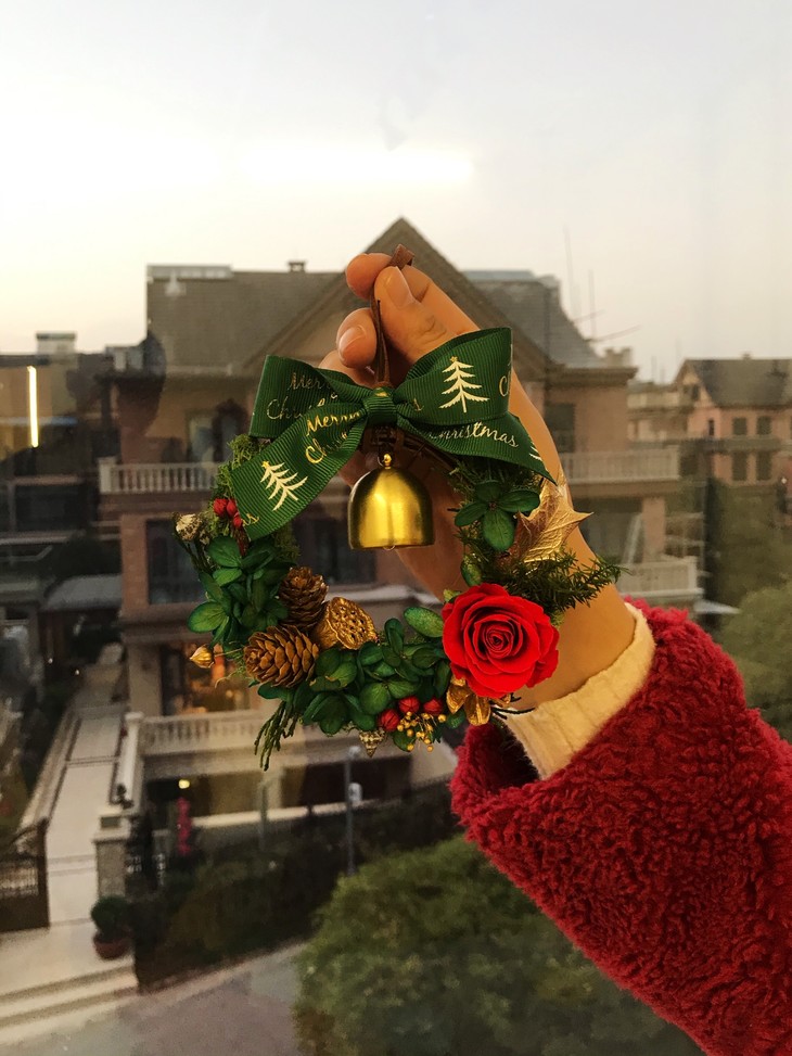 挂上一只永生花环,等候圣诞的到来
