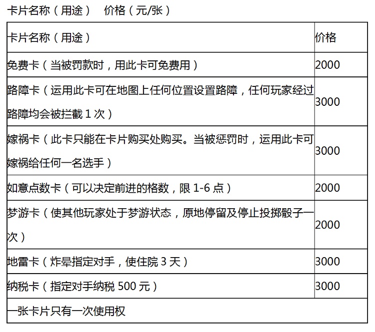 本游戏是以经典电脑游戏大富翁为蓝本的真人游戏,参赛者以队制形式报名参赛,每队4人,1人负责掷骰子,另外3人充当其智囊团,共同前行,在游戏过程中出谋划策,每盘游戏由两队展开角逐。每队开始时均有20000元的启动资金和随机抽取的一张卡片(卡片用途见下表)。每盘比赛分6轮。