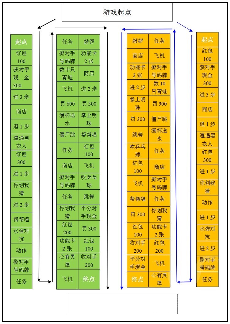 8. 僵尸跳:玩家到此处时,需要被贴上纸符,并按僵尸那样,后一个人搭着前一个人的肩膀,蹦着前进,掷2轮骰子后才可以结束僵尸跳。