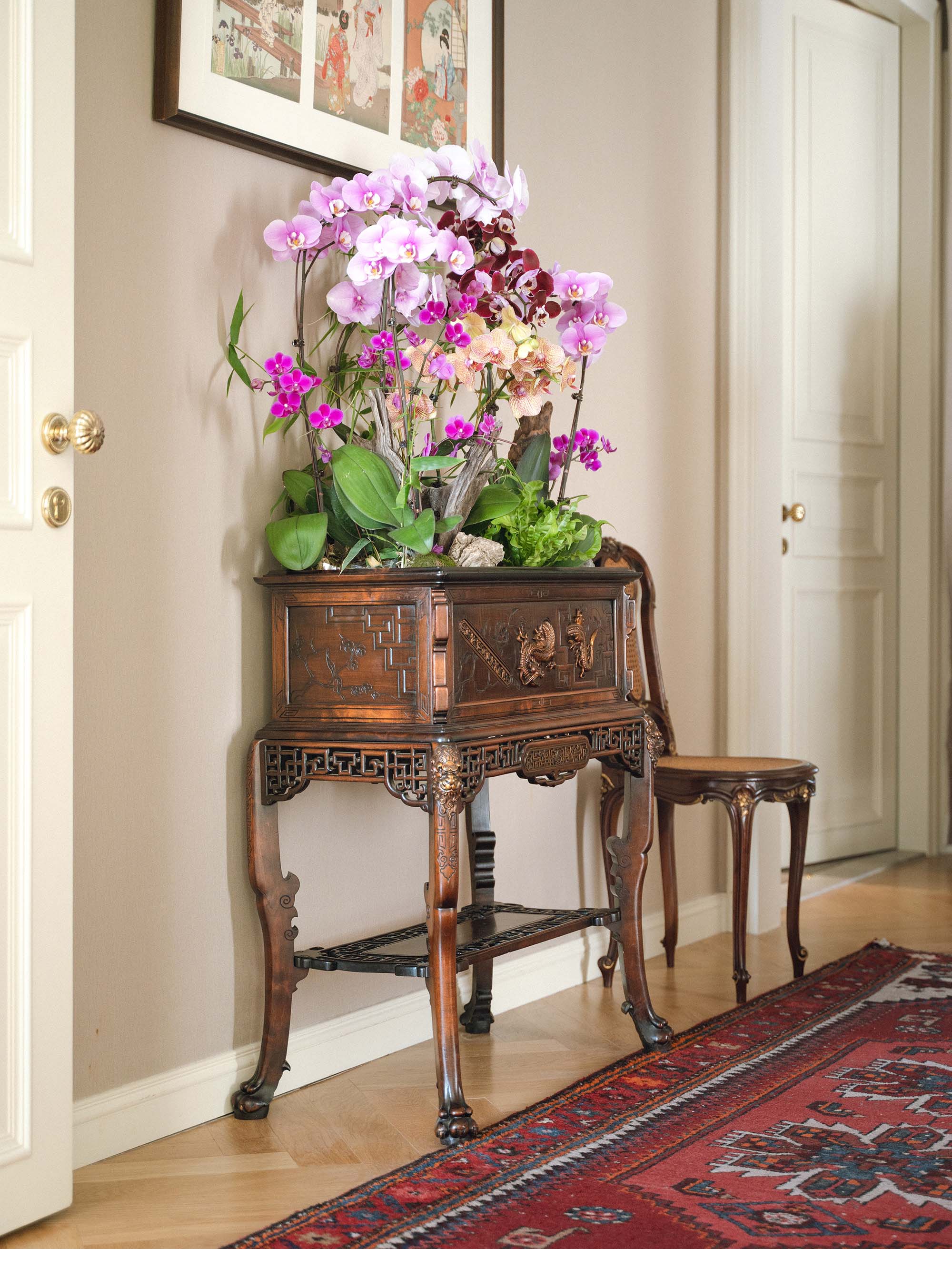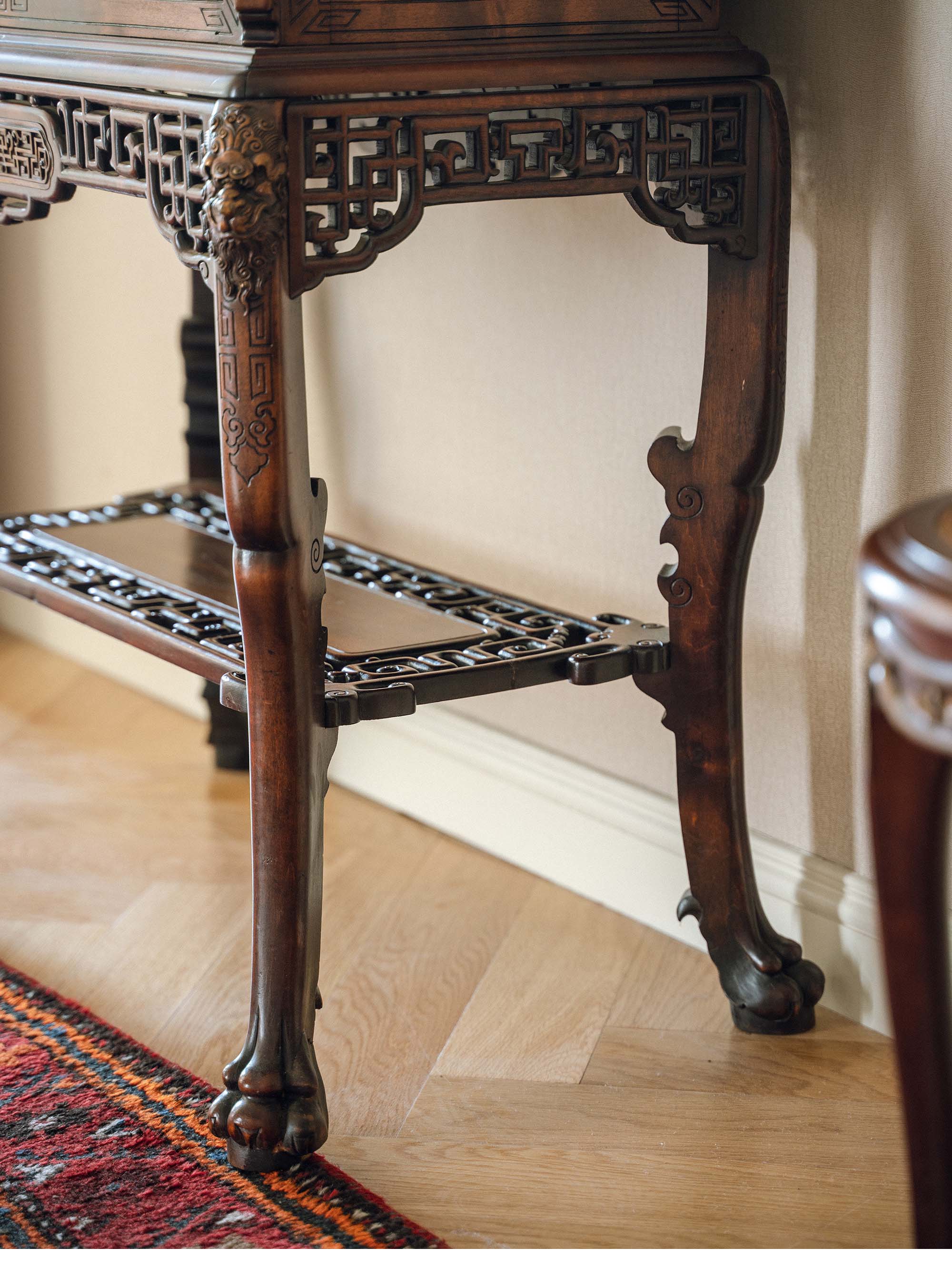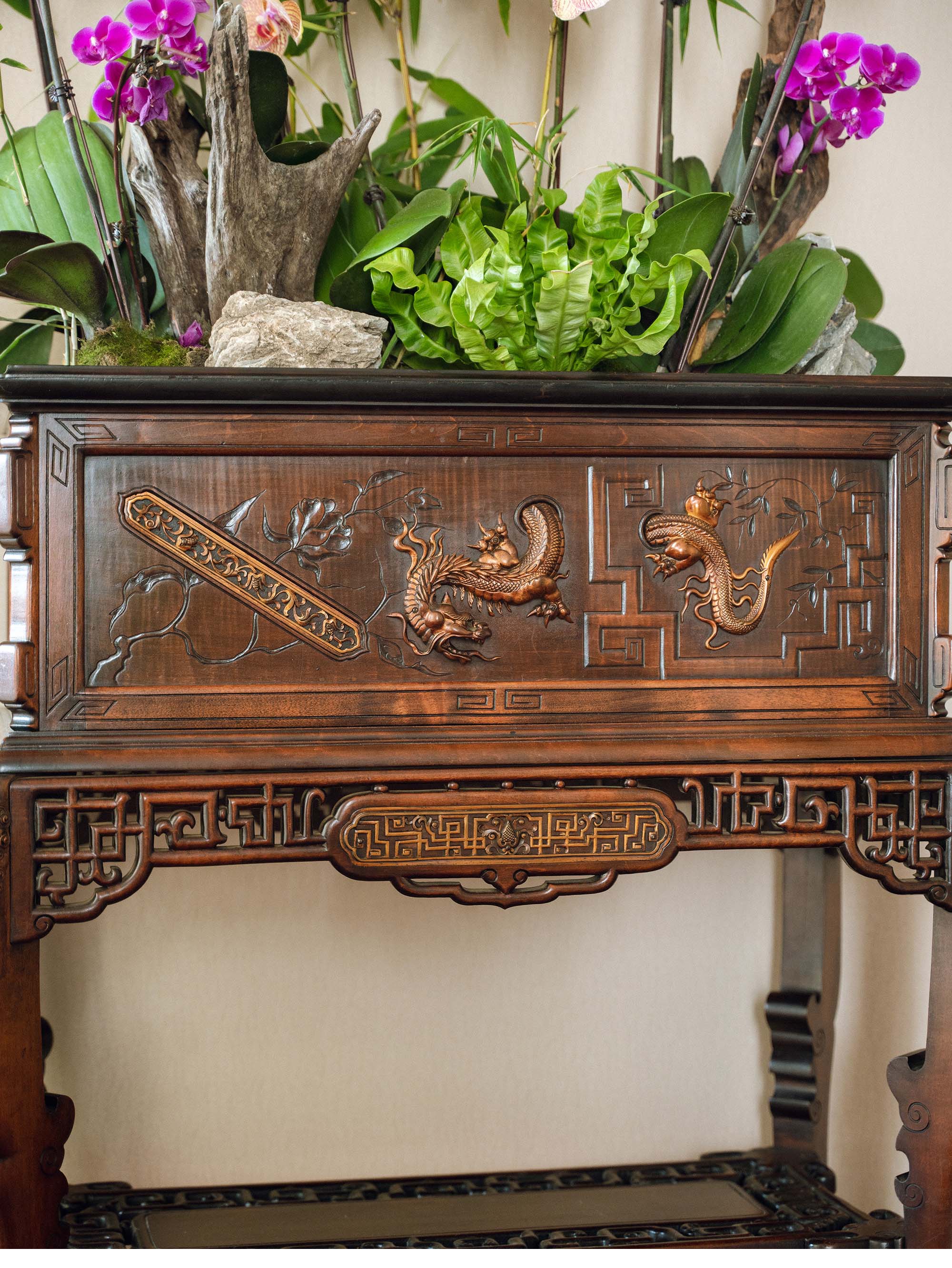 【已售】独角鹿西洋古董 19世纪法国出品VIARDOT东方风格蟠龙造型铜鎏金精雕装饰花叶祥纹主题硬木花几