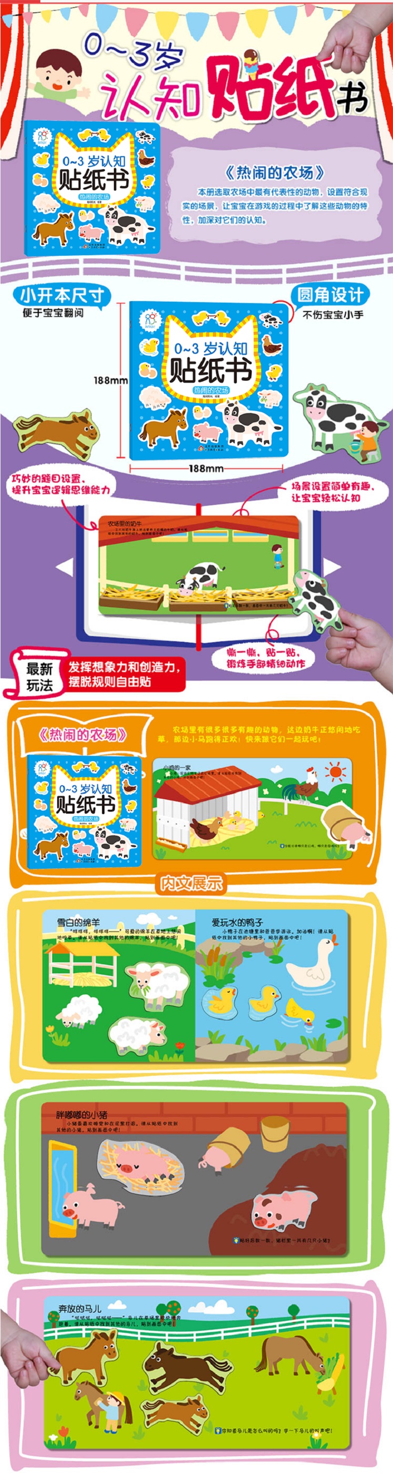 《热闹的农场》里选取了几种有代表性的农场动物,让宝宝认识这些可爱的动物,并在贴贴纸的过程中了解这些动物的特性,加深对农场动物的认知。