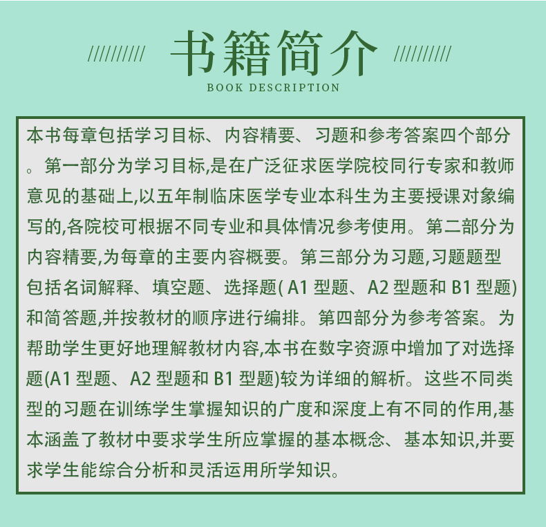 本书包括学习指导与习题集两大部分。**部分为学习目标和内容精要。**部分为习题集和参考答案,题型包括选择题(A1型,A2型和B1型),名词解释和问答题,并按教材的顺序进行编排。每章后面附有参考答案。这些不同类型的习题在训练学生掌握知识的广泛和深度上有不同的作用。本书基本涵盖了教材中需要求学生所应掌握的基本概念,基本知识,并要求学生能综合分析和灵活运用所学知识,使学生更好地理解教材内容。读者对象主要是临床医学专业的本科生,作为学科考试复习与执业医师资格考试辅导用书;也可作为临床医学专业的研究生、进修生和住院医师资格考试的参考资料。
