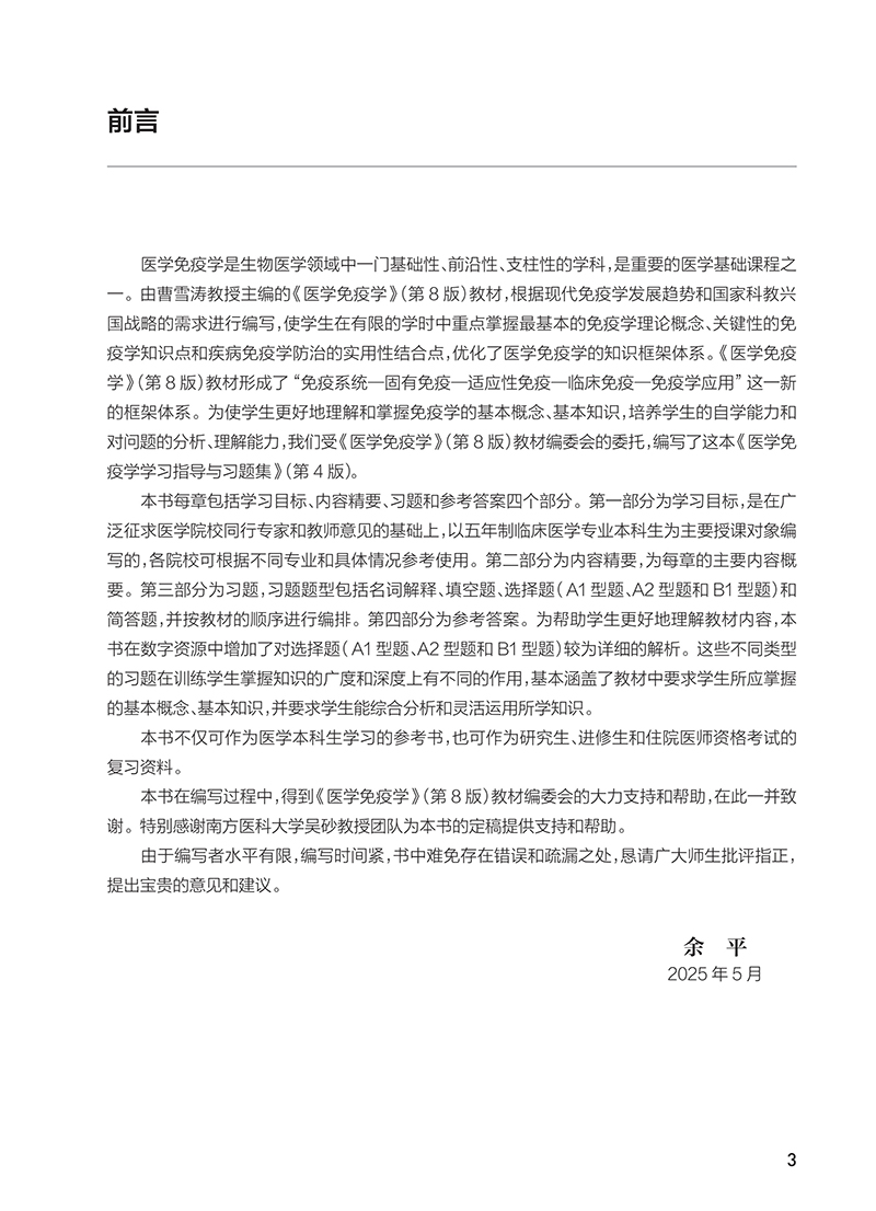 医学免疫学学习指导与习题集 第4四版 十四五规划教材配套教材全国高等学校配套教材 余平 主编 供基础临床等专业用人民卫生出版社