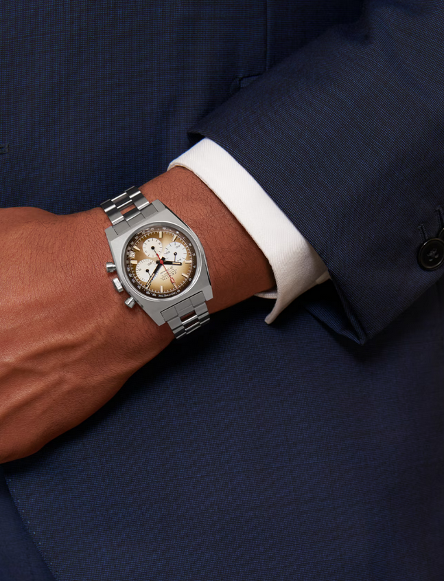 镜面 材质 | 蓝宝石水晶玻璃 | 表盘 | 精钢表壳 烟棕色渐变表盘,搭配白色计时盘;时标:镀铑刻面,涂覆米色Super-LumiNova®SLN夜光物料;指针:镀铑刻面,涂覆米色Super-LumiNova®SLN夜光材料 计时 日期显示 背透 |