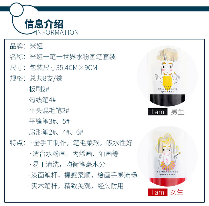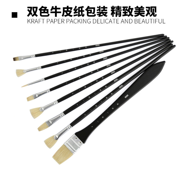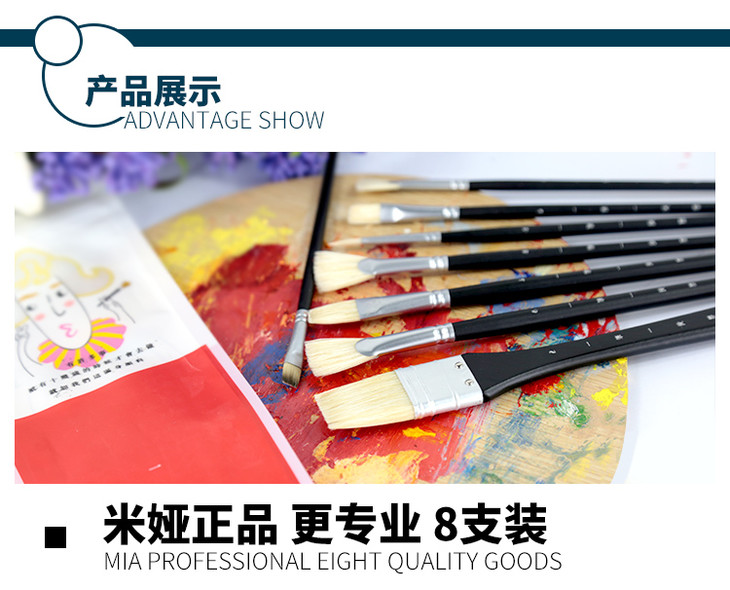 米娅水粉笔 猪鬃水粉笔 勾线笔扇形笔笔刷 一笔一世界8支套装