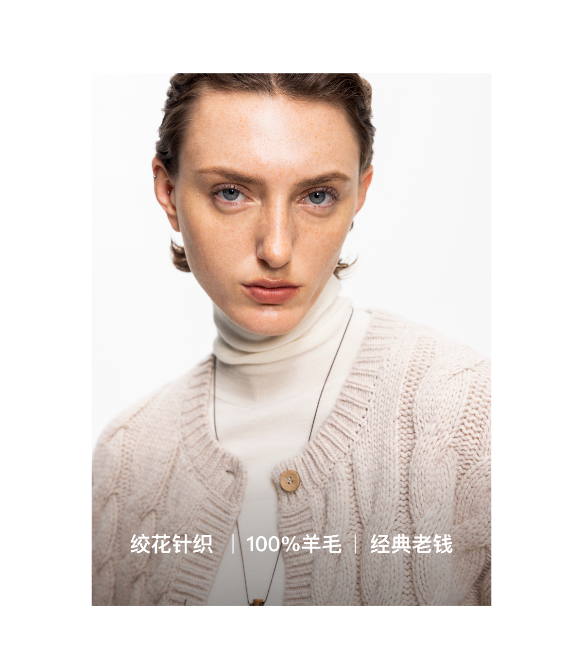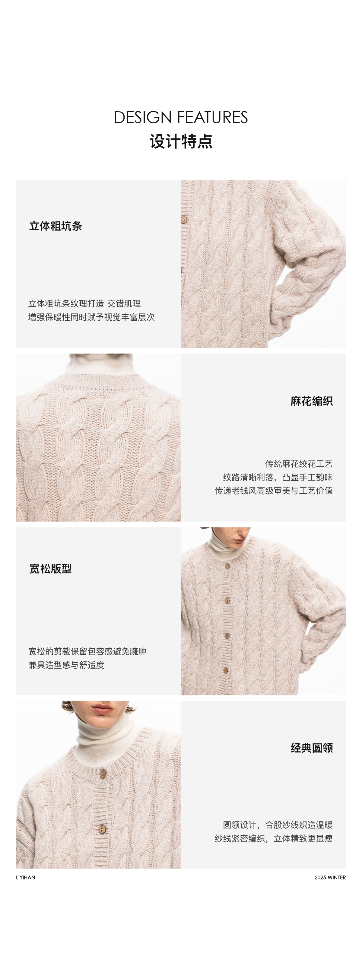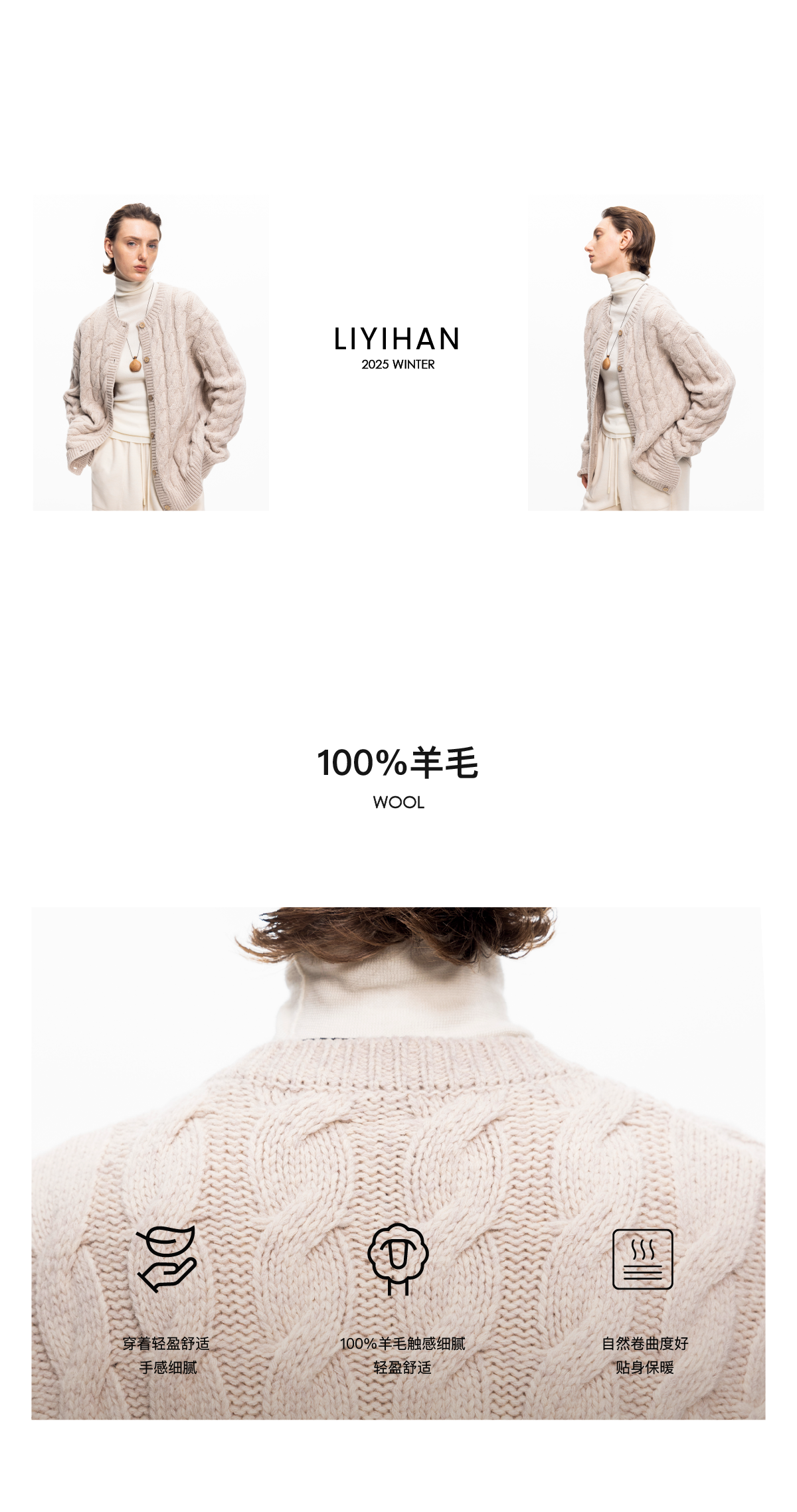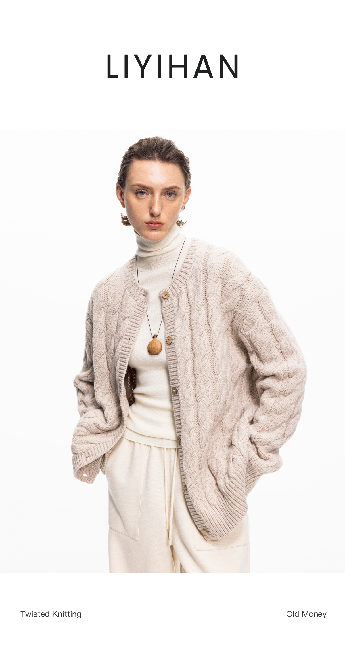 LIYIHAN 2025秋冬新款老钱风羊毛针织衫杏色小众设计感开衫毛衣女
