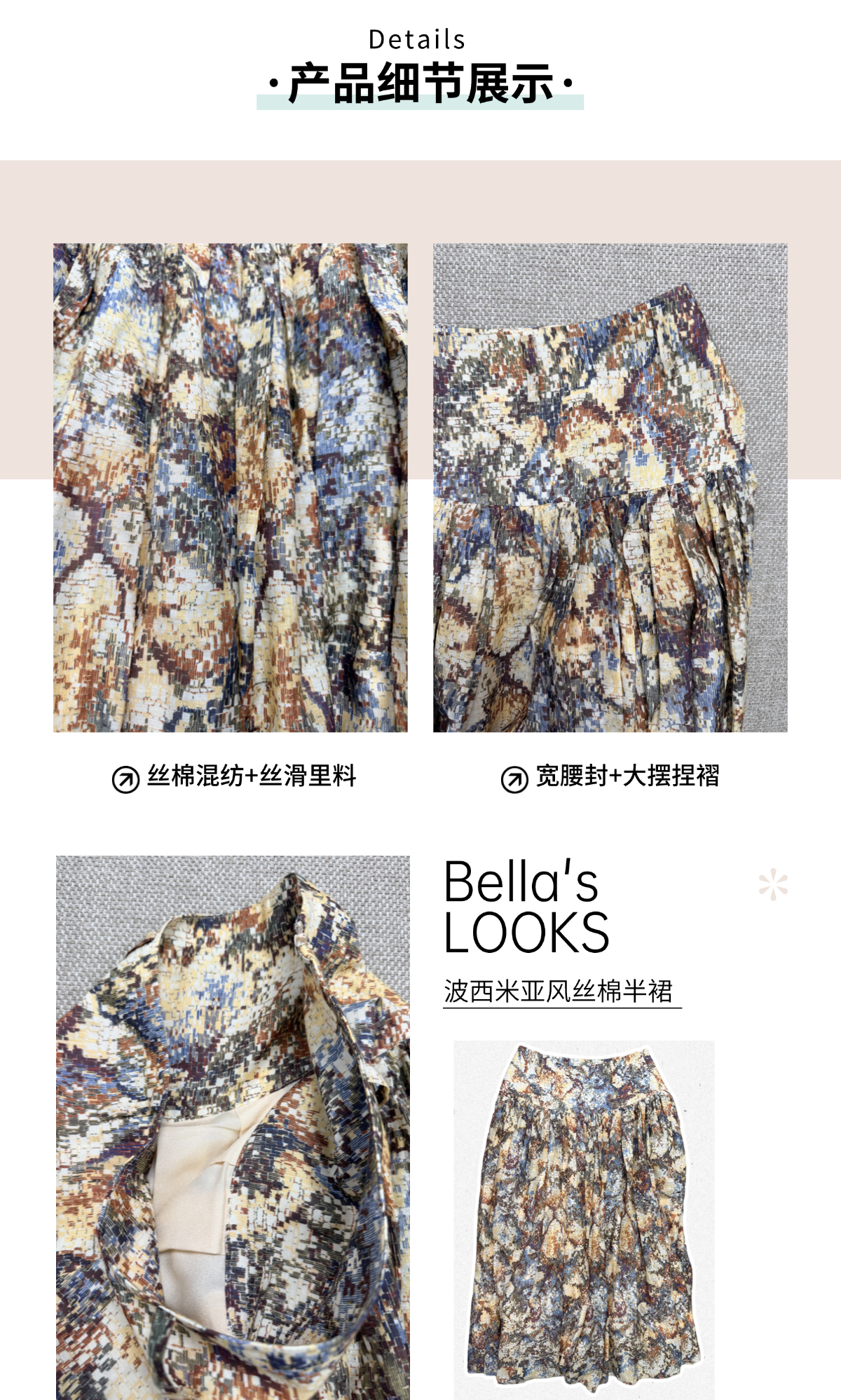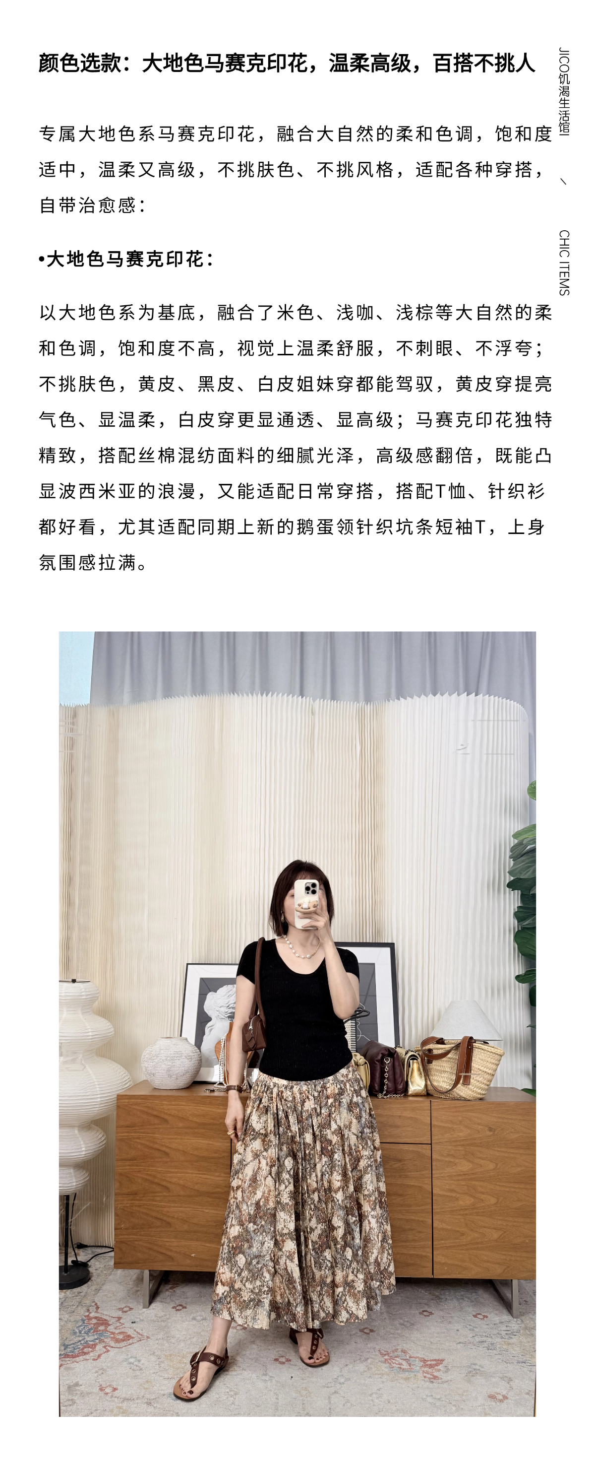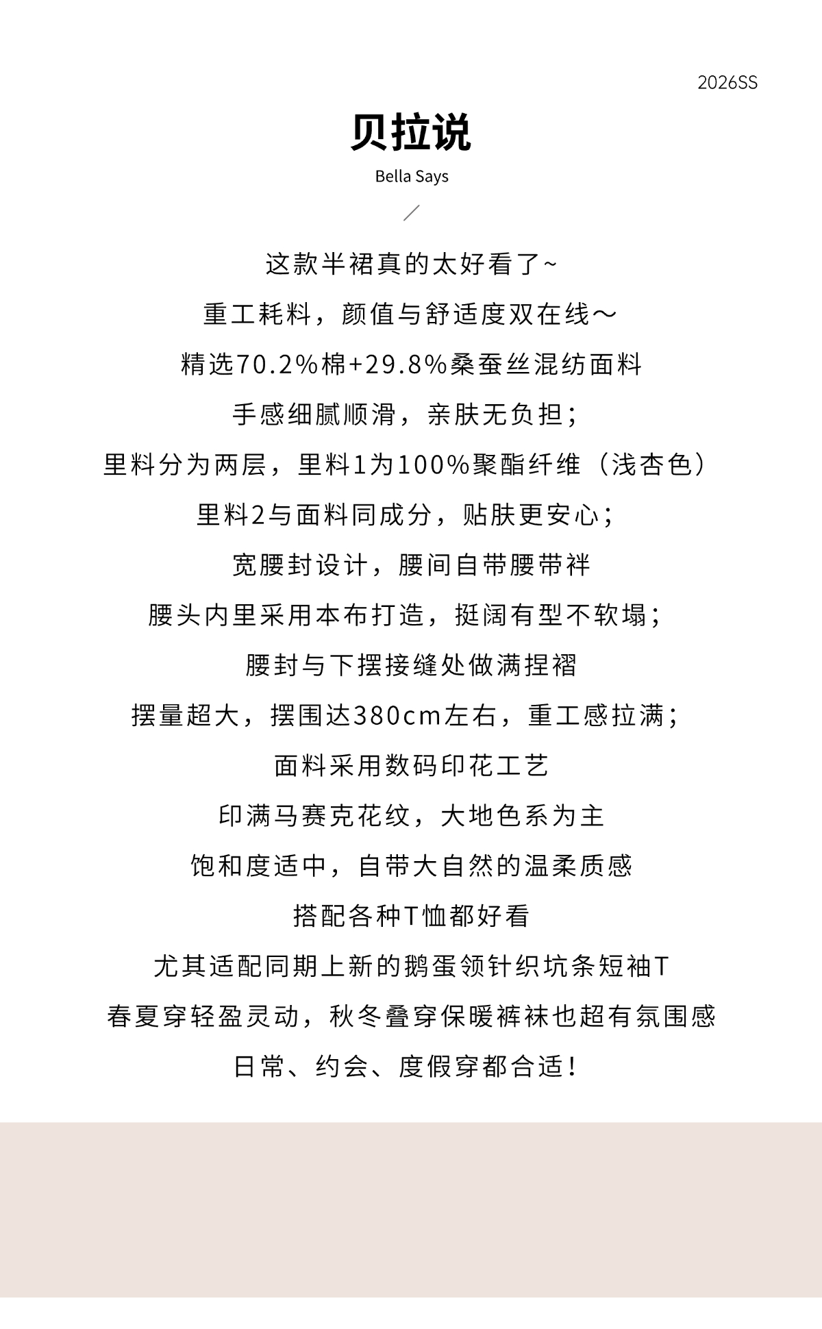 品位不趋同 波西米亚风丝棉半裙 大地色马赛克数码印花 重工超大摆亮 法式半裙