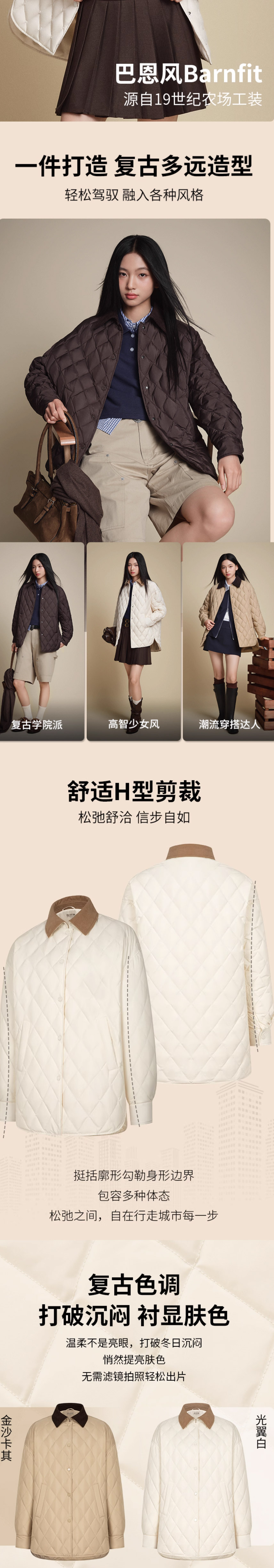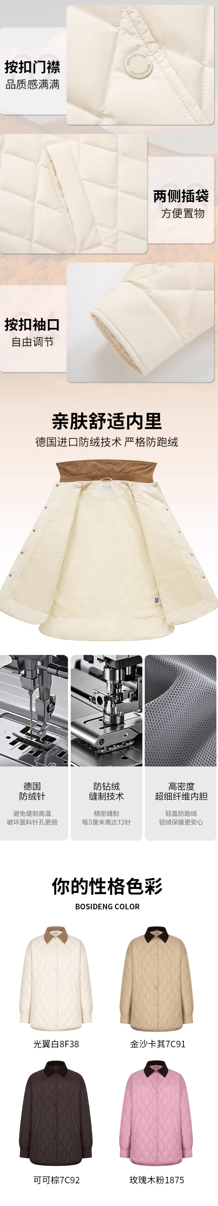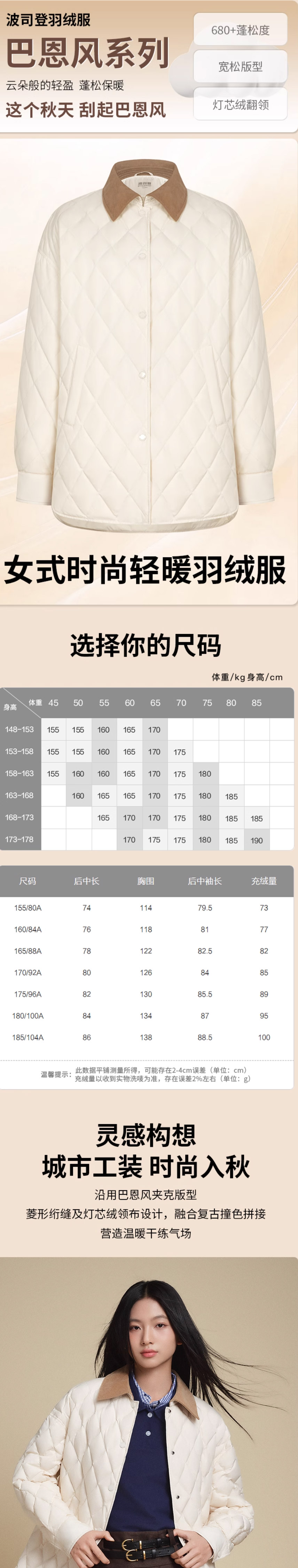 波司登轻薄羽绒服女2025新款时尚复古巴恩风衬衫领外套B250135334