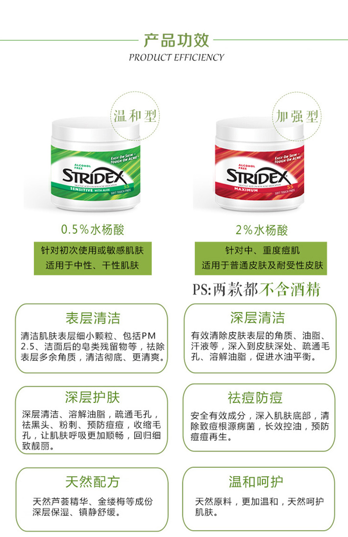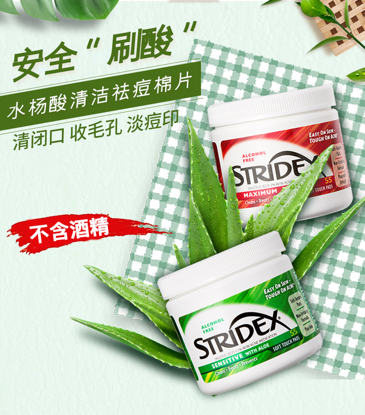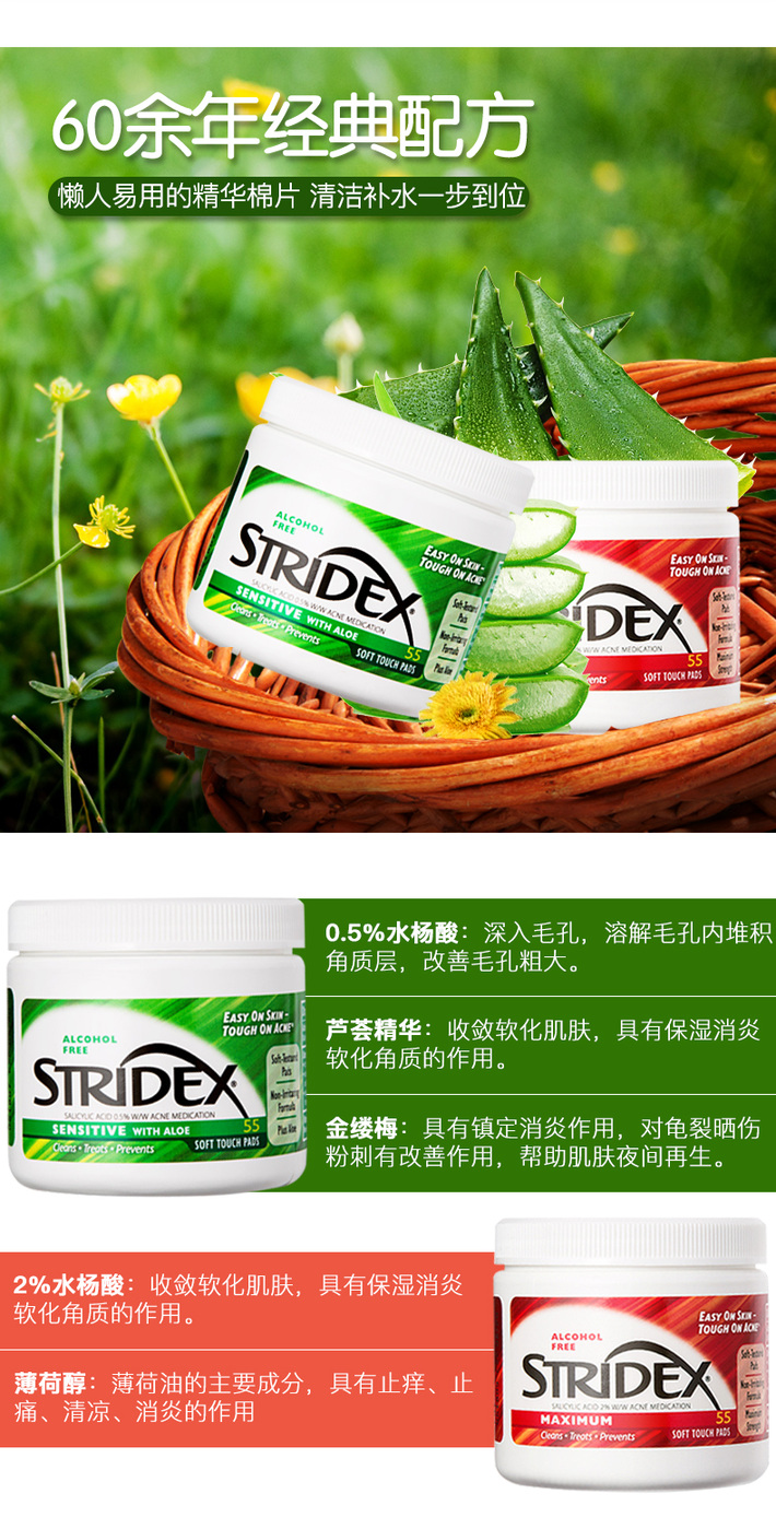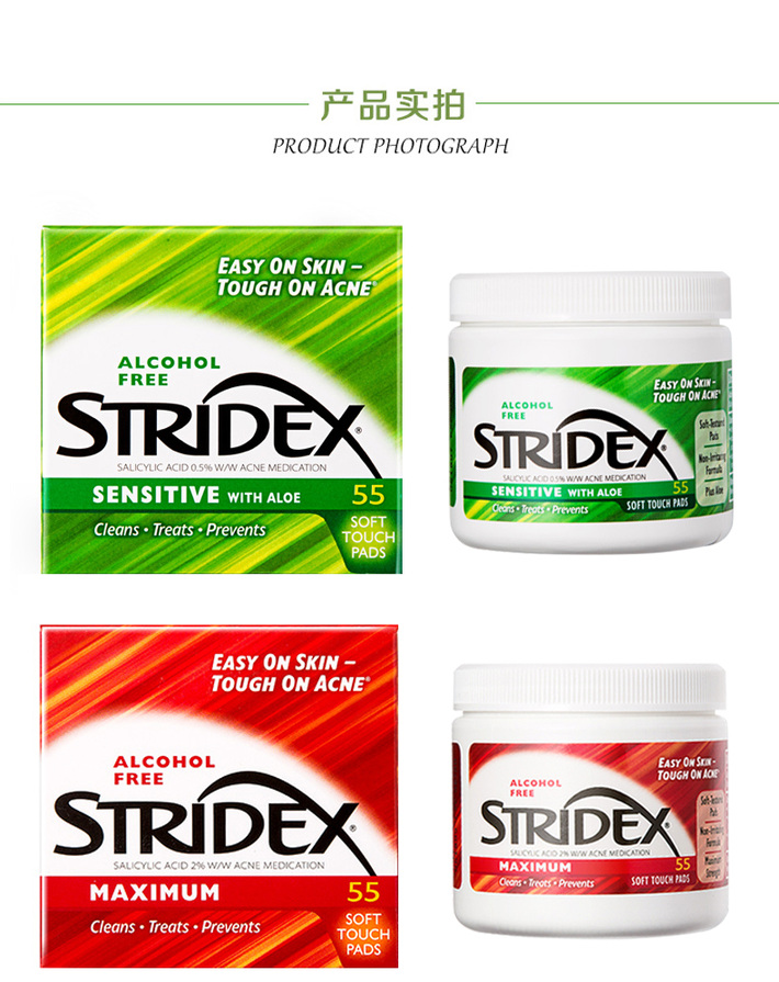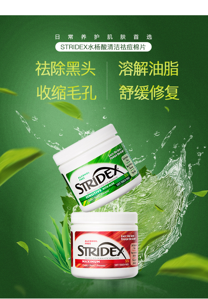美国Stridex水杨酸抗痘去闭口粉刺黑头刷酸清洁棉片淡化痘印修复 55片/盒