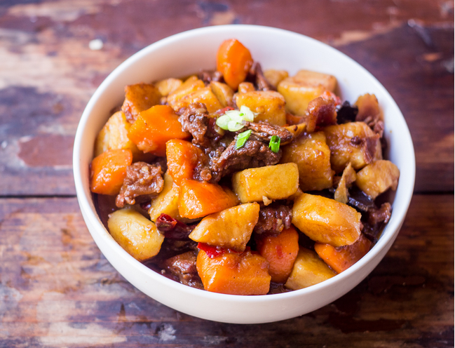 筷子可以轻松的扎透牛肉就可以了,捞出葱姜这些配料,放入煎好的土豆块,加少许盐调味,中小火炖10分钟!