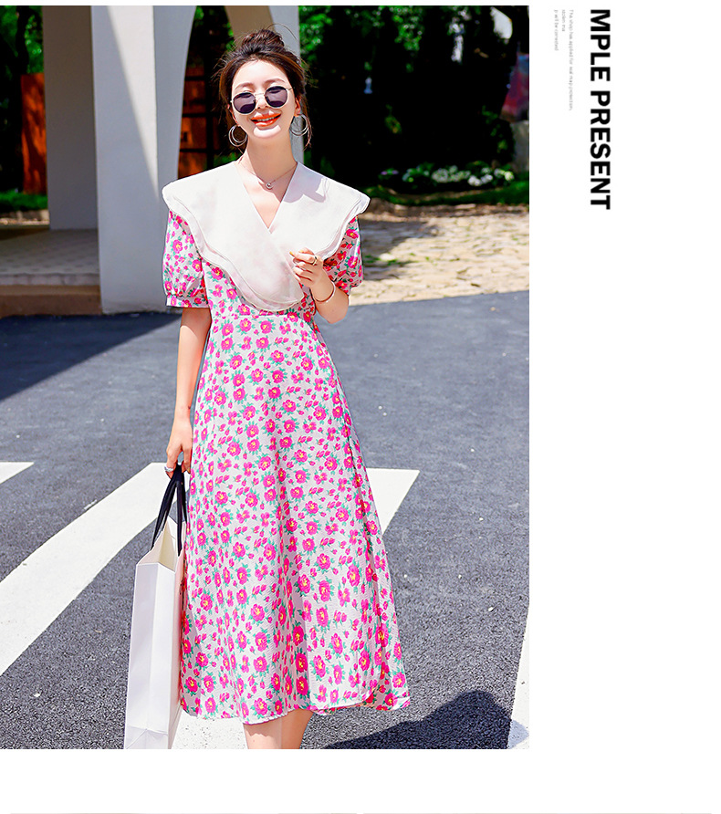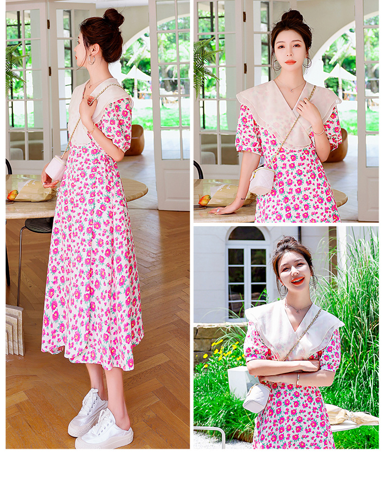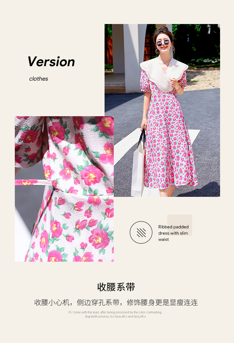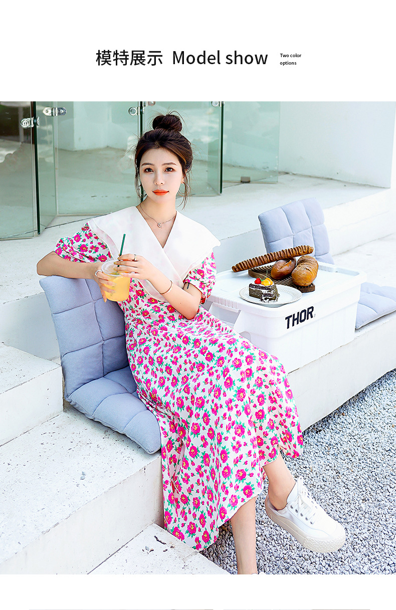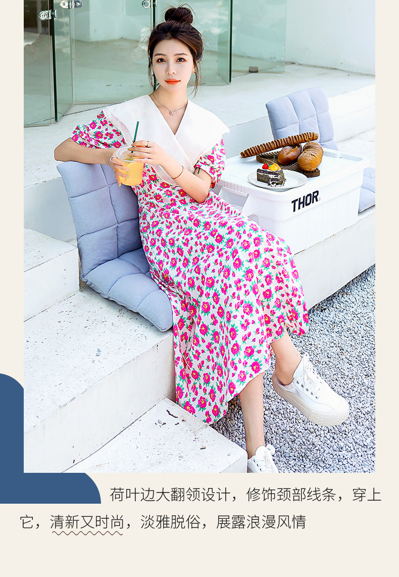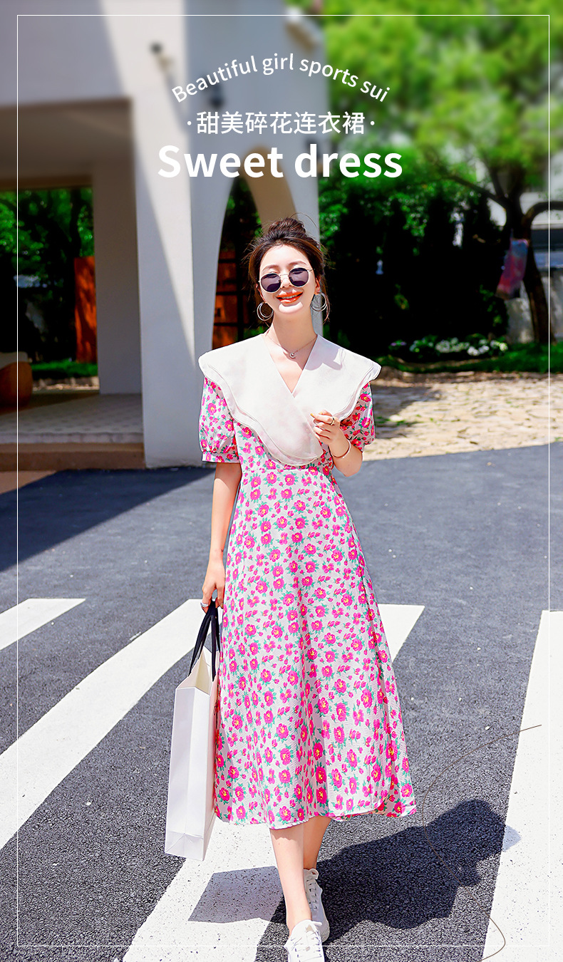夏装花裙子女海军领短袖碎花系带中长显瘦连衣裙HR-WX95769