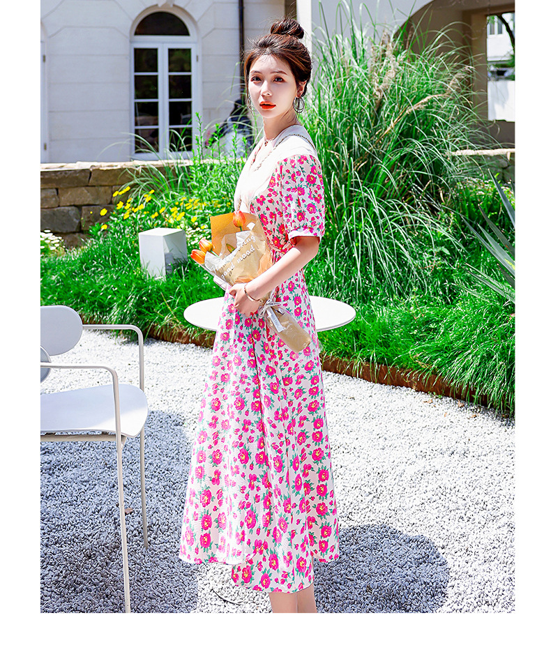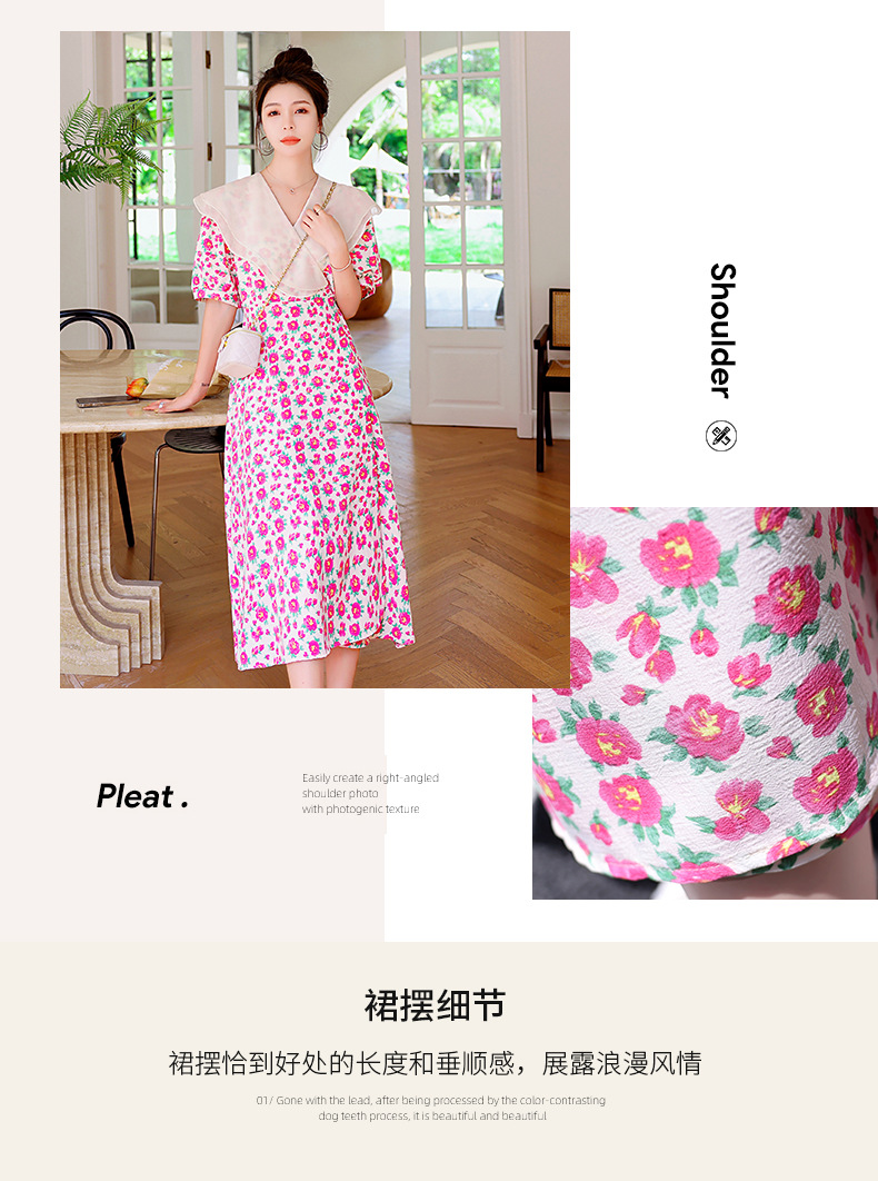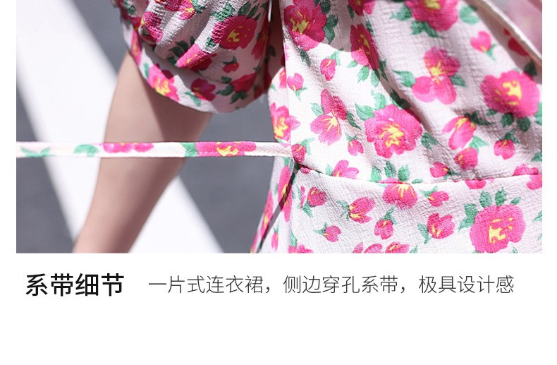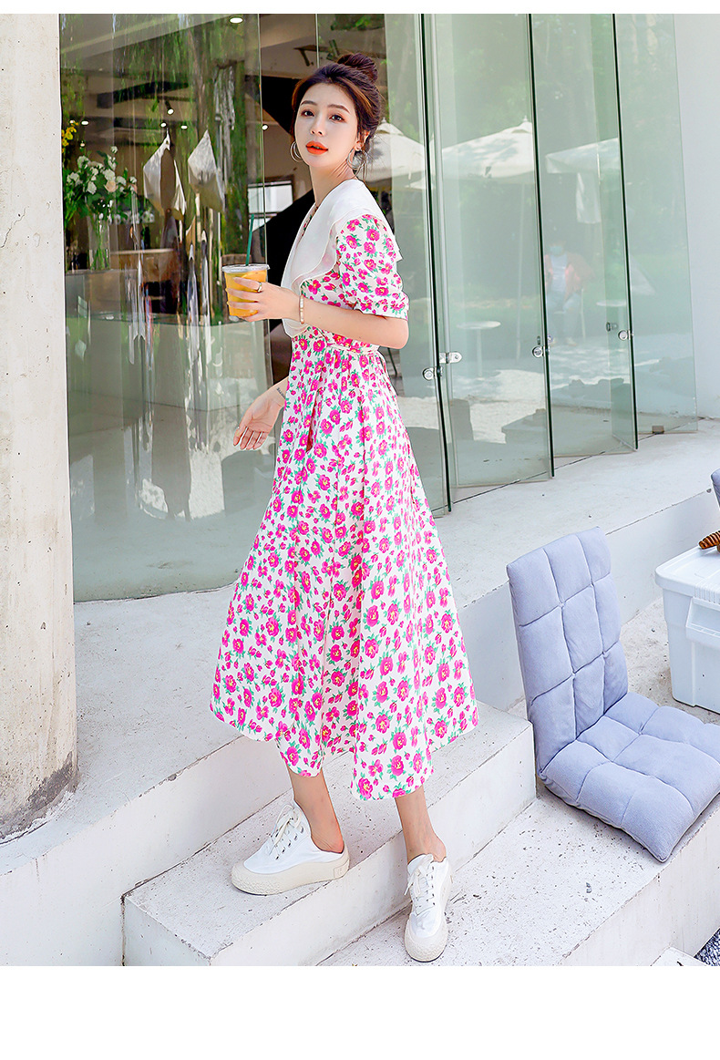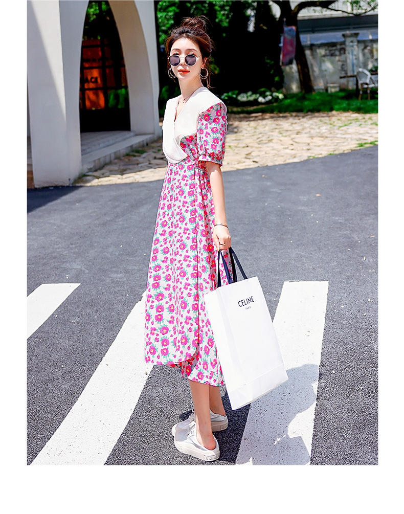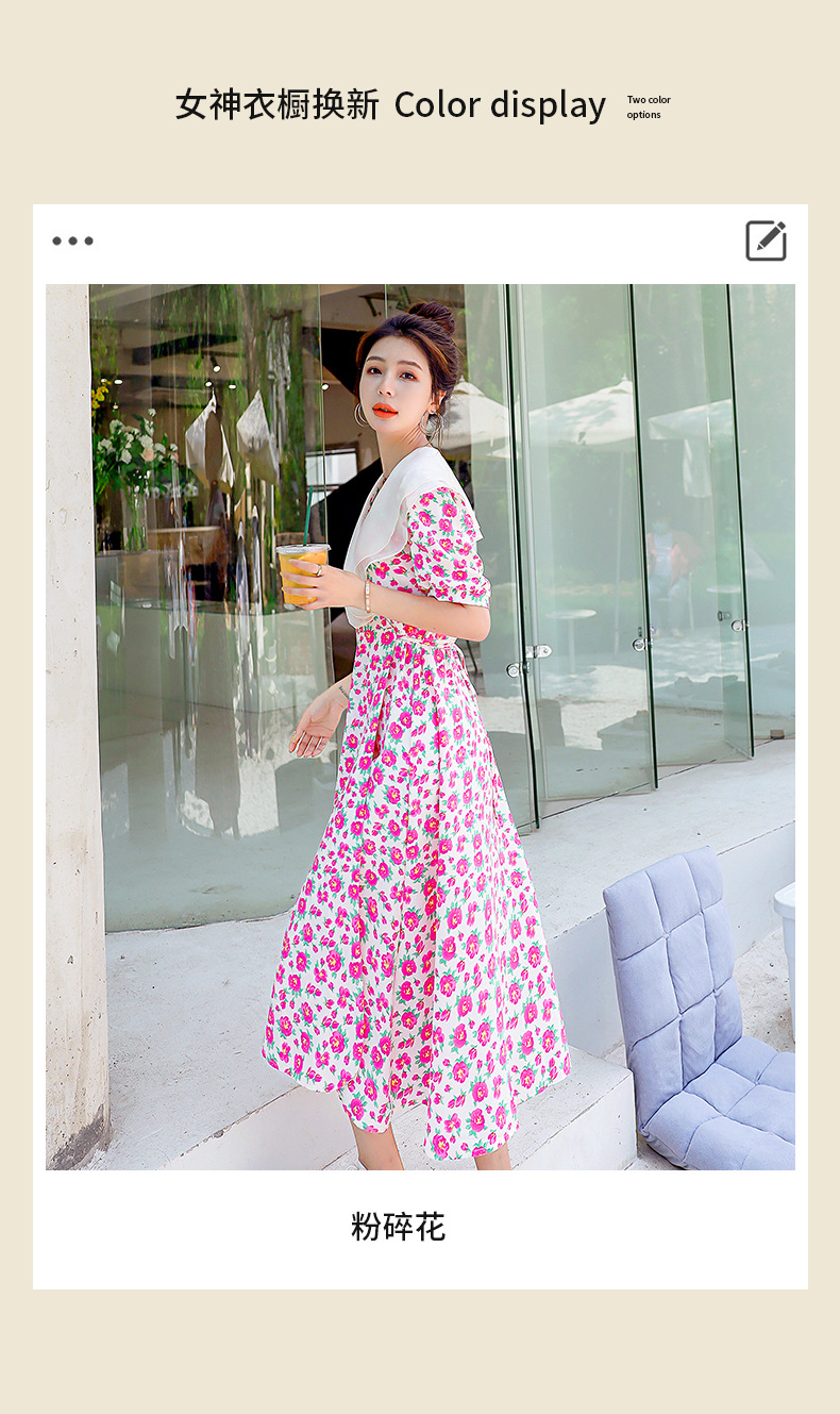 夏装花裙子女海军领短袖碎花系带中长显瘦连衣裙HR-WX95769