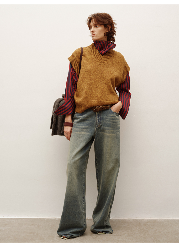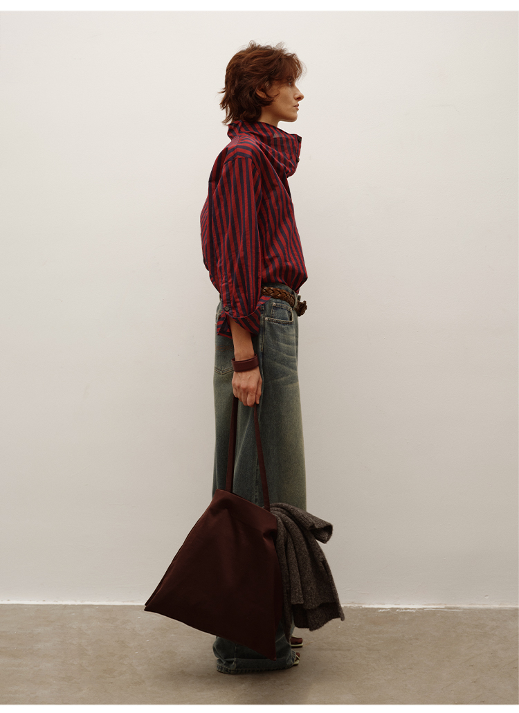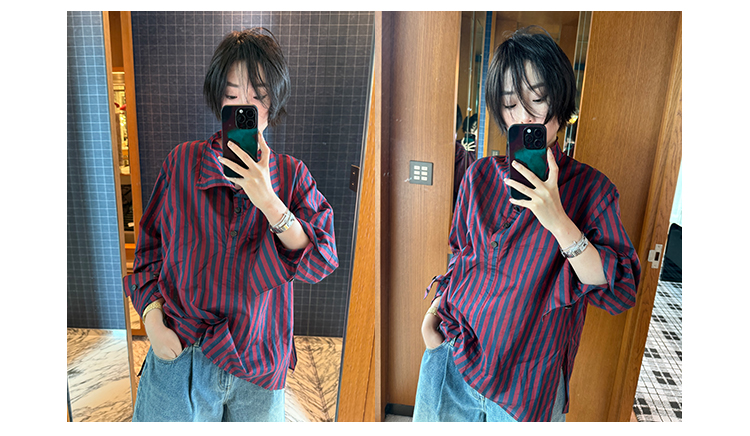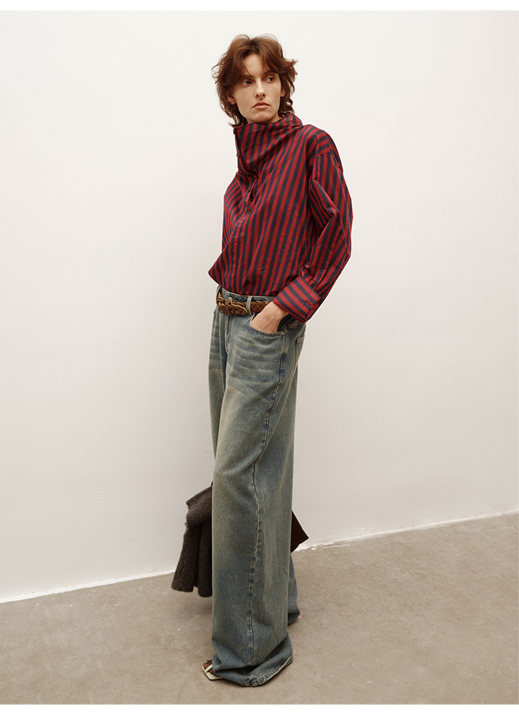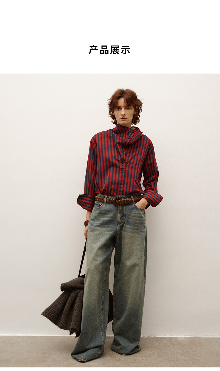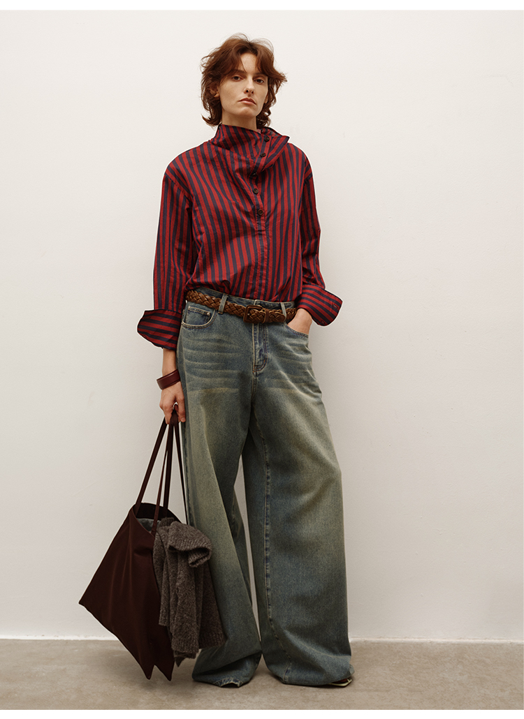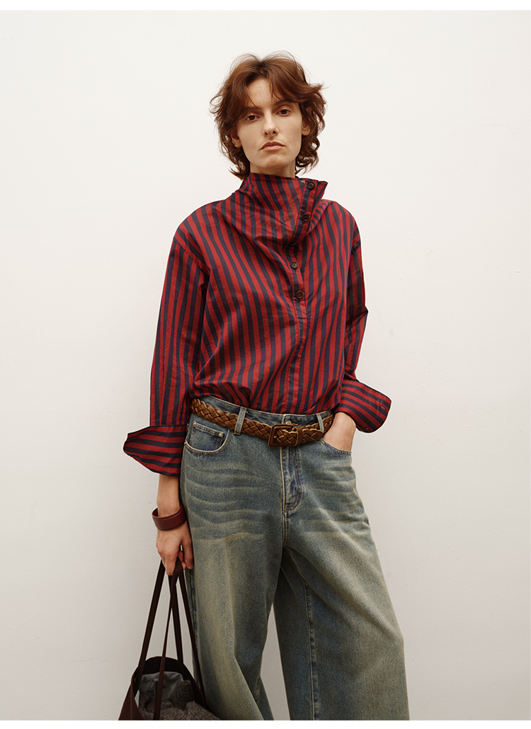HIDEMI 酒红拼深藏蓝色织条纹极简立领设计感廓形纽扣多穿衬衫上衣