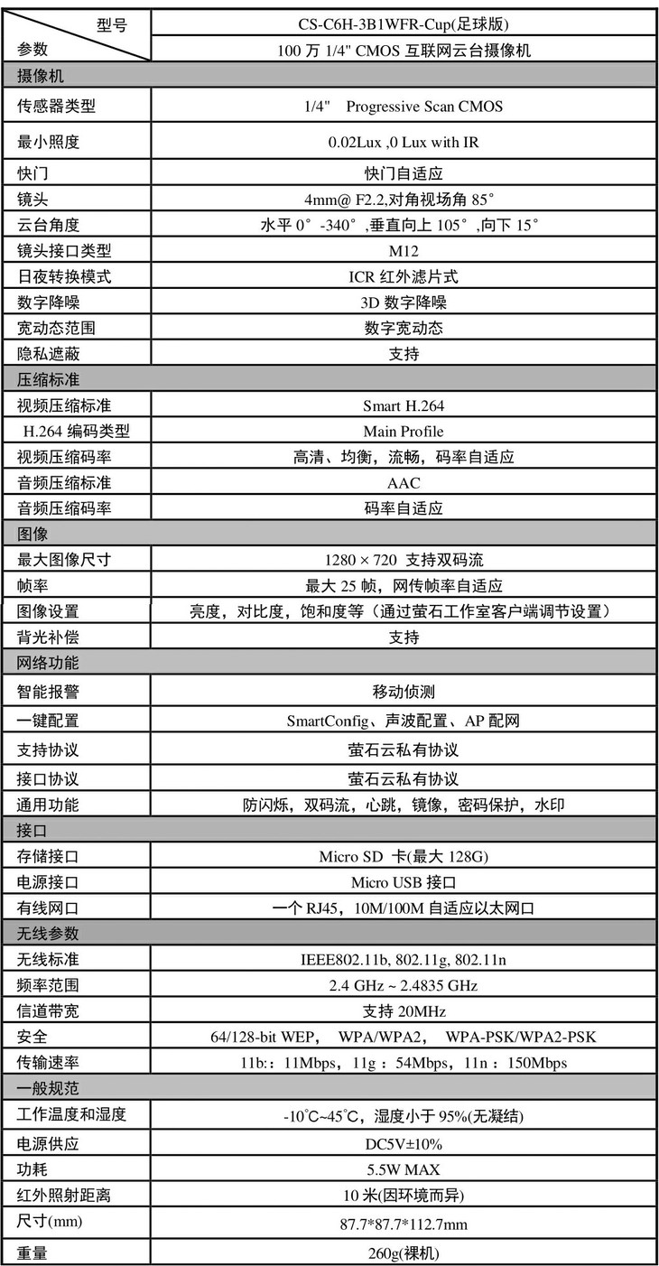 海康威视 萤石 C6H足球版 无线高清1080P摄像头