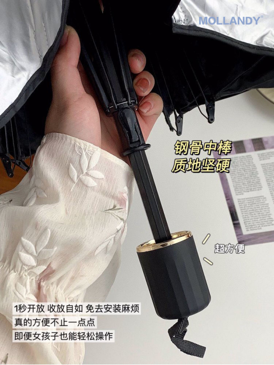 ✨独特的钛银涂层伞面,不仅时尚炫酷,更能有效反射阳光,实现UPF≥50+的卓越防晒性能,让你的爱车远离烈日的伤害!