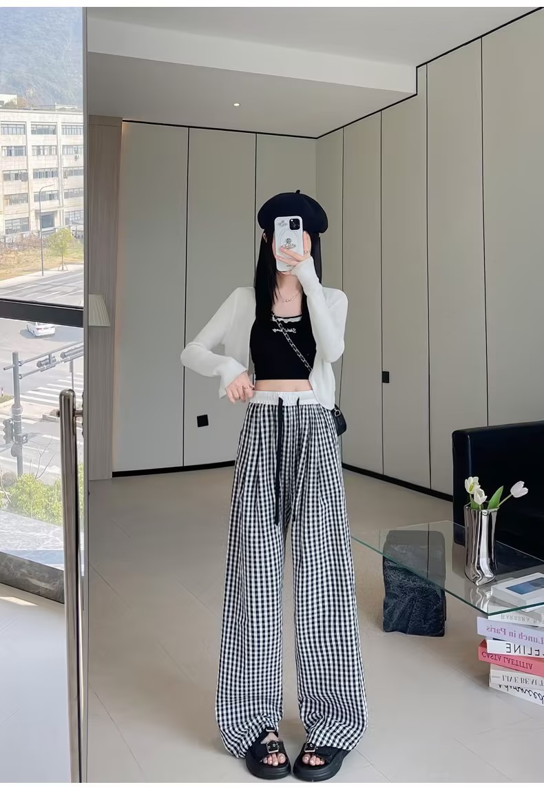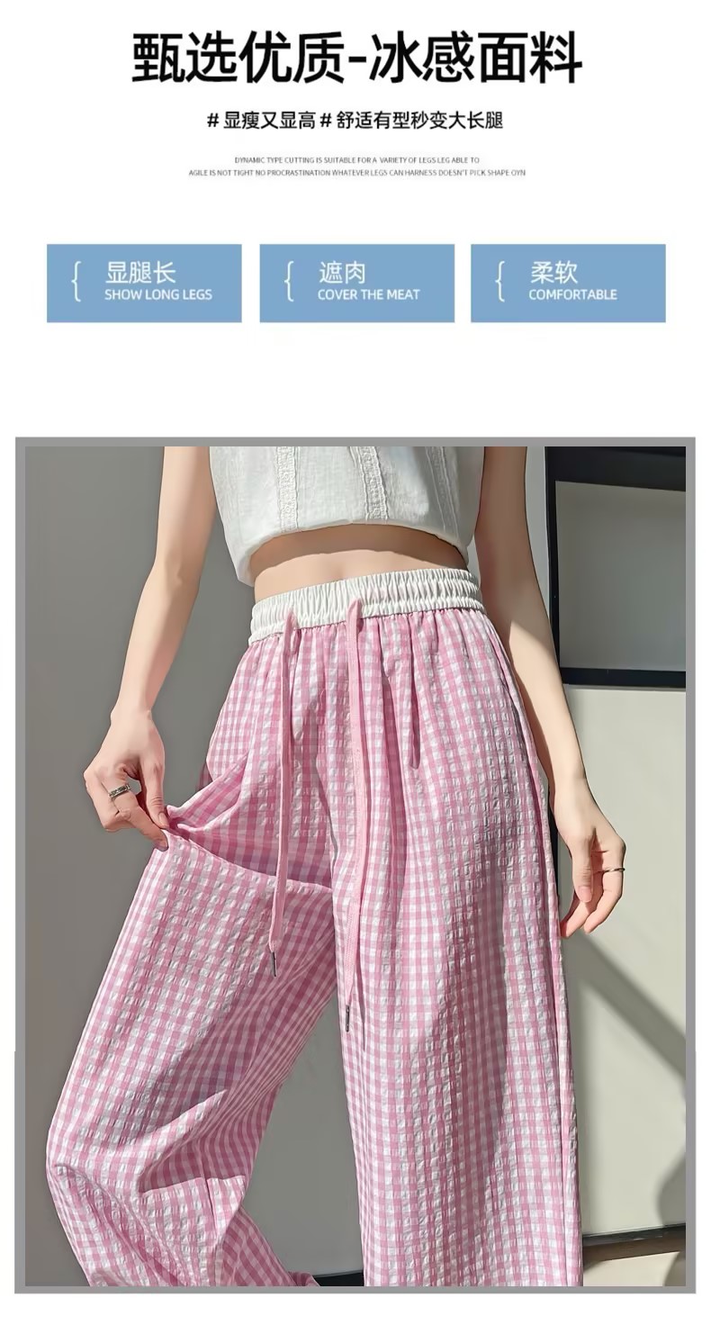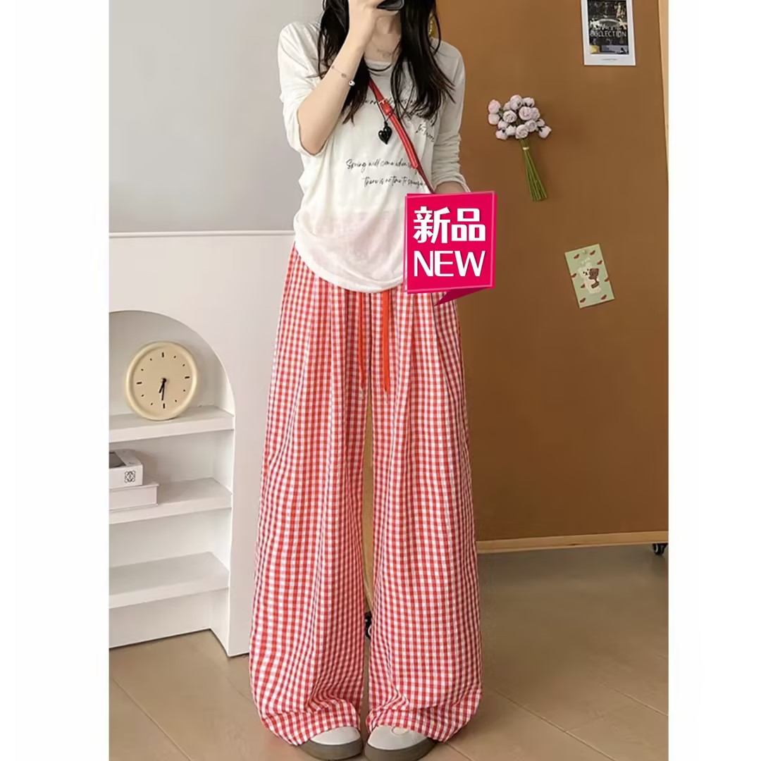 YW买手优选多巴胺撞色格子裤慵懒风薄款高腰抽绳阔腿裤170546532(预售3-5天发货)