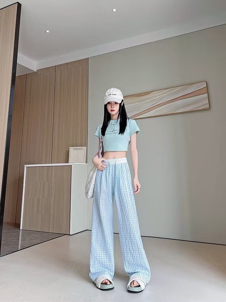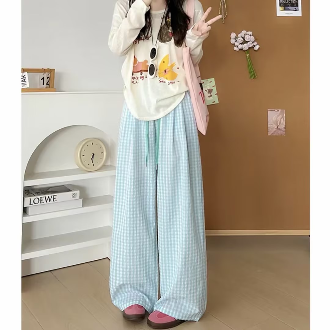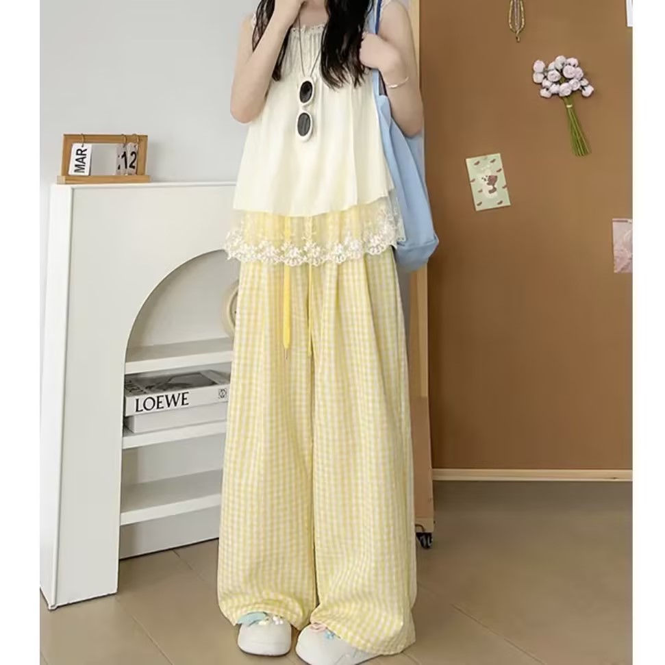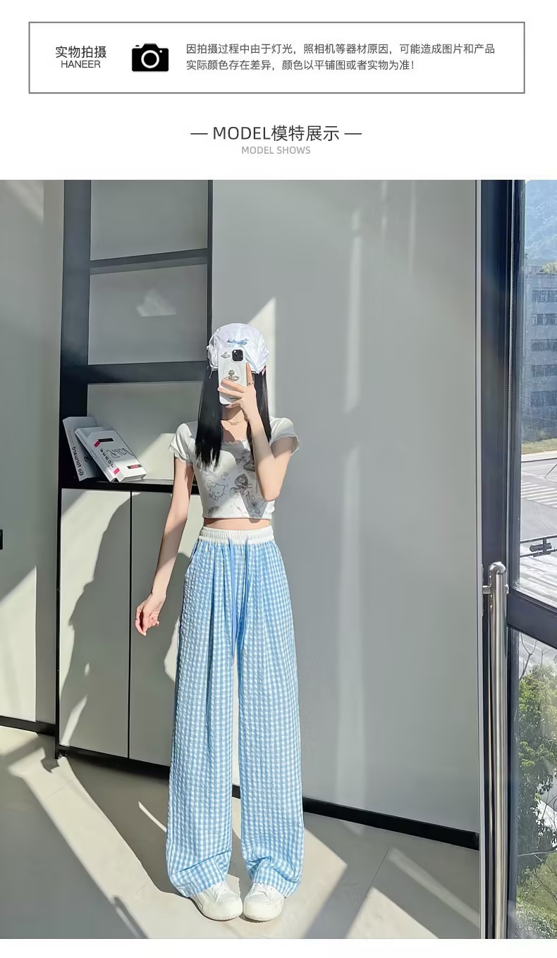 YW买手优选多巴胺撞色格子裤慵懒风薄款高腰抽绳阔腿裤170546532(预售3-5天发货)