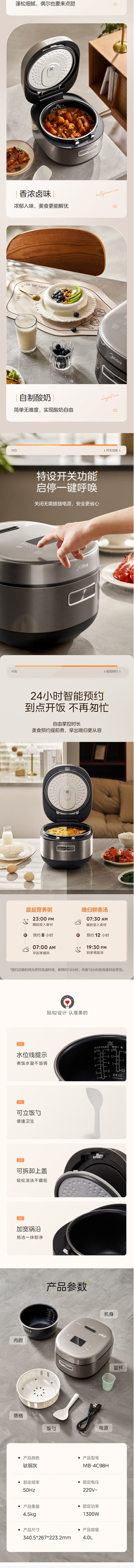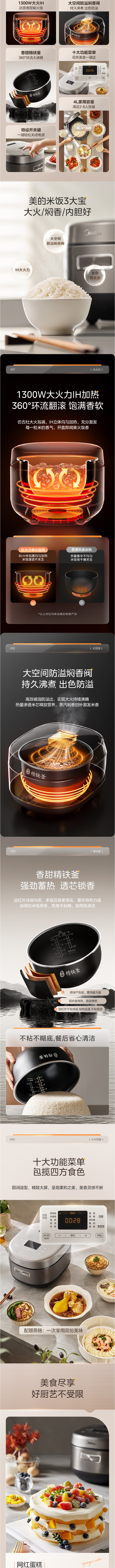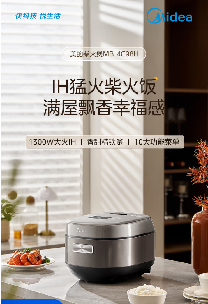 美的(510558)Midea)商场同款电饭煲 IH电磁加热 家用4L电饭锅 2-8人大容量 精铁釜内胆 柴火包锅 煮饭锅 MB-4C98H