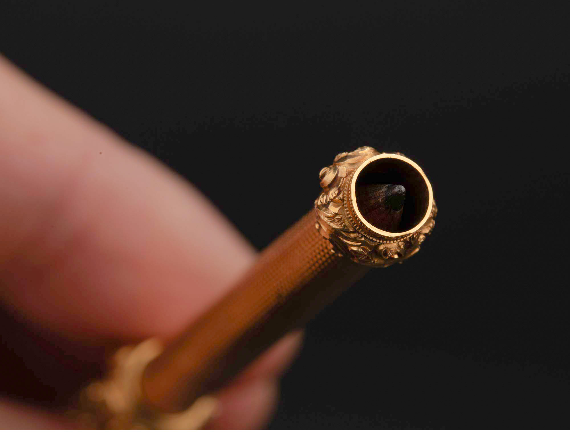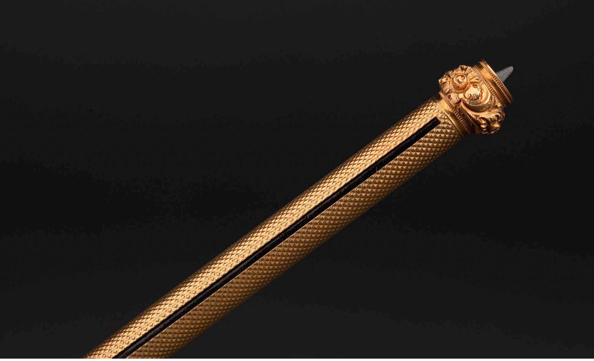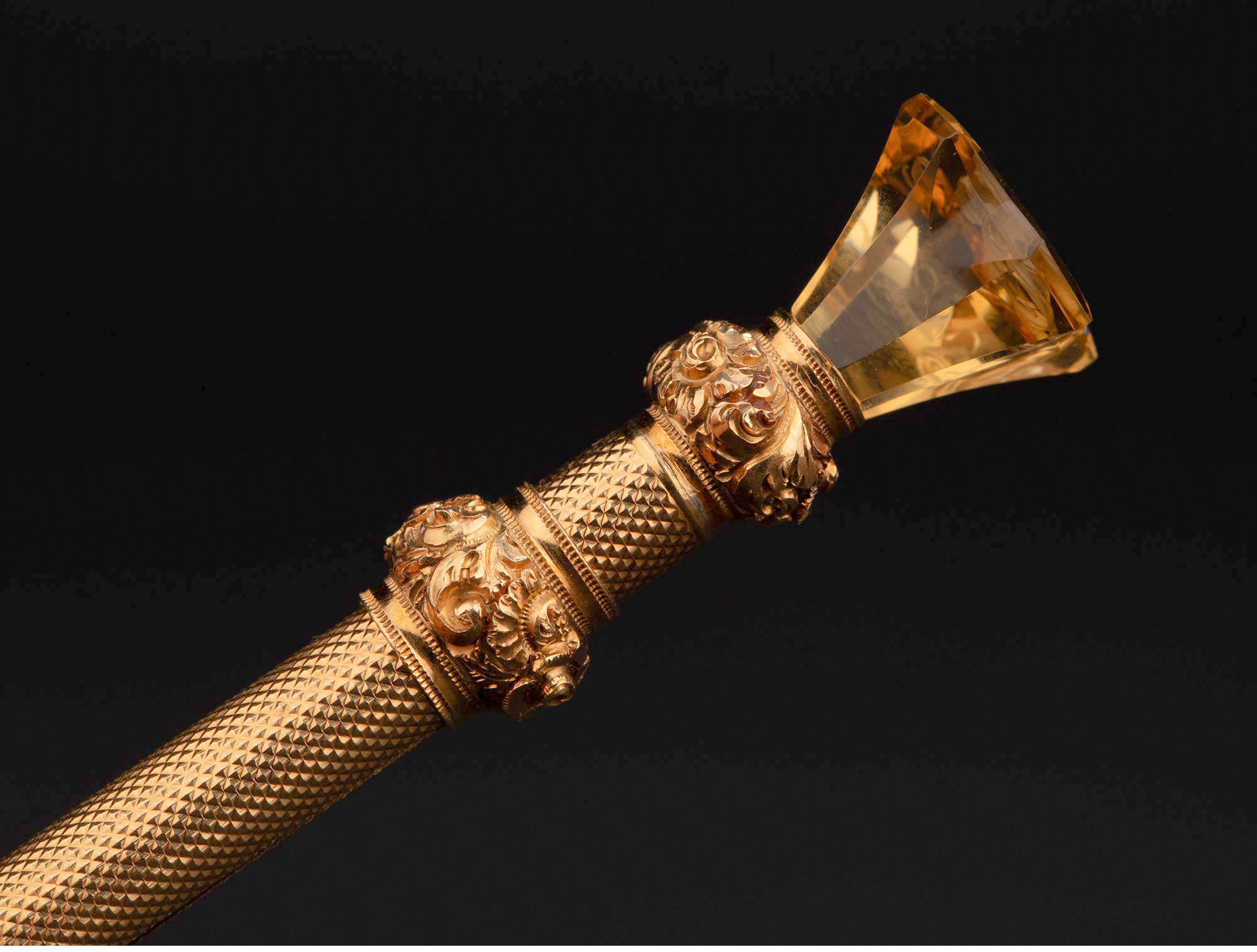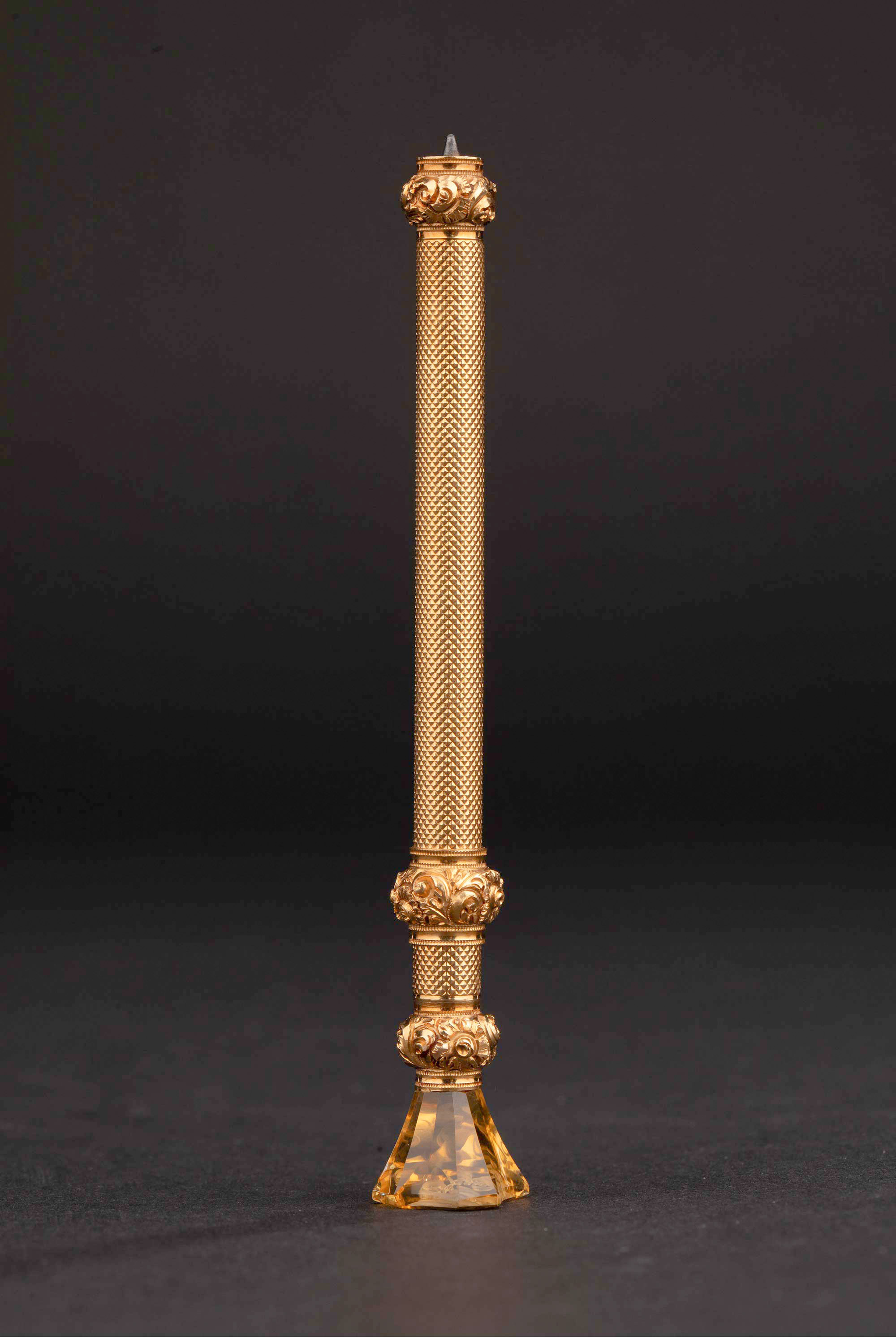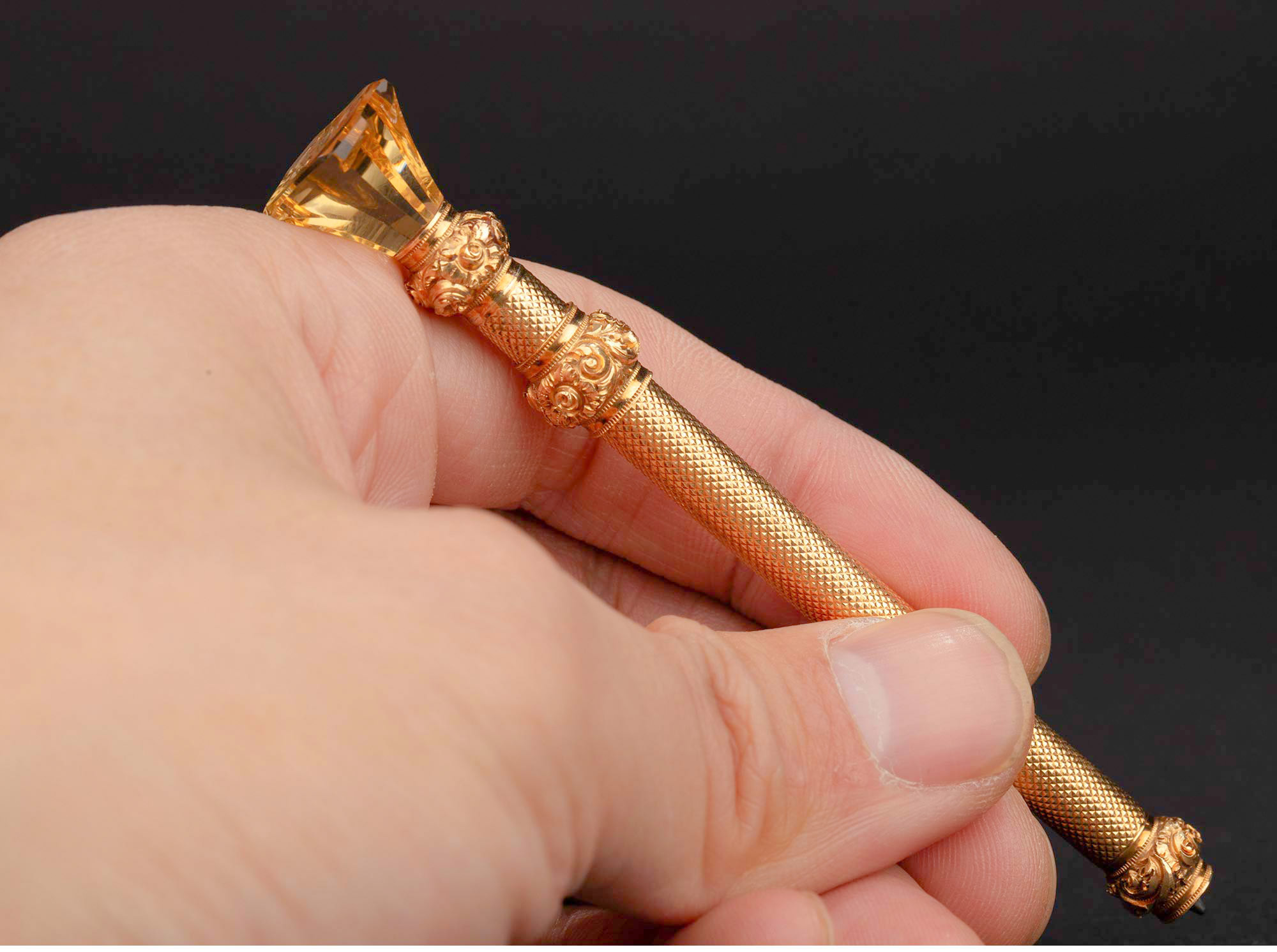1880-1890年代英国出品黄水晶火漆印章装饰菱格纹黄金精雕笔杆