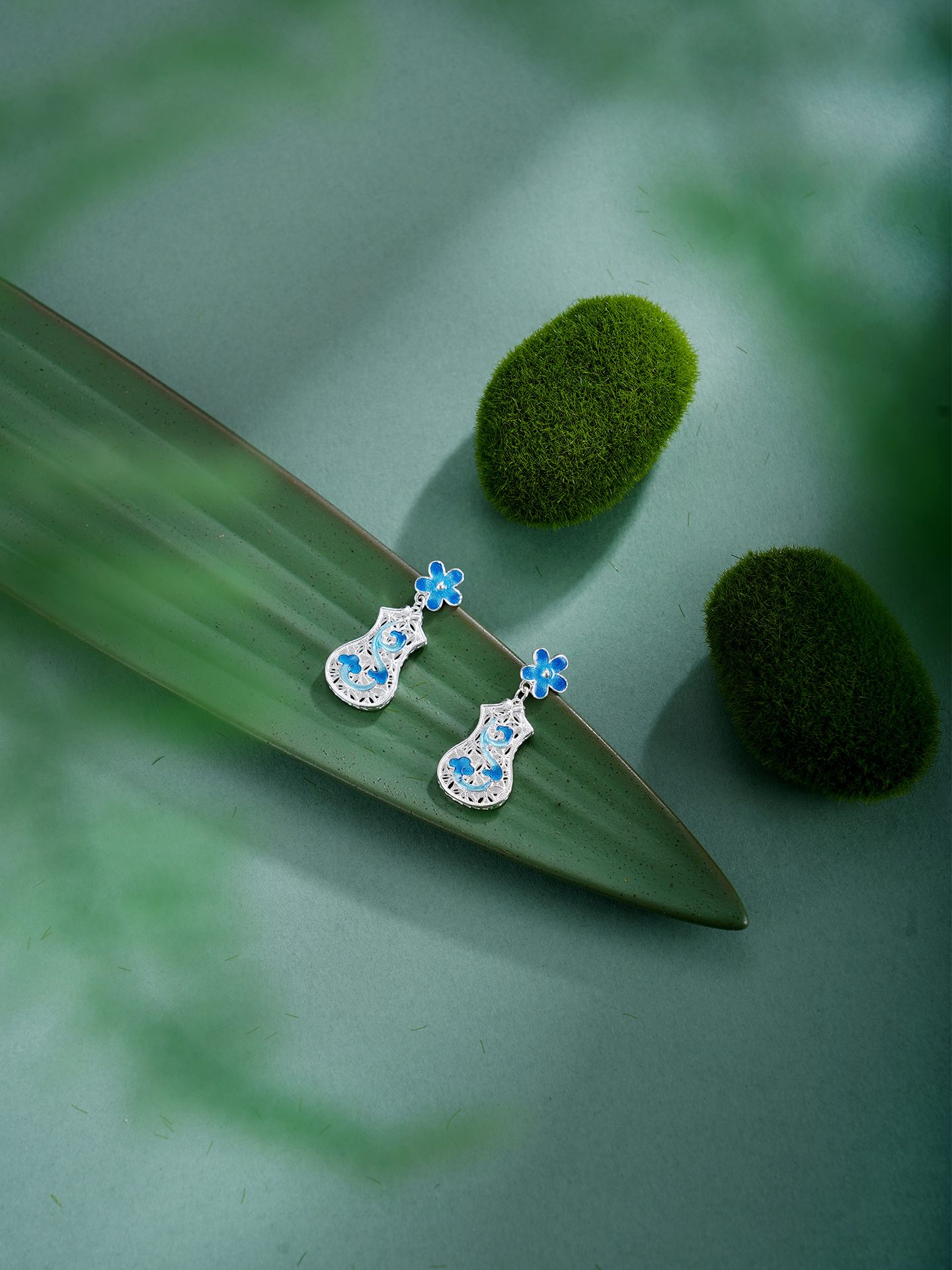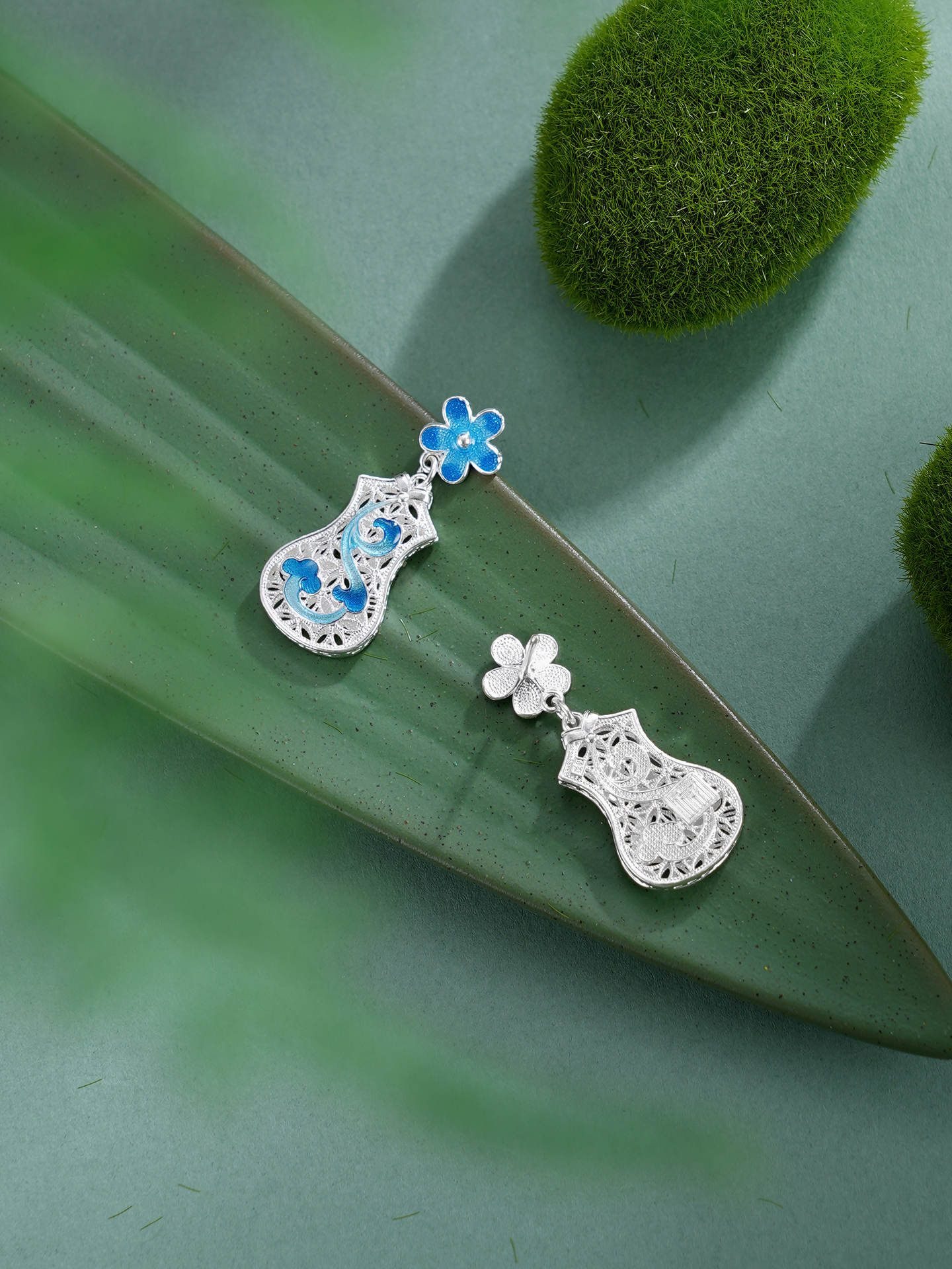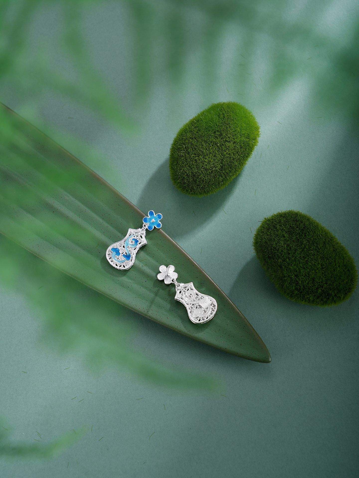 【寓意】:耳饰采非遗银花丝打造,银丝勾勒旗袍轮廓,珐琅彩绘添清冷气质;花朵寄寓生命绚烂,祥云承载吉祥期许,二者点缀其上,寄予佩戴者一生优雅如诗,岁岁长安。