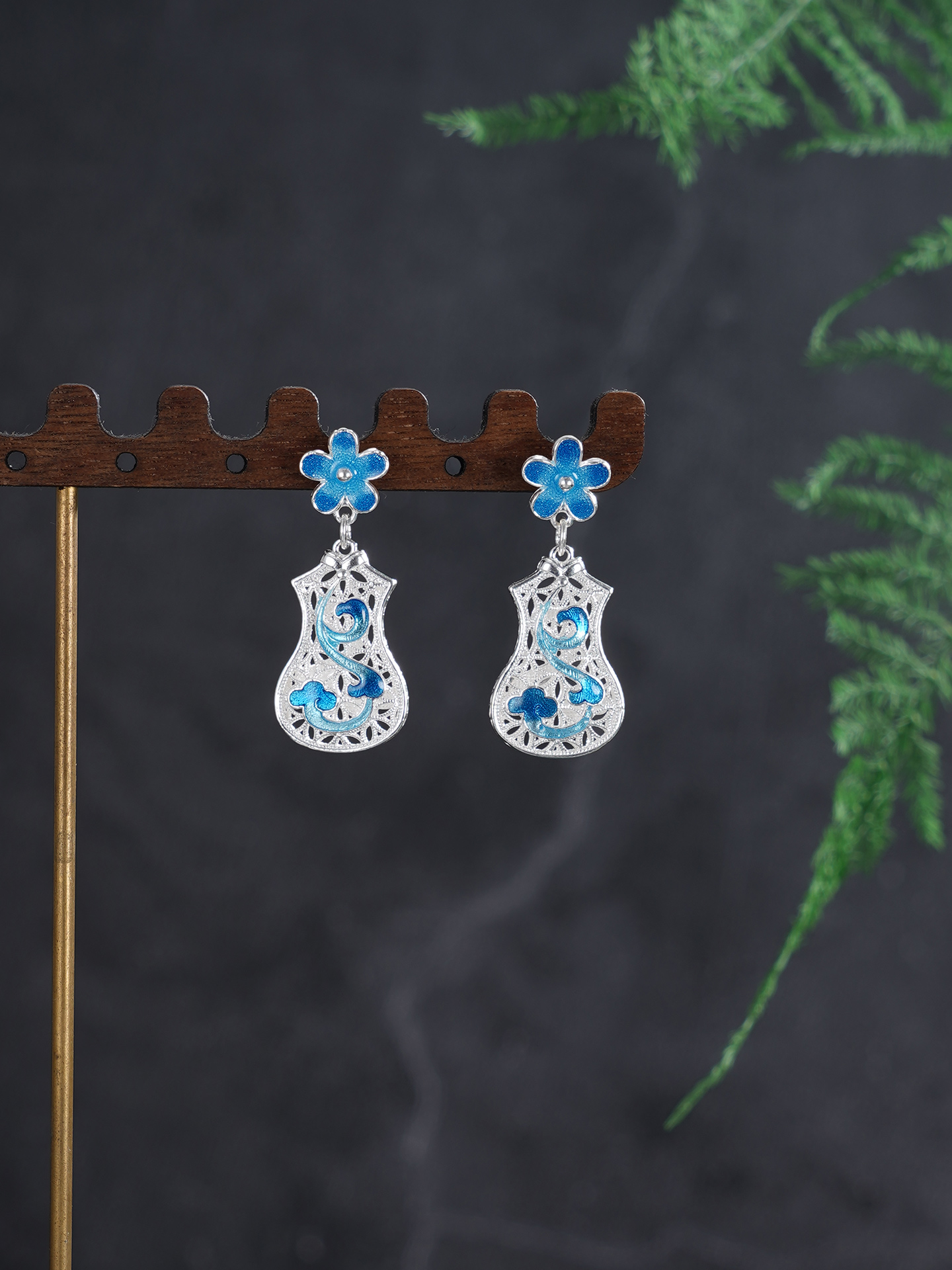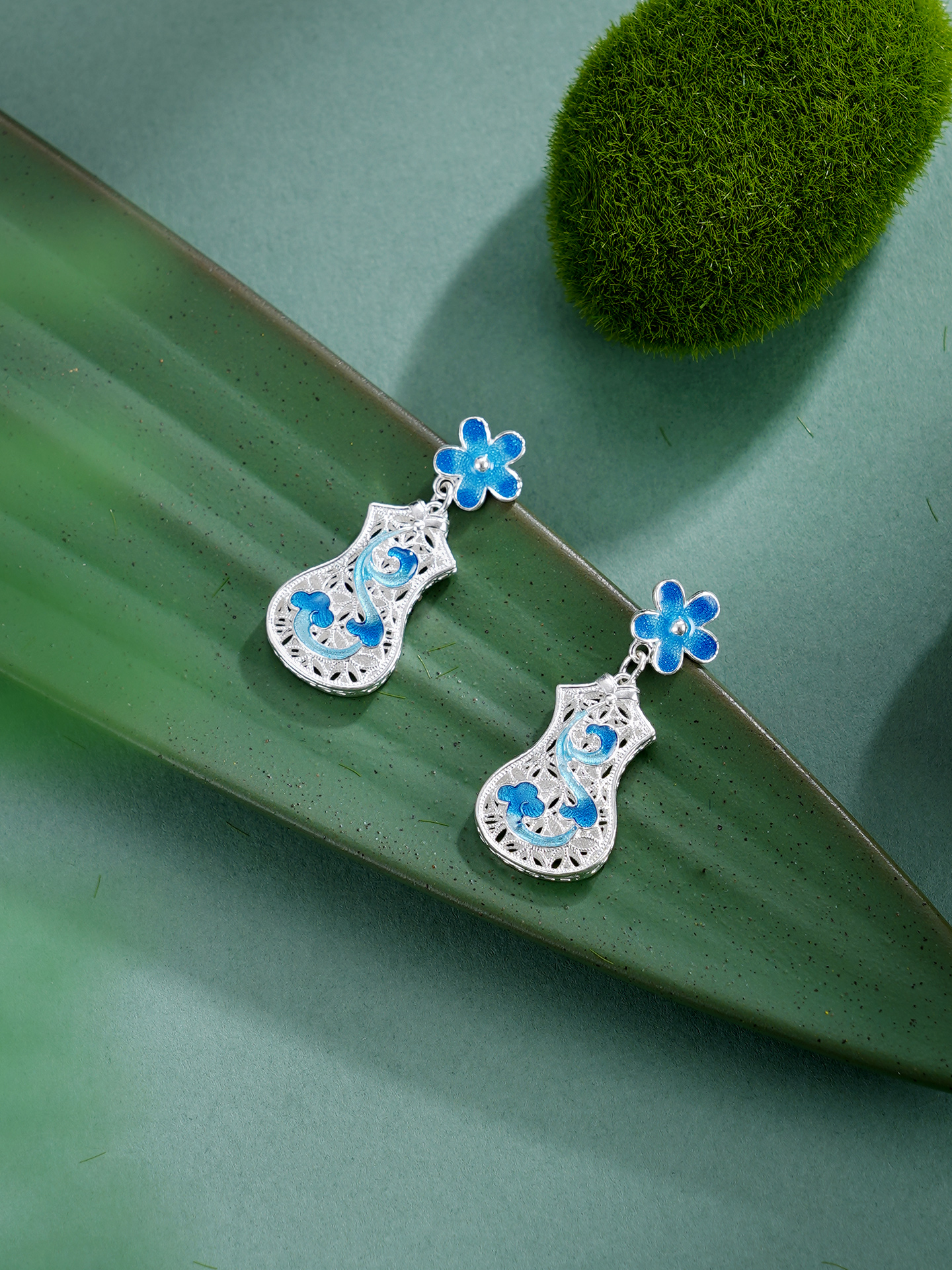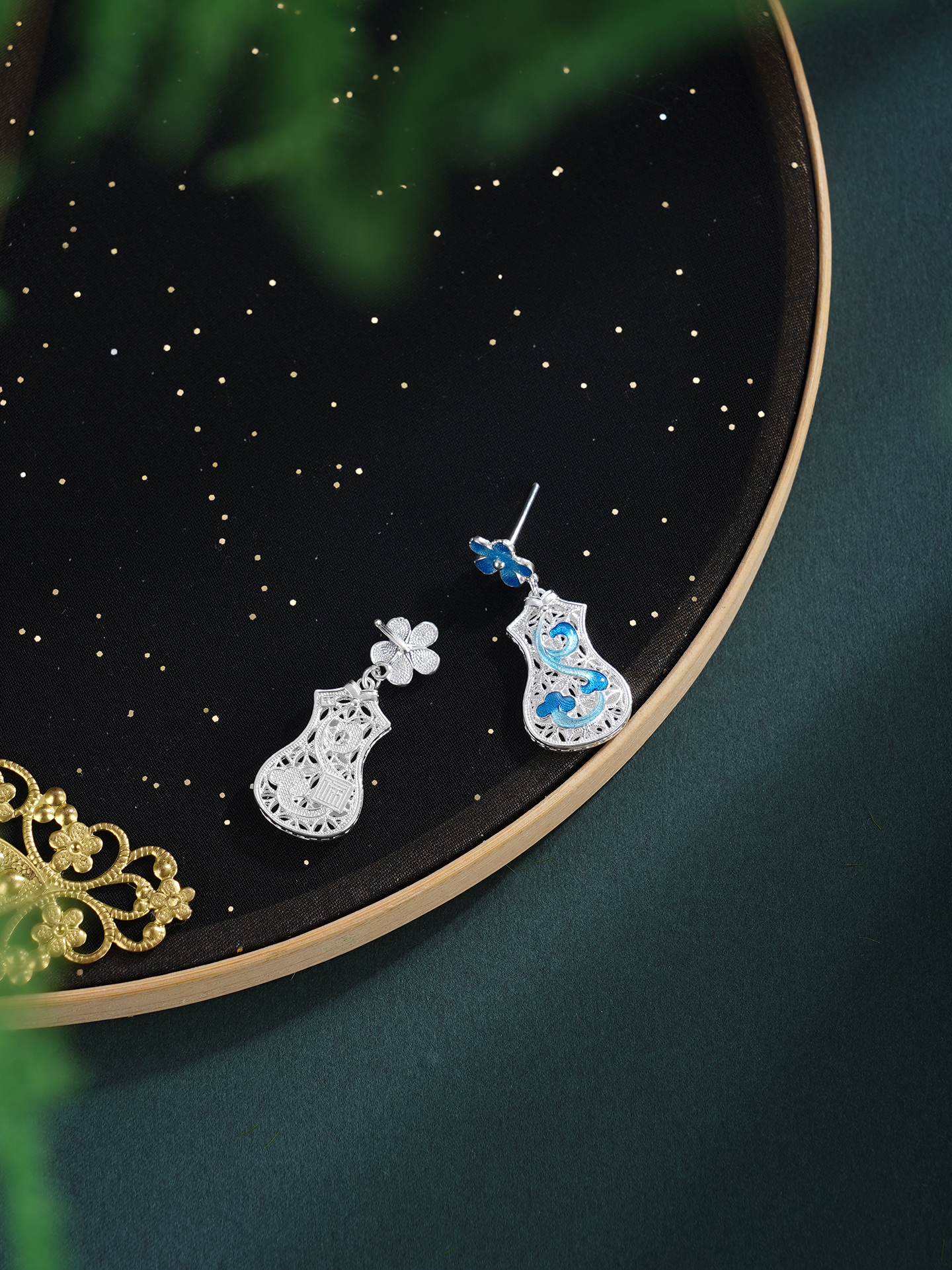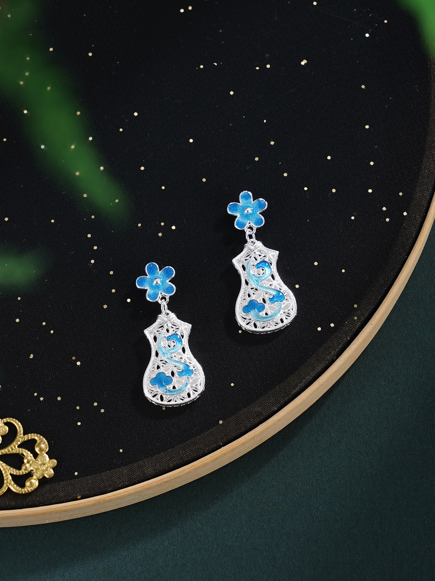 【寓意】:耳饰采非遗银花丝打造,银丝勾勒旗袍轮廓,珐琅彩绘添清冷气质;花朵寄寓生命绚烂,祥云承载吉祥期许,二者点缀其上,寄予佩戴者一生优雅如诗,岁岁长安。