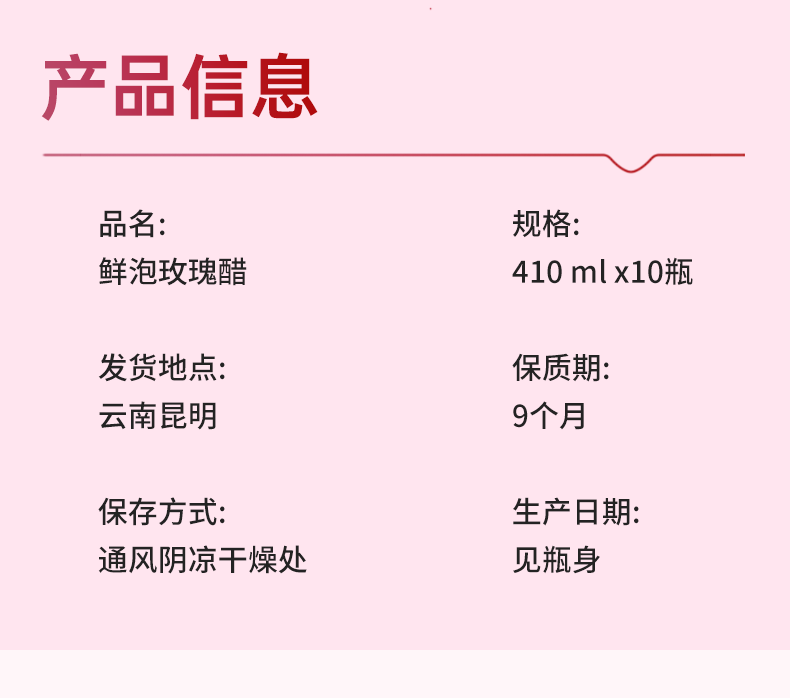 【配料表】纯净水、重瓣玫瑰、冰糖、荞麦醋、食品添加剂(柠檬酸、维生素C、山梨酸钾)