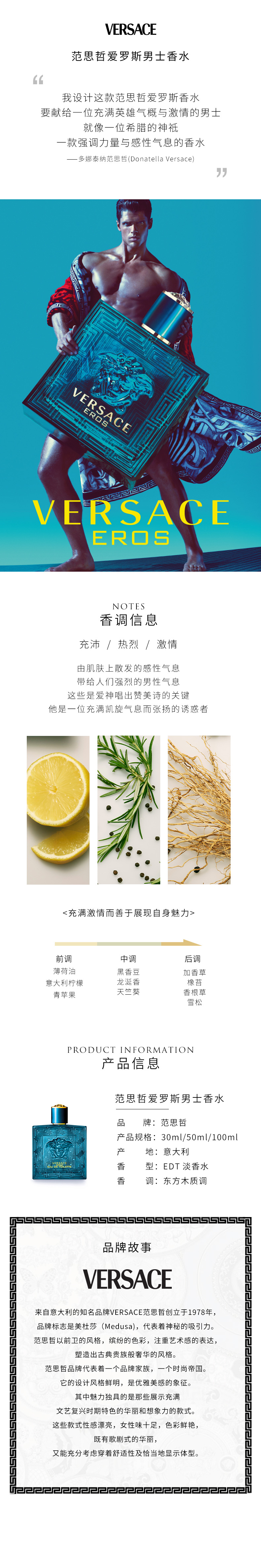 【官方正品】Versace/范思哲爱罗斯经典男士淡香水爱神之水东方木质调 30ml/50ml/100ml