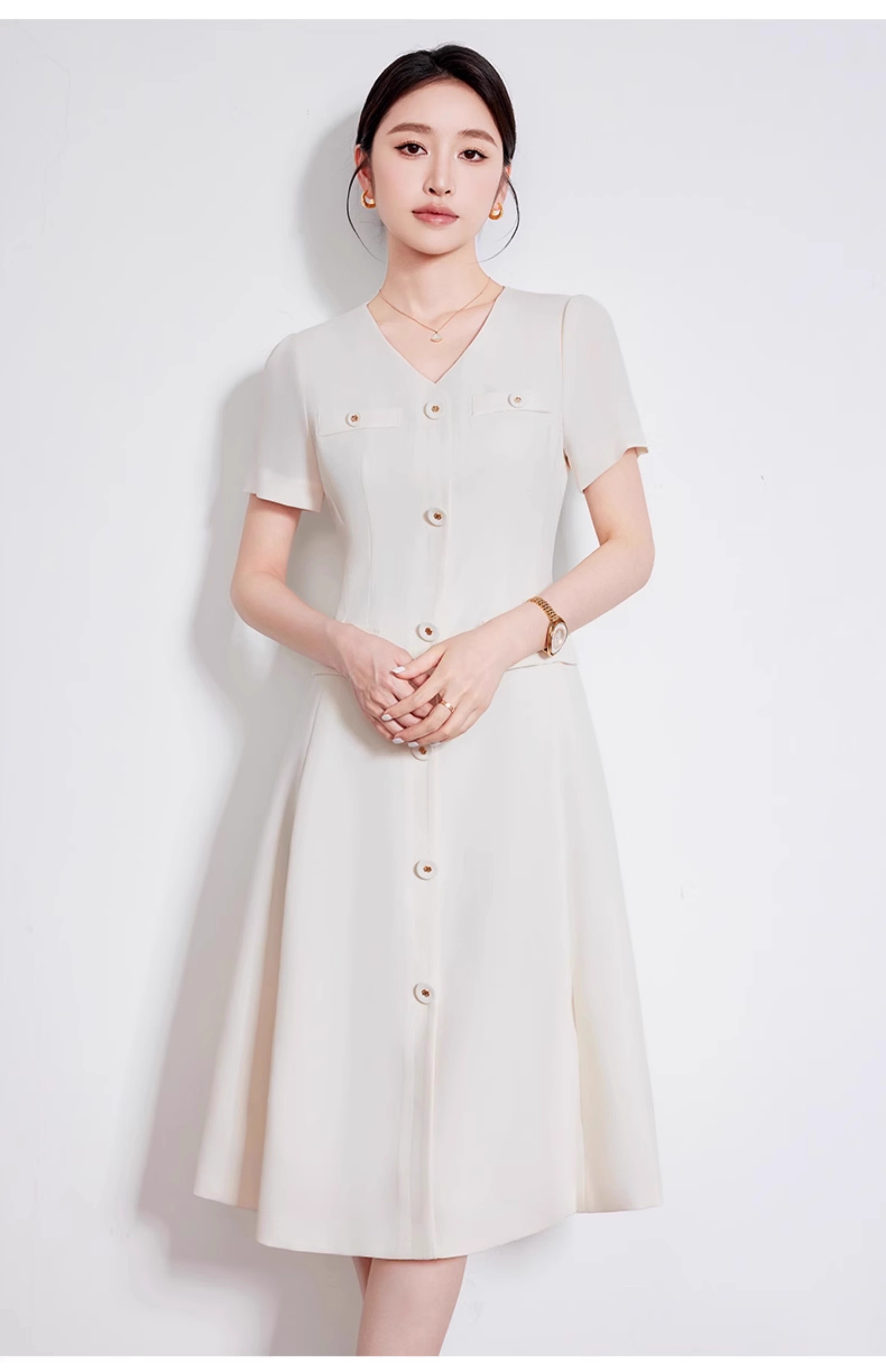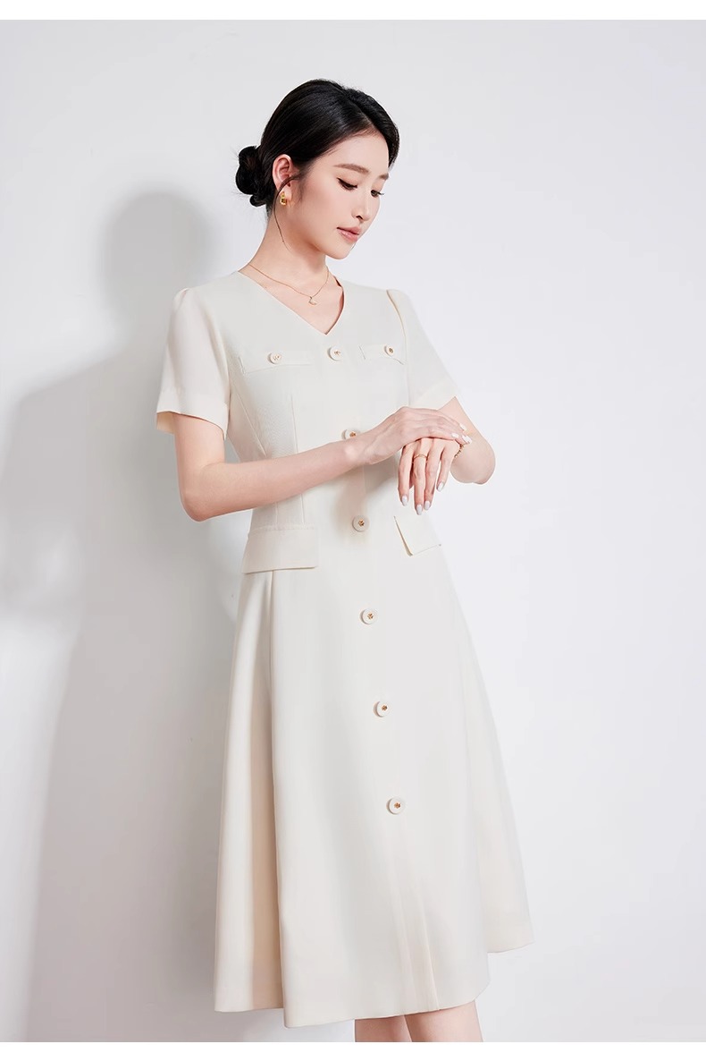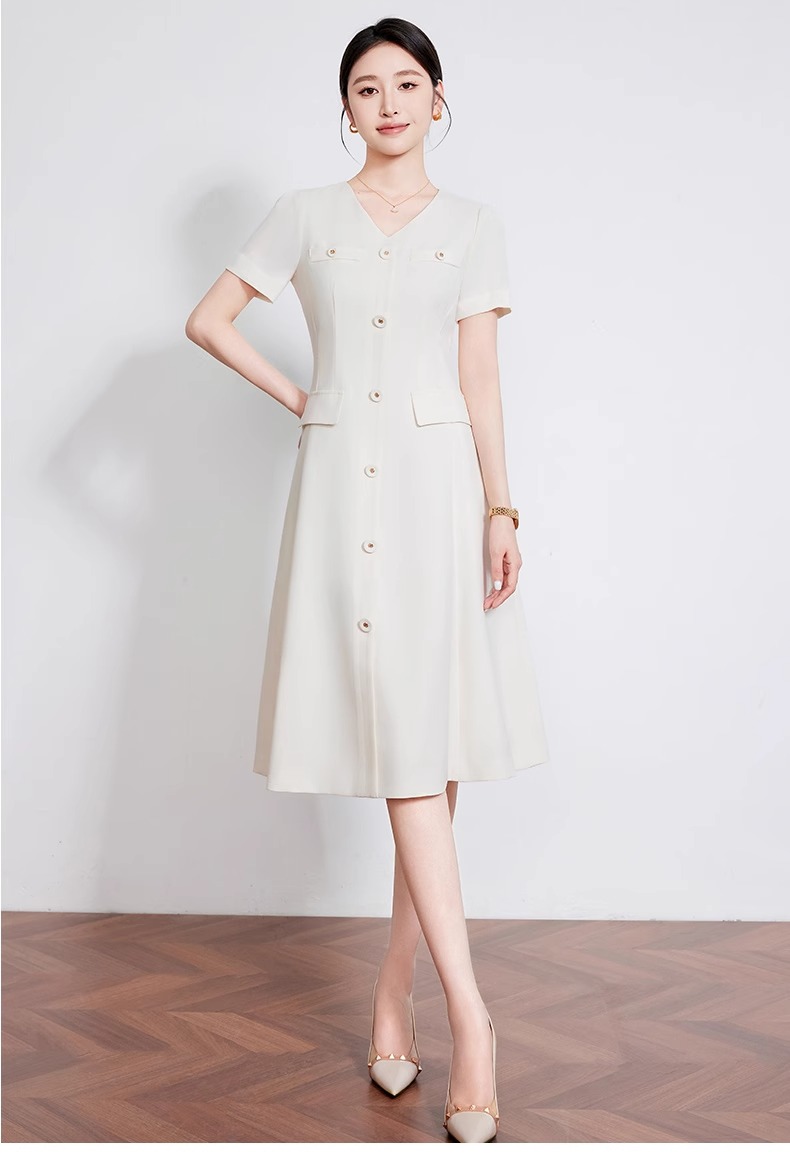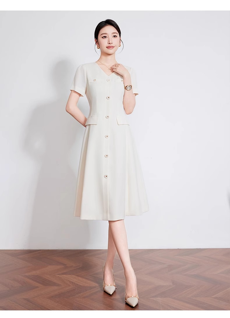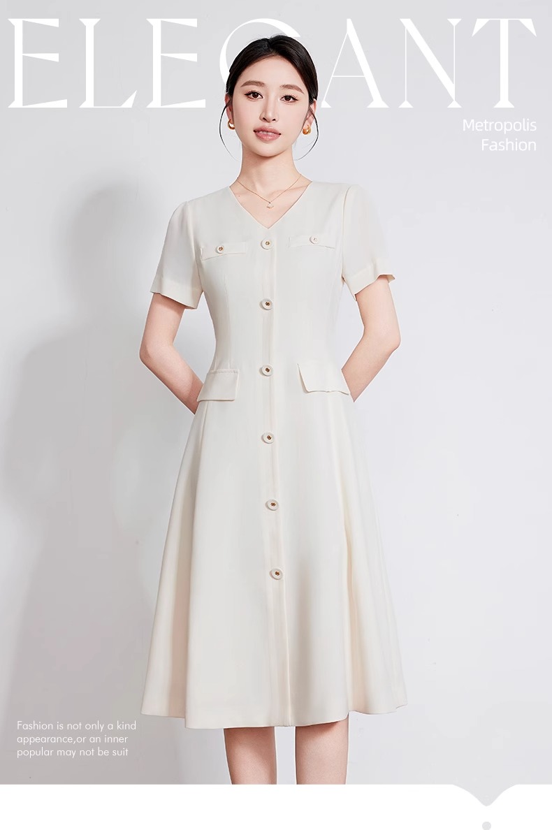 IWY/米白色夏季新款法式小香风连衣裙女高级感V领气质短袖裙子 242053Q1