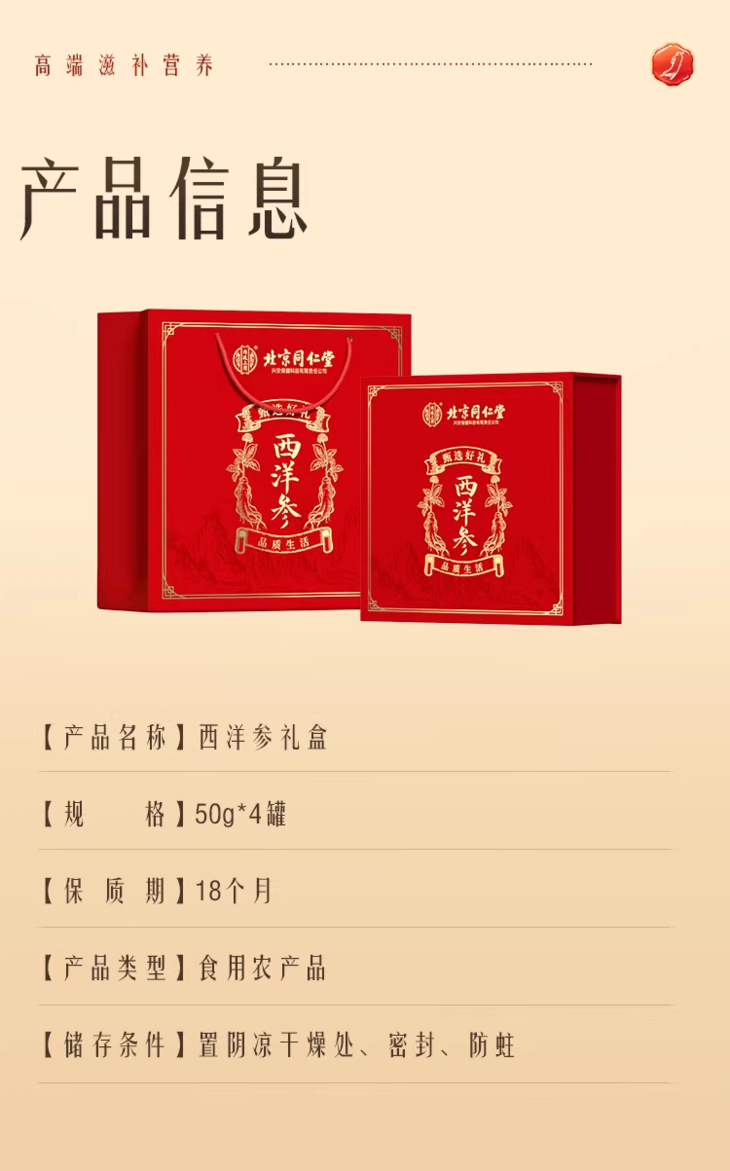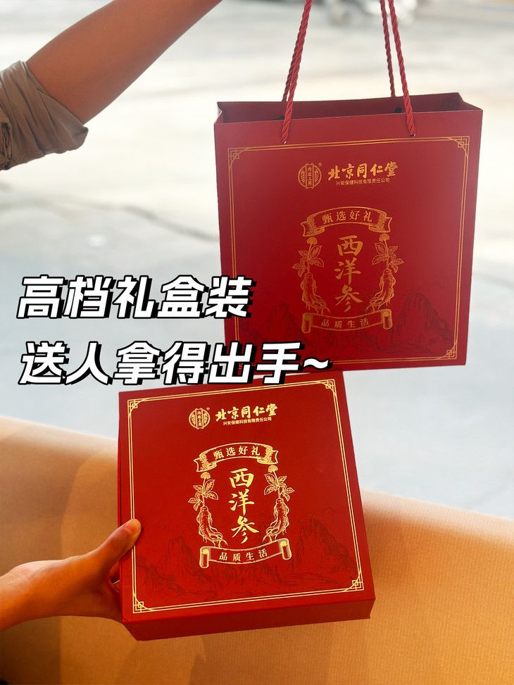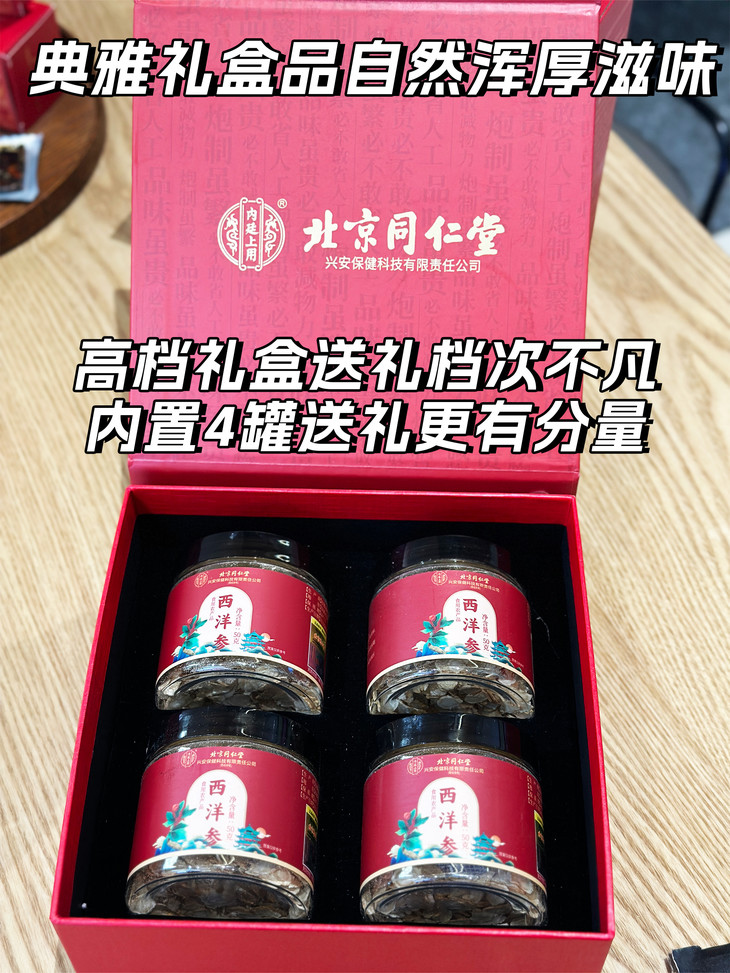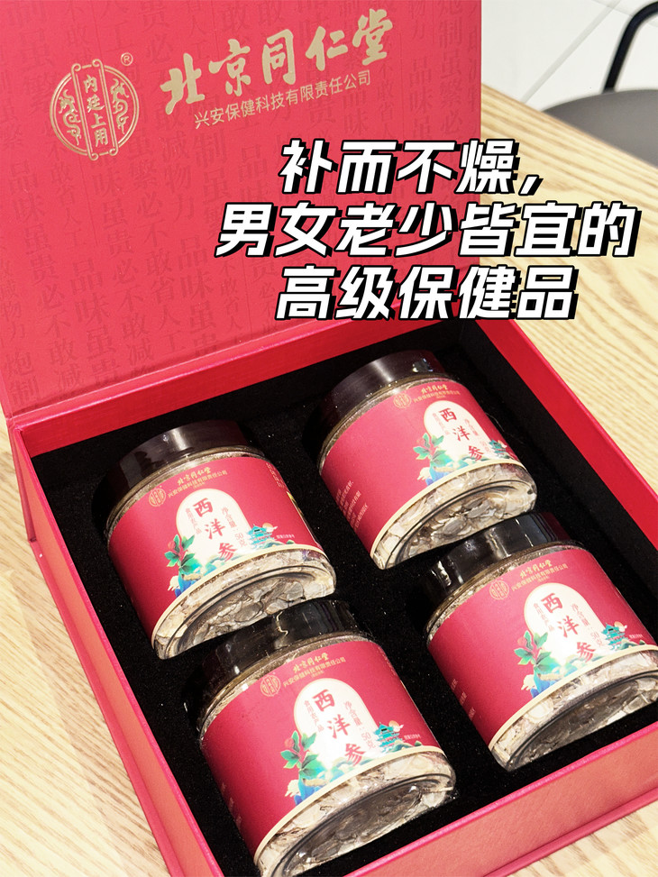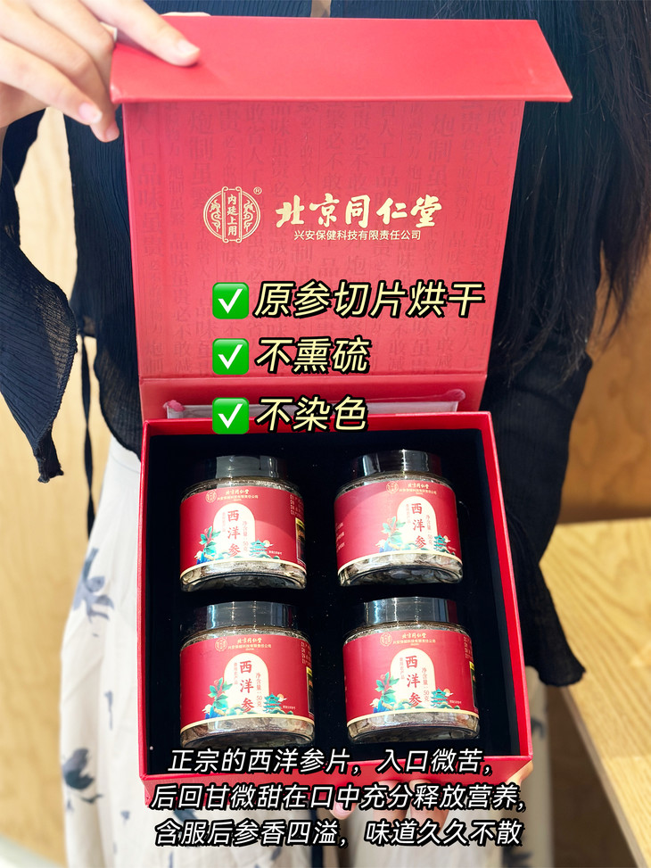 线下在售一瓶199🎁送礼首选‼️【北京同仁堂西洋参片】 一瓶50克,礼盒装一盒4瓶共200克! 开团礼盒款1盒只需💰159💥单瓶价格39.9 建议直接买礼盒装!送人自用都合适! 👍北京同仁堂西洋参片!!百年国宝品牌! 品牌,品质,口感,都是难得的正经好货!节日送礼必备! 秋季,滋补好时节! 送人送礼健康首选,北京同仁堂百年国民大品牌 养生内调,养颜美肤送父母、送亲友、送健康~都相当好! 不要和市面几十块的做对比!