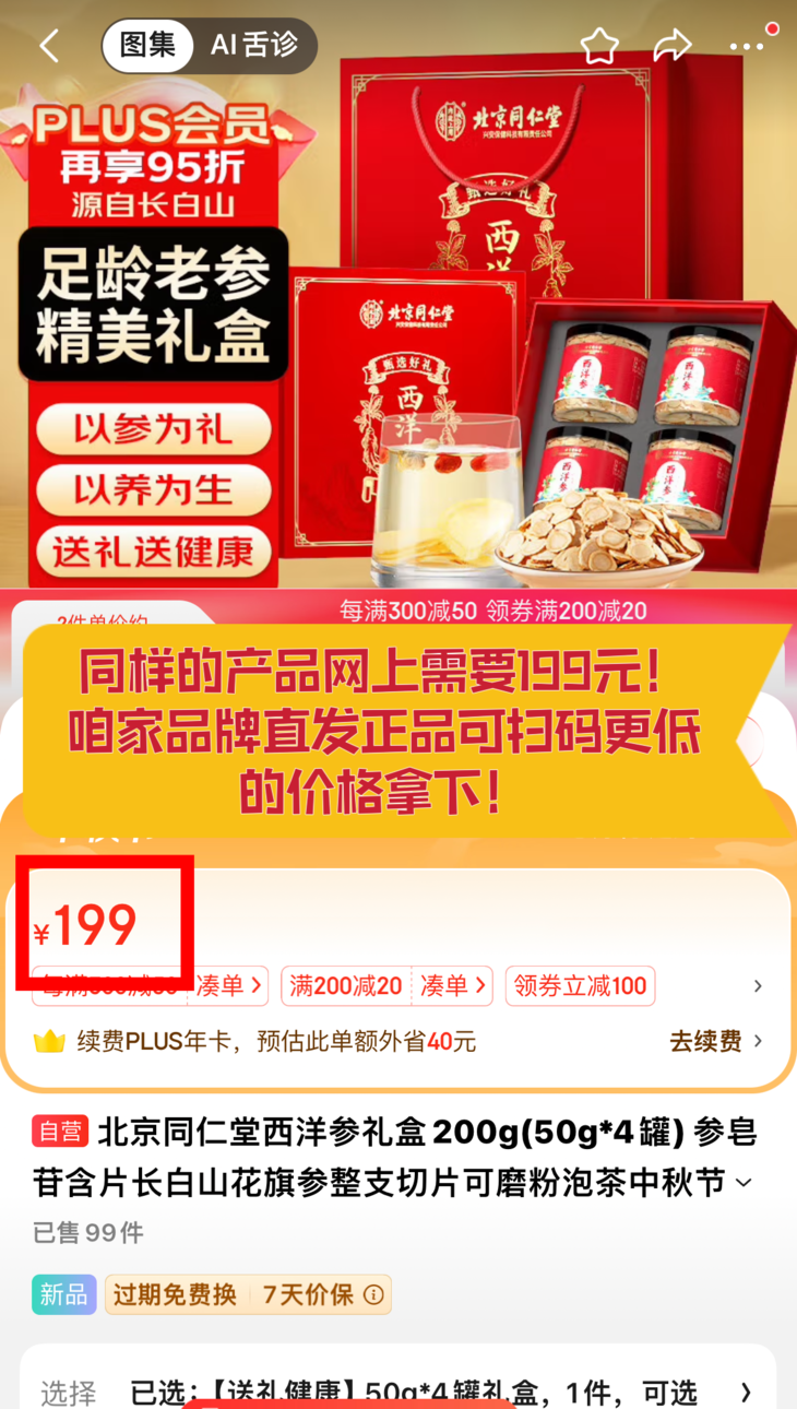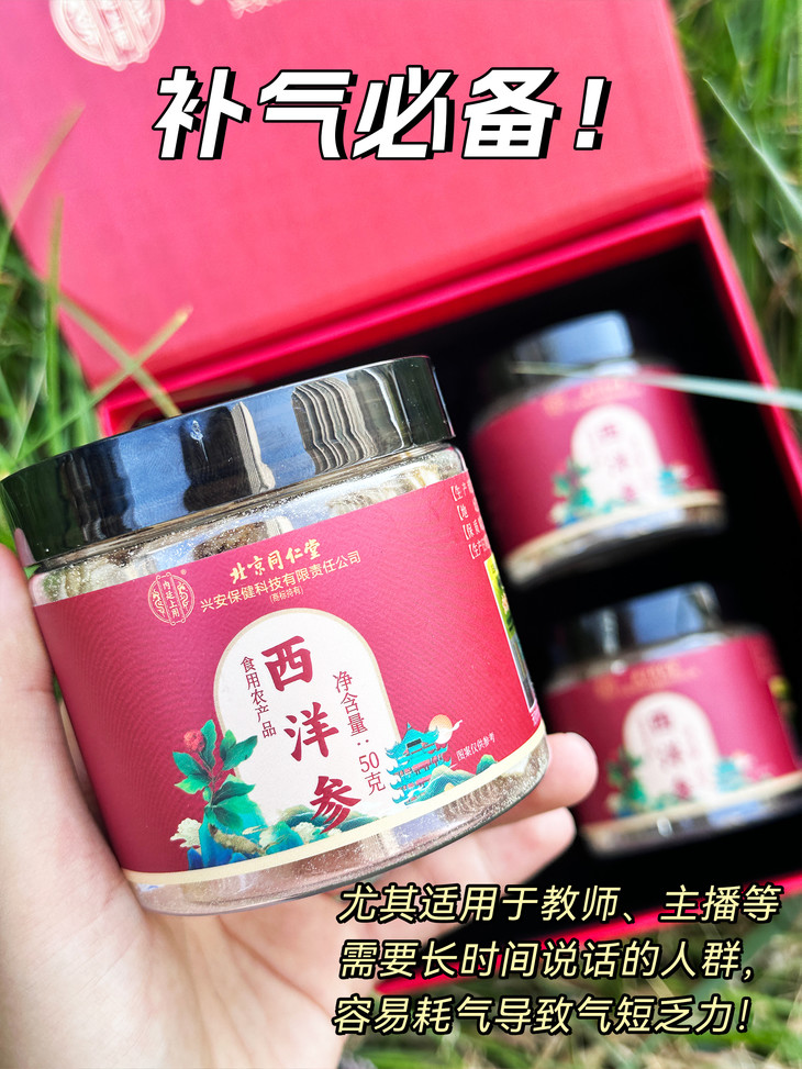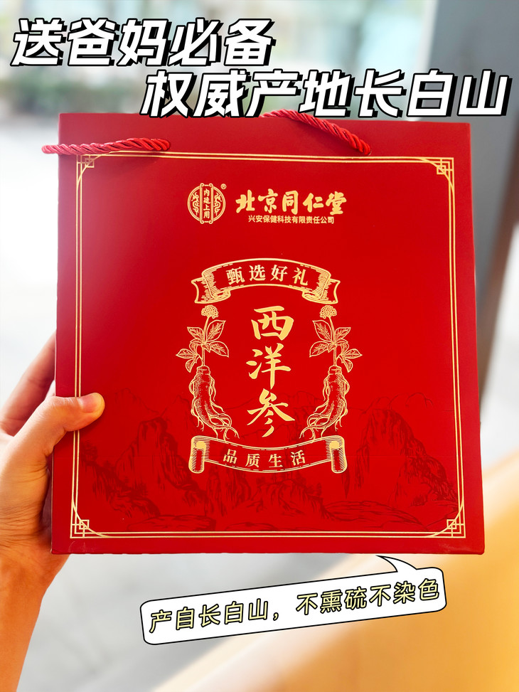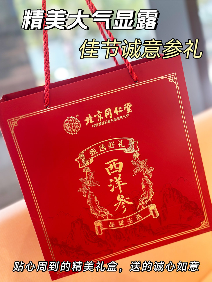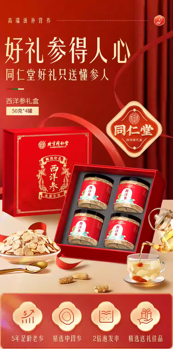 线下在售一瓶199🎁送礼首选‼️【北京同仁堂西洋参片】 一瓶50克,礼盒装一盒4瓶共200克! 开团礼盒款1盒只需💰159💥单瓶价格39.9 建议直接买礼盒装!送人自用都合适! 👍北京同仁堂西洋参片!!百年国宝品牌! 品牌,品质,口感,都是难得的正经好货!节日送礼必备! 秋季,滋补好时节! 送人送礼健康首选,北京同仁堂百年国民大品牌 养生内调,养颜美肤送父母、送亲友、送健康~都相当好! 不要和市面几十块的做对比!