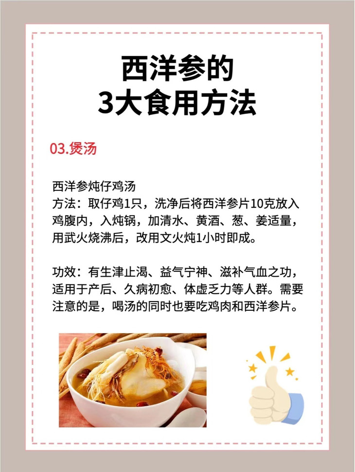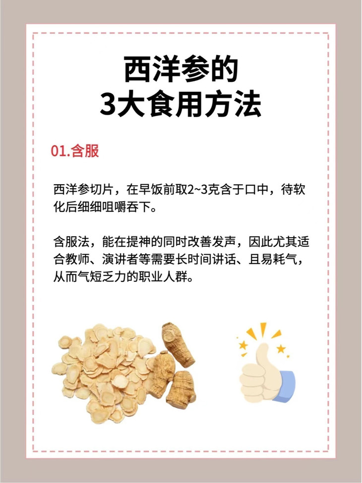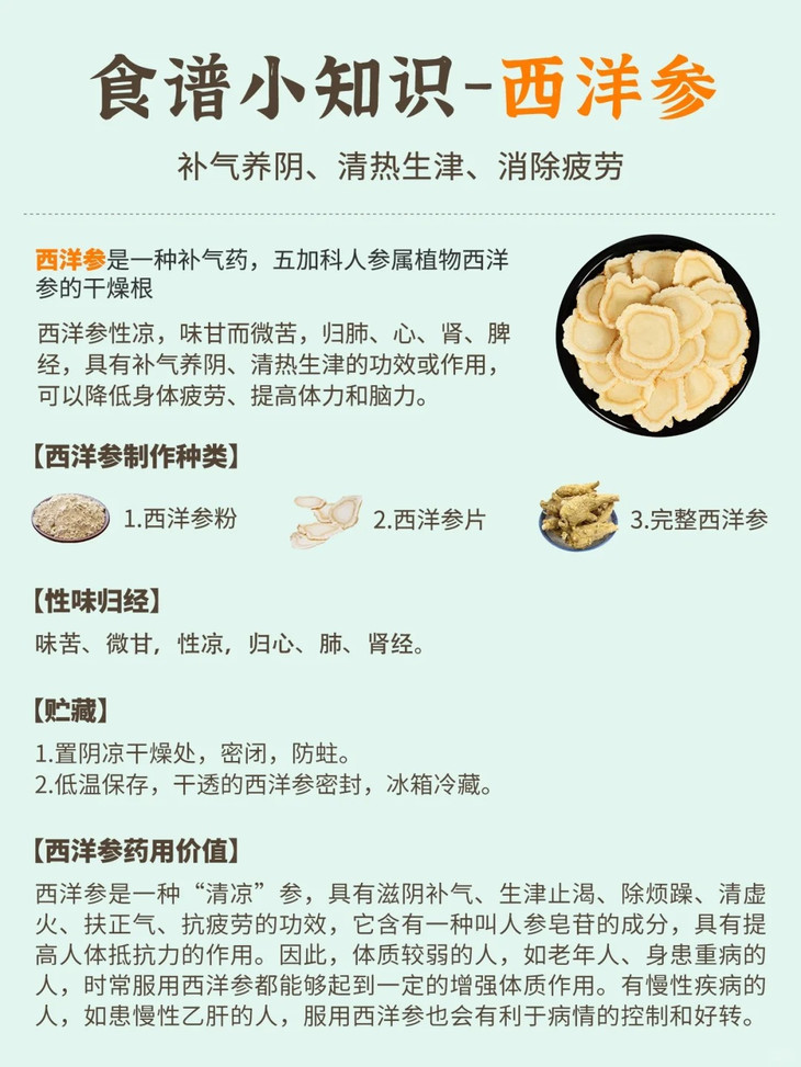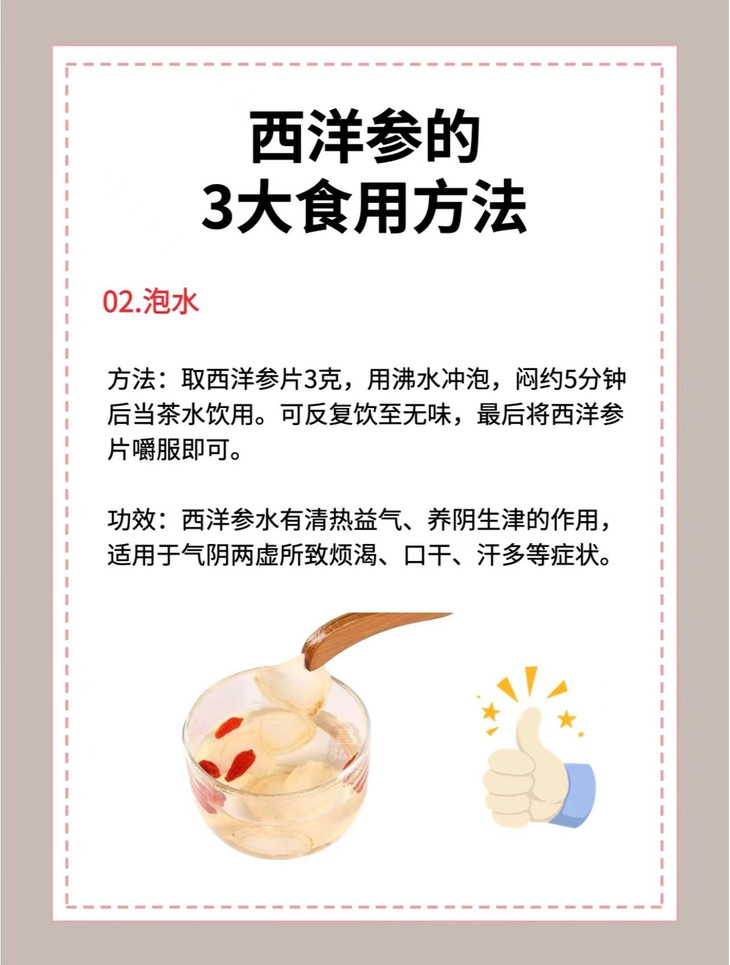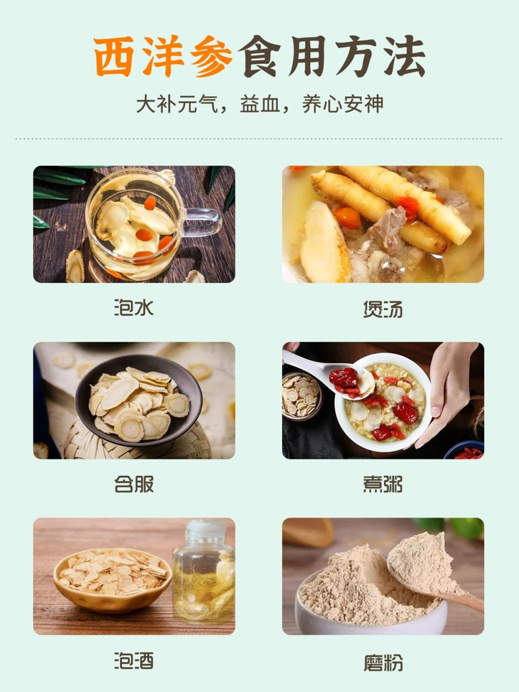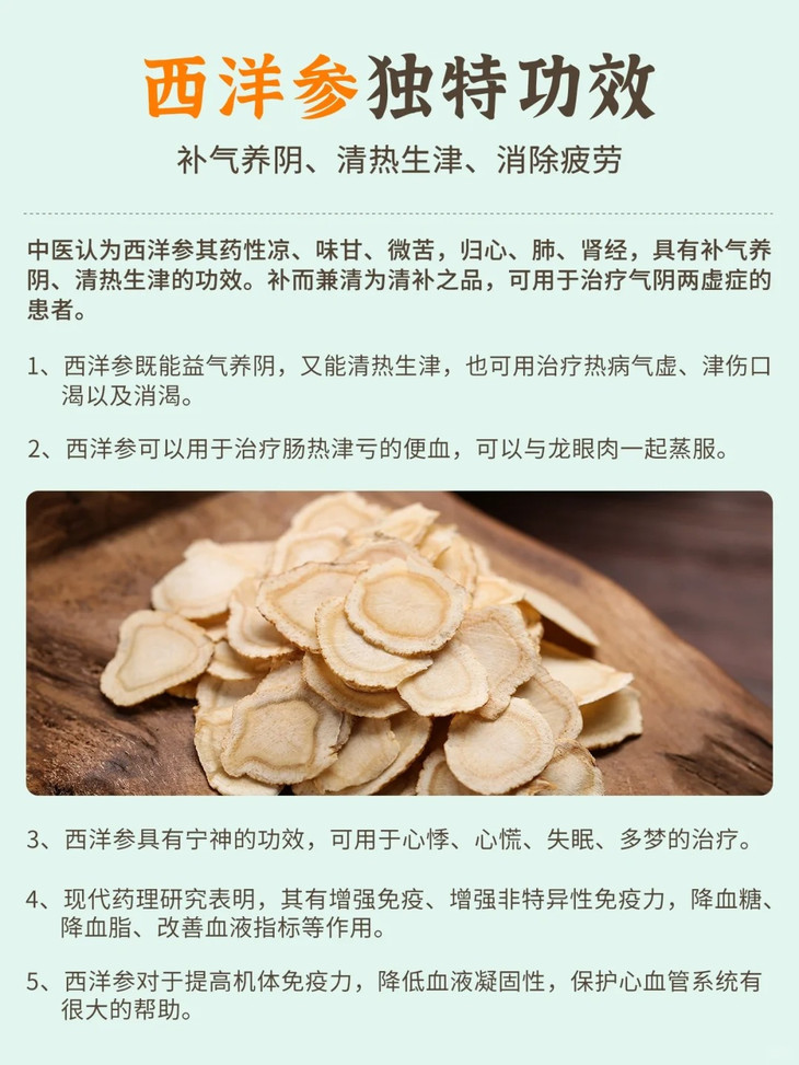 西洋参片好久好在非常方便 ⎷泡水喝⎷含服⎷也可以煮茶⎷煲汤使用 西洋参搭配黄芪——补气益气 西洋参搭配石斛——滋阴清热 西洋参搭配枸杞——养颜明目 西洋参搭配桂圆——改善气色 西洋参搭配红枣——补血养颜 西洋参搭配虫草花——提升免疫 西洋参搭配麦冬——生津养胃 西洋参搭配川贝——滋阴润肺