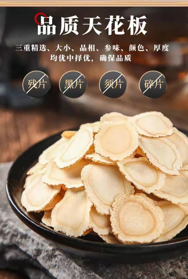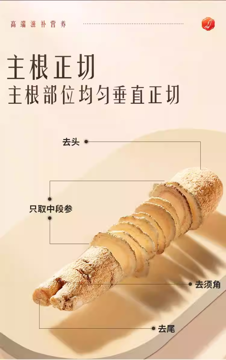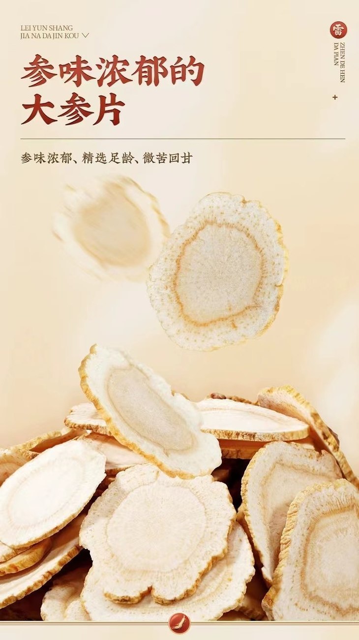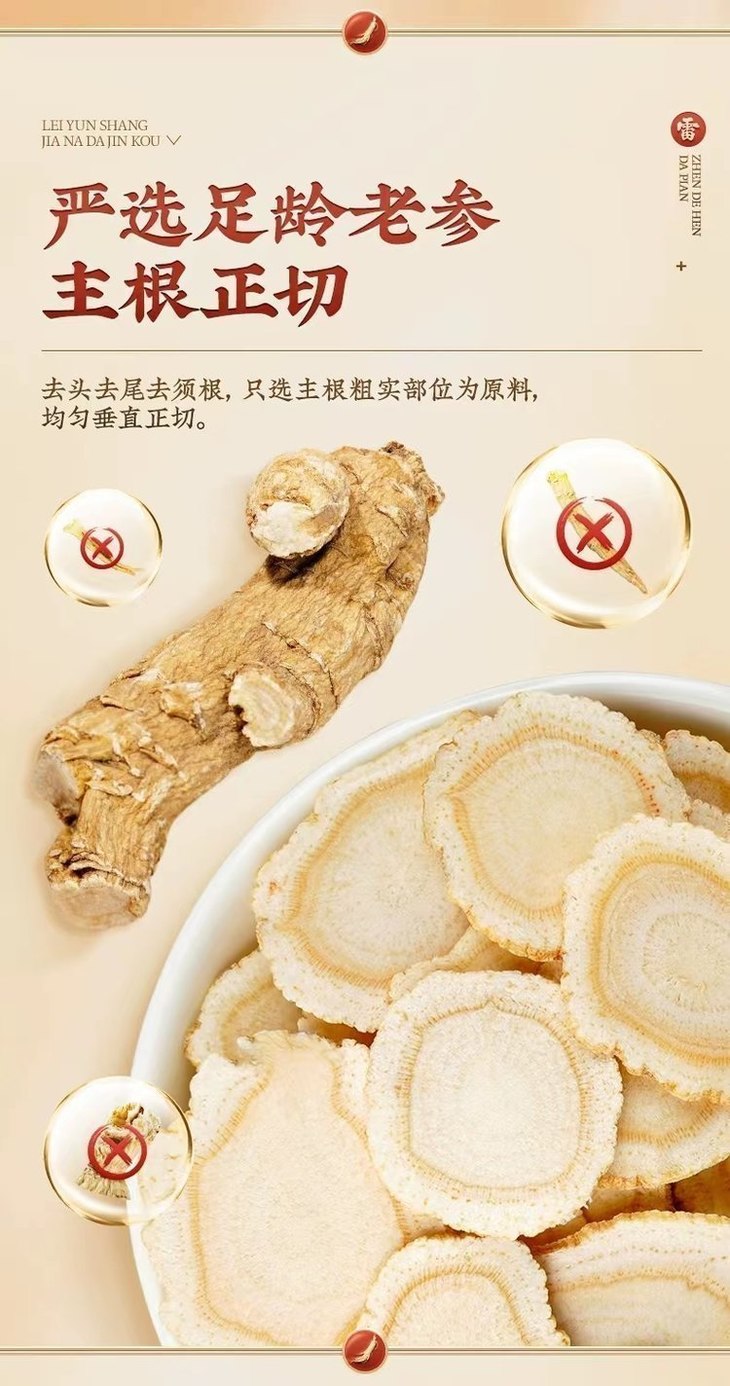 参片大小均匀,没有残片和黑片 无熏染,主根精细切片 人参精华养分高!滋补效果杠杠滴!