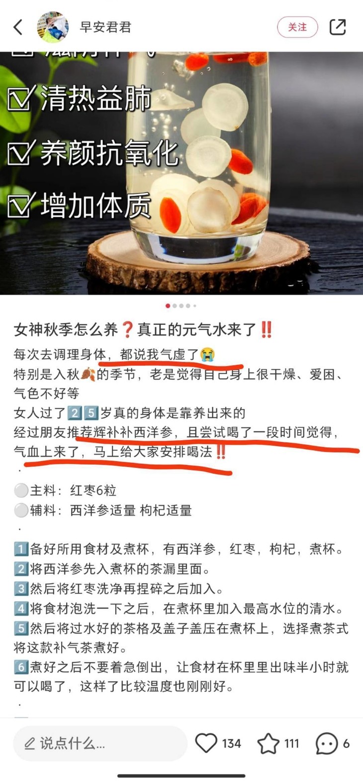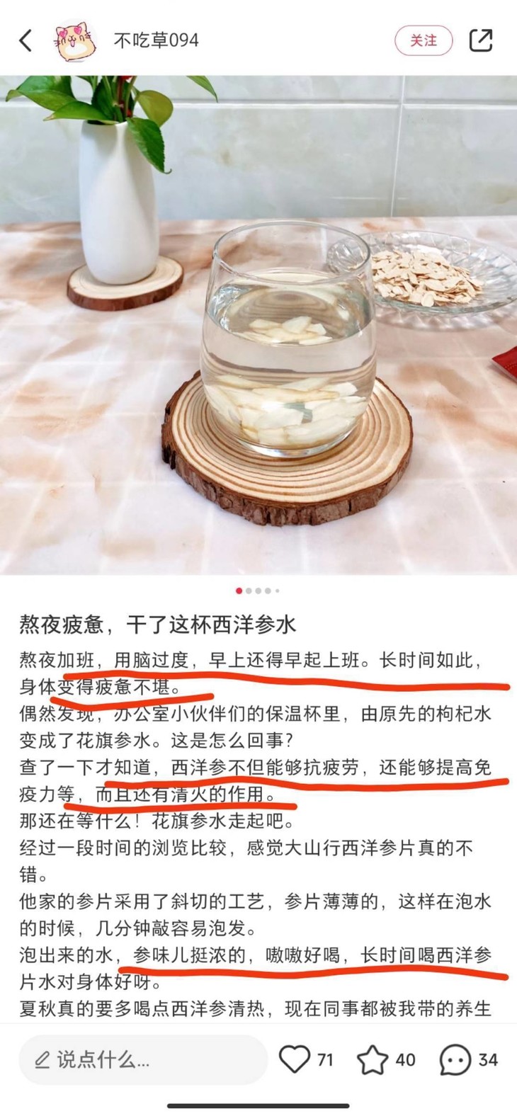 女人也更适合喝西洋参 气阴不足,气血虚、阴虚、 虚不受补 其中女性是占比最大的人群 说到“补”很多人先想到的就是“人参” 但人参性偏温热,补得太猛 很多人受不住这滋补,不适合日常食用 西洋参则可以此代之 ✅西洋参富含“人参多糖”,为天然免疫增强剂 ✅皂甙具有极强抗氧化性 是天然护肤品,总含量还是人参的“两倍” ✅同时还含有挥发油,树脂等 具有养阴清热、补气生津,镇静抚燥,治癌、减肥,增强抵抗力作用 ✅还有提高耐缺氧能力,对控制血糖很有帮助 味厚而不热,滋补而不腻 绝无温燥上火之弊,故被赞为“无火参”👍 用它日常滋补再好不过了