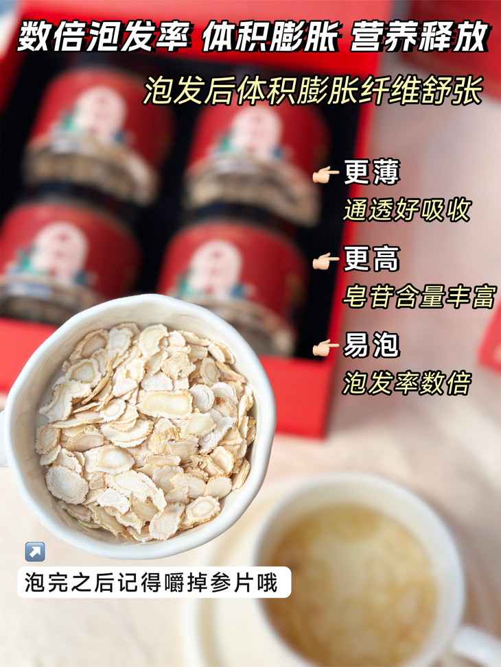 🔺泡发率达到本体3倍❗️ 比国产的要高出1-2倍! 泡水10秒,参味十足!浓郁纯正! 茶质晶莹透亮,带来原味回甘好口感 片薄且均匀,膨胀率高 更有易于更利于皂苷、sod精华等营养析出 可以泡水,也可生嚼、泡酒,炖汤/粥等等 食用方法多样,怎么吃都补!