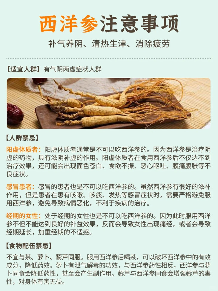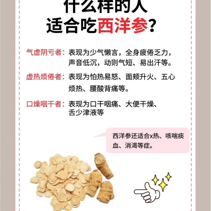 🌈适用人群 西洋参适用于气虚阴亏,虚热烦倦,咳喘痰血,内热消渴,口燥咽干者 以下人群都非常适合日常使用西洋参滋补: