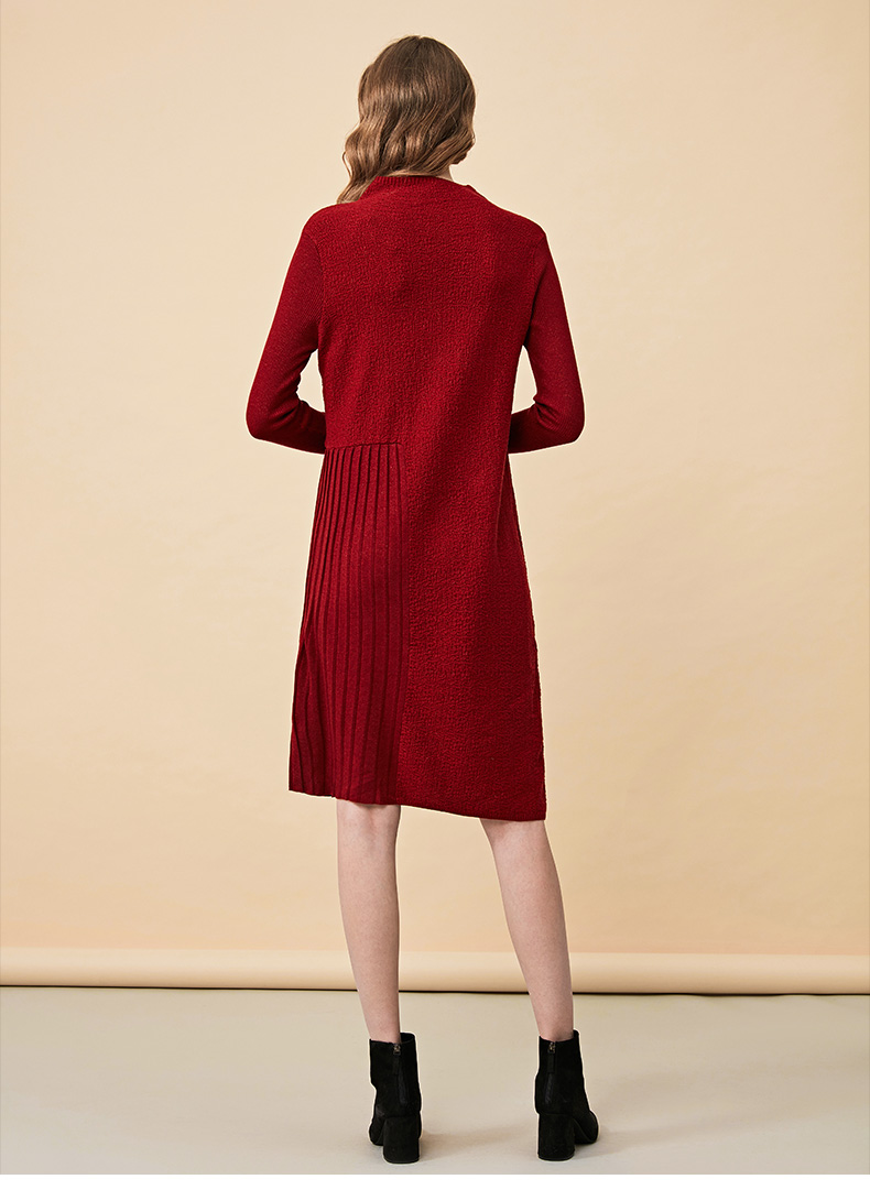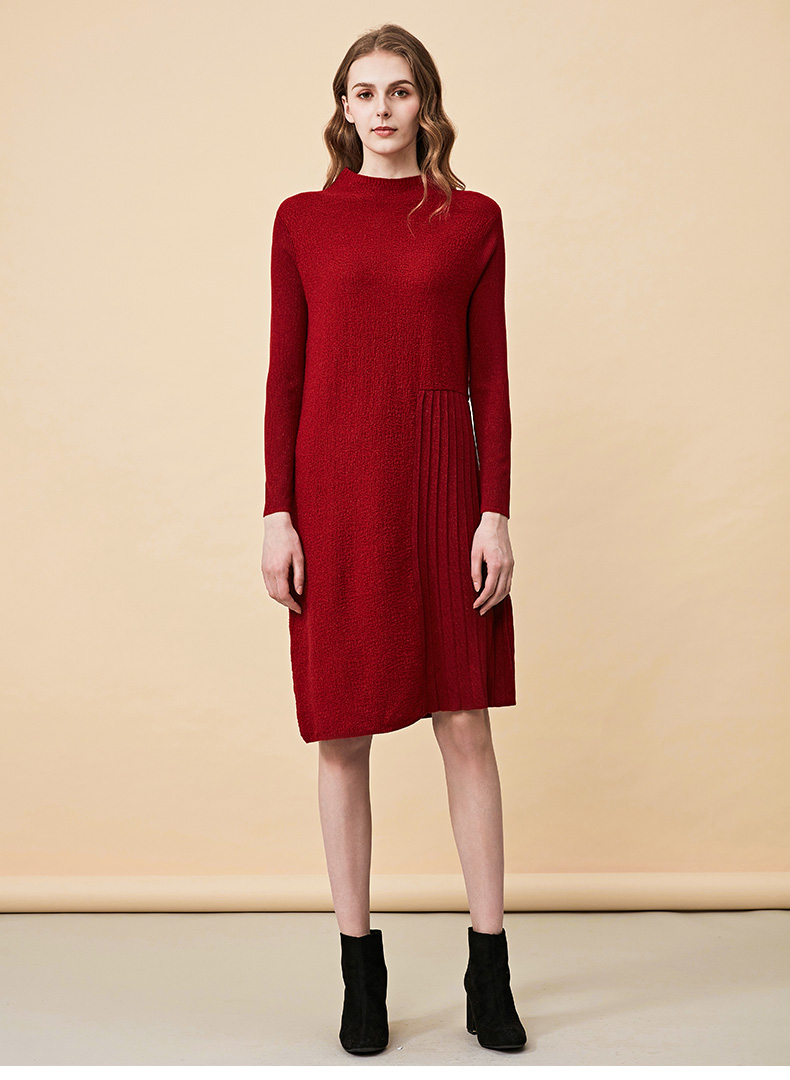 皮尔卡丹女秋冬新款红色拼接针织连衣裙小立领气质宽松一步裙
