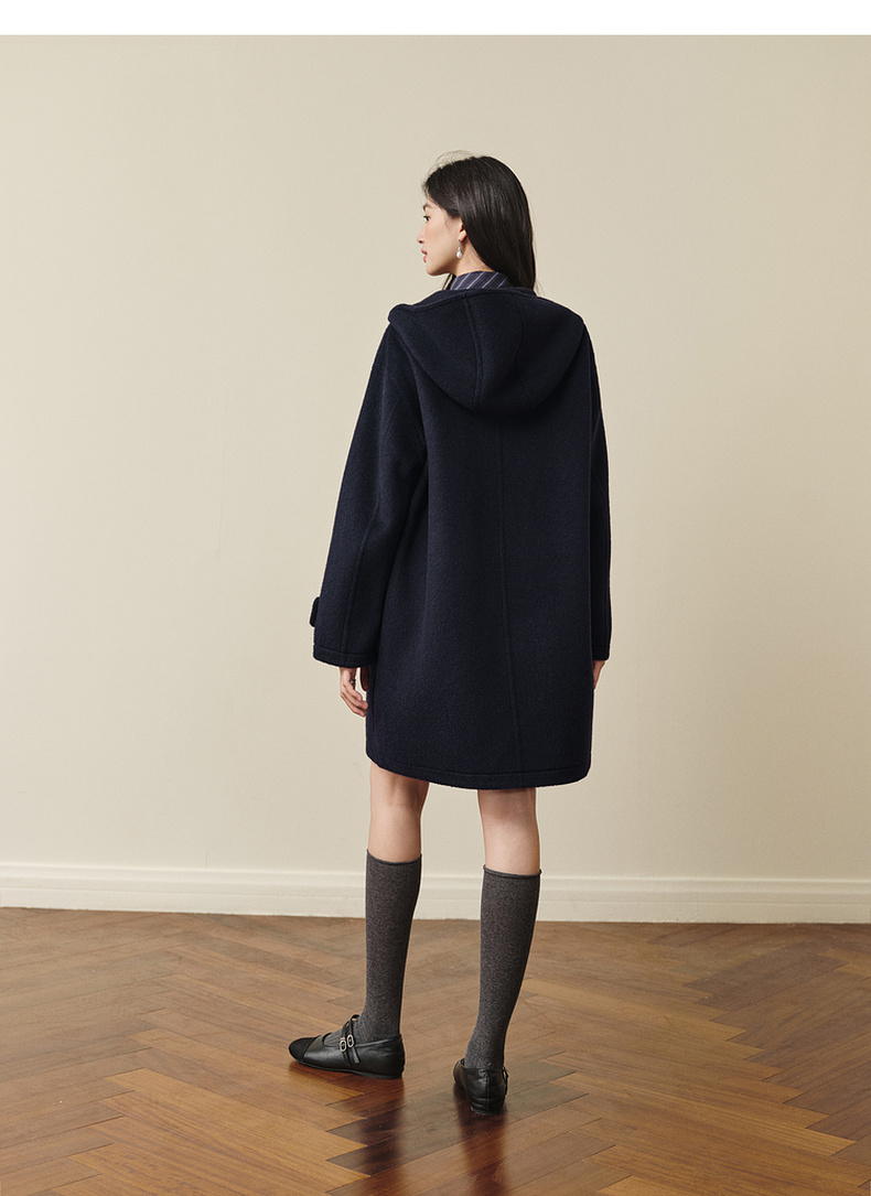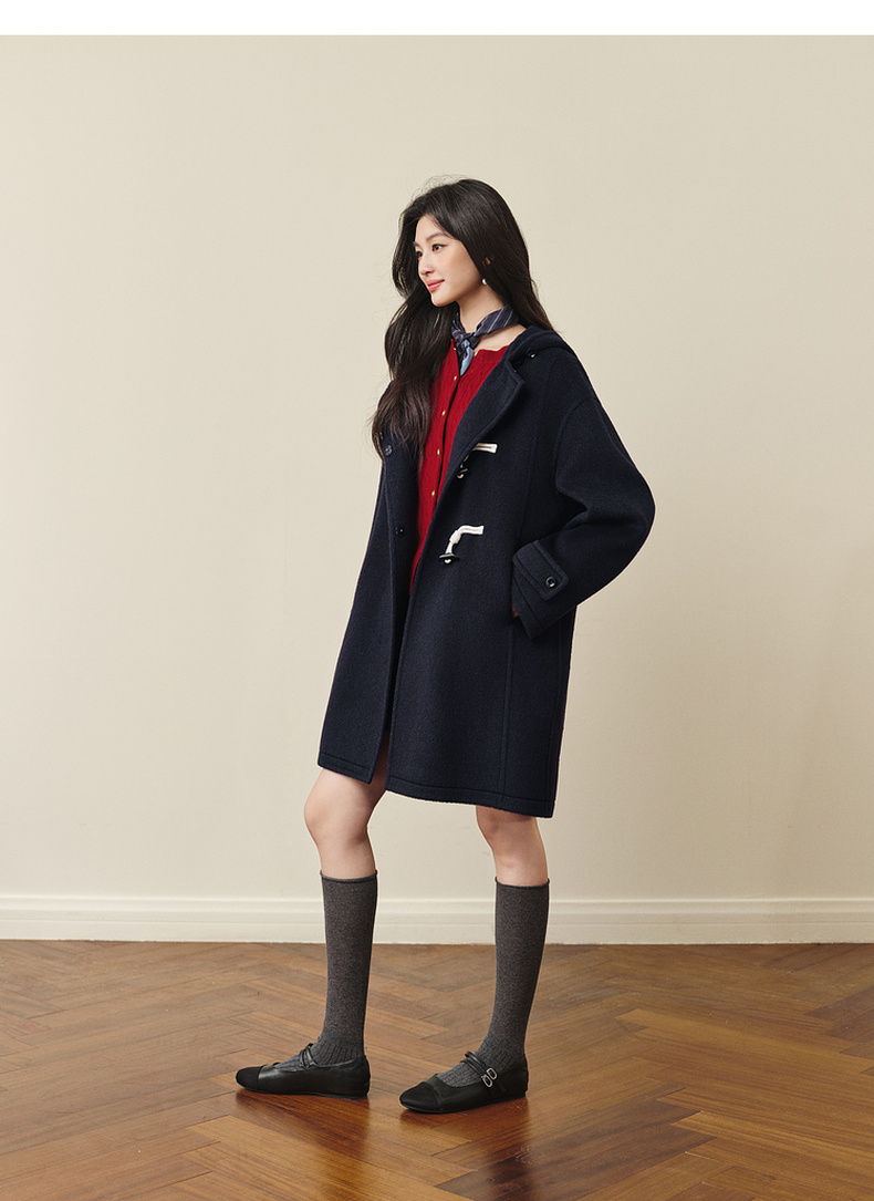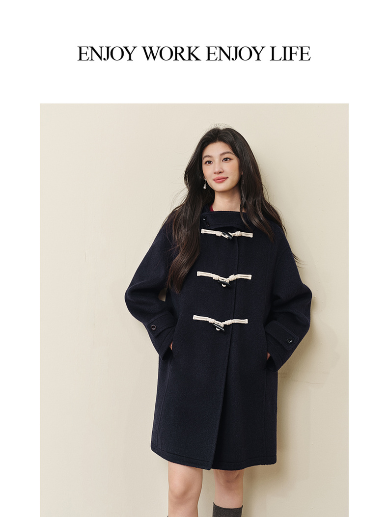 【严选】诗凡黎学院风牛角扣连帽毛呢外套2025冬新款气质羊毛双面呢大衣女7G9370241