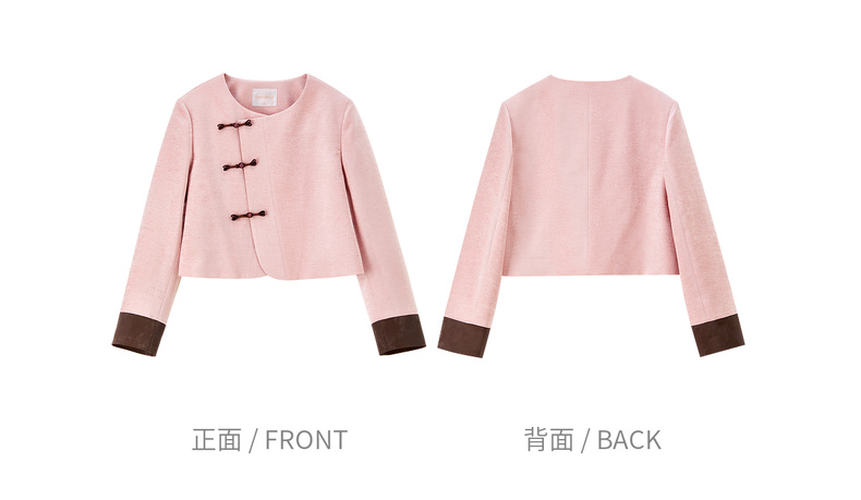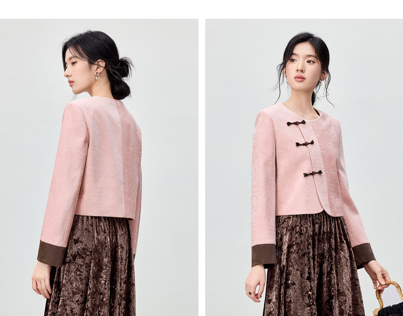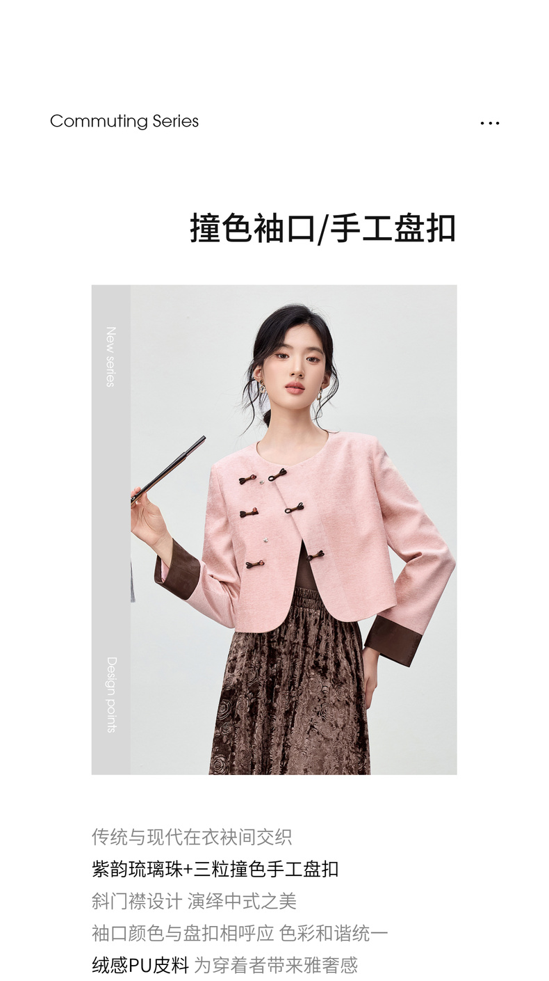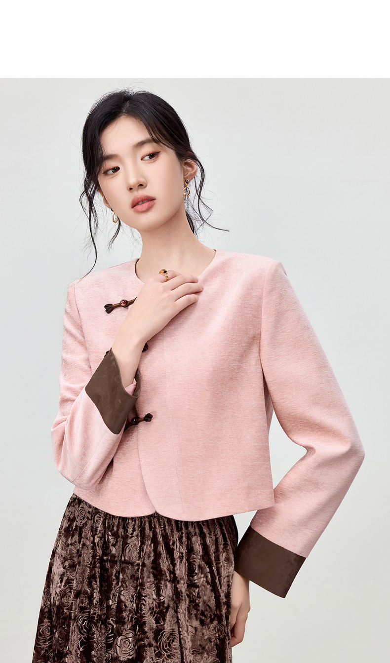 【内购】【撞色设计】通勤宴会圆领国风盘扣斜门襟垫肩双面绒感PU皮外套-Q53WB3521