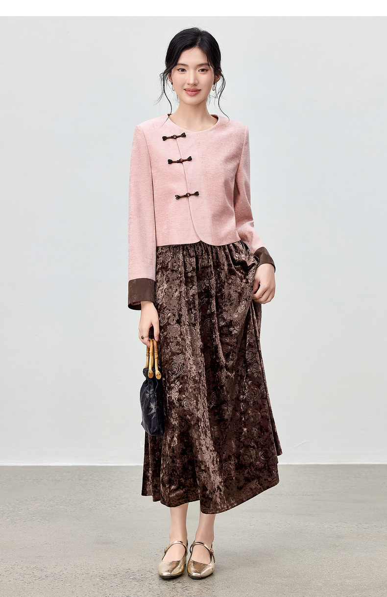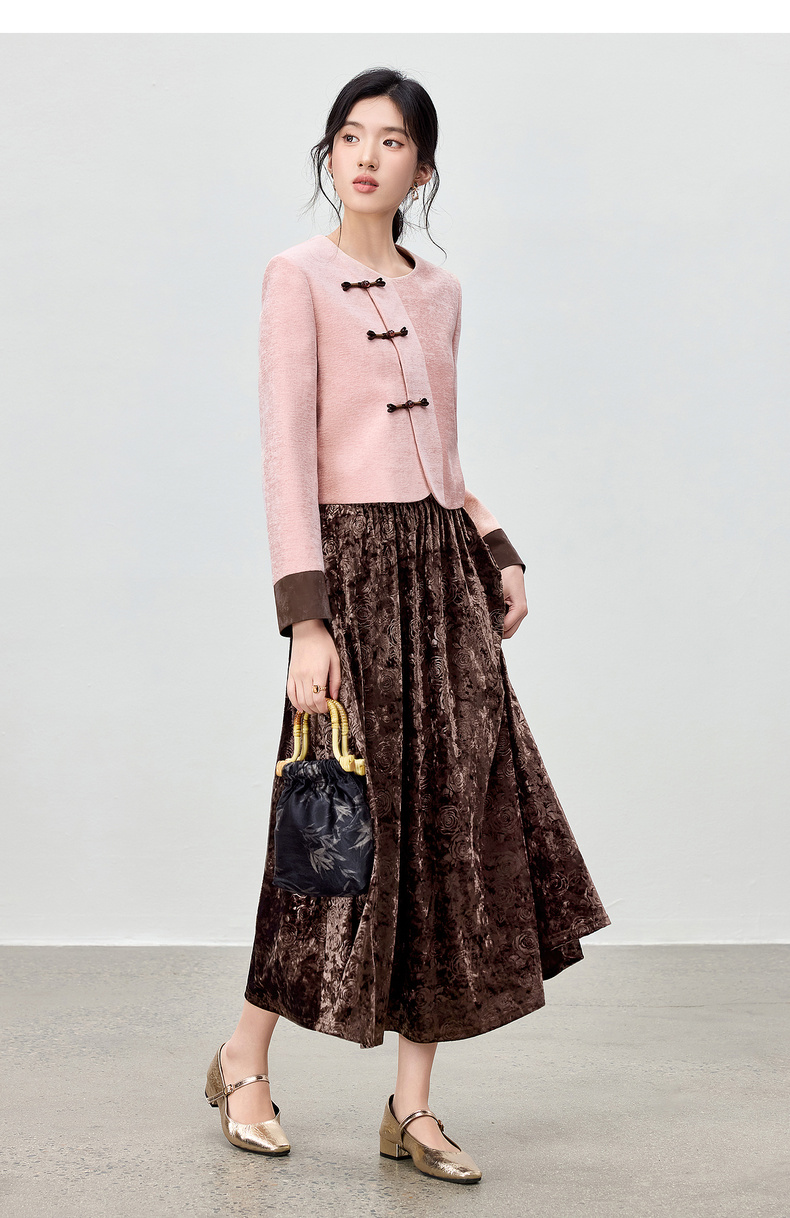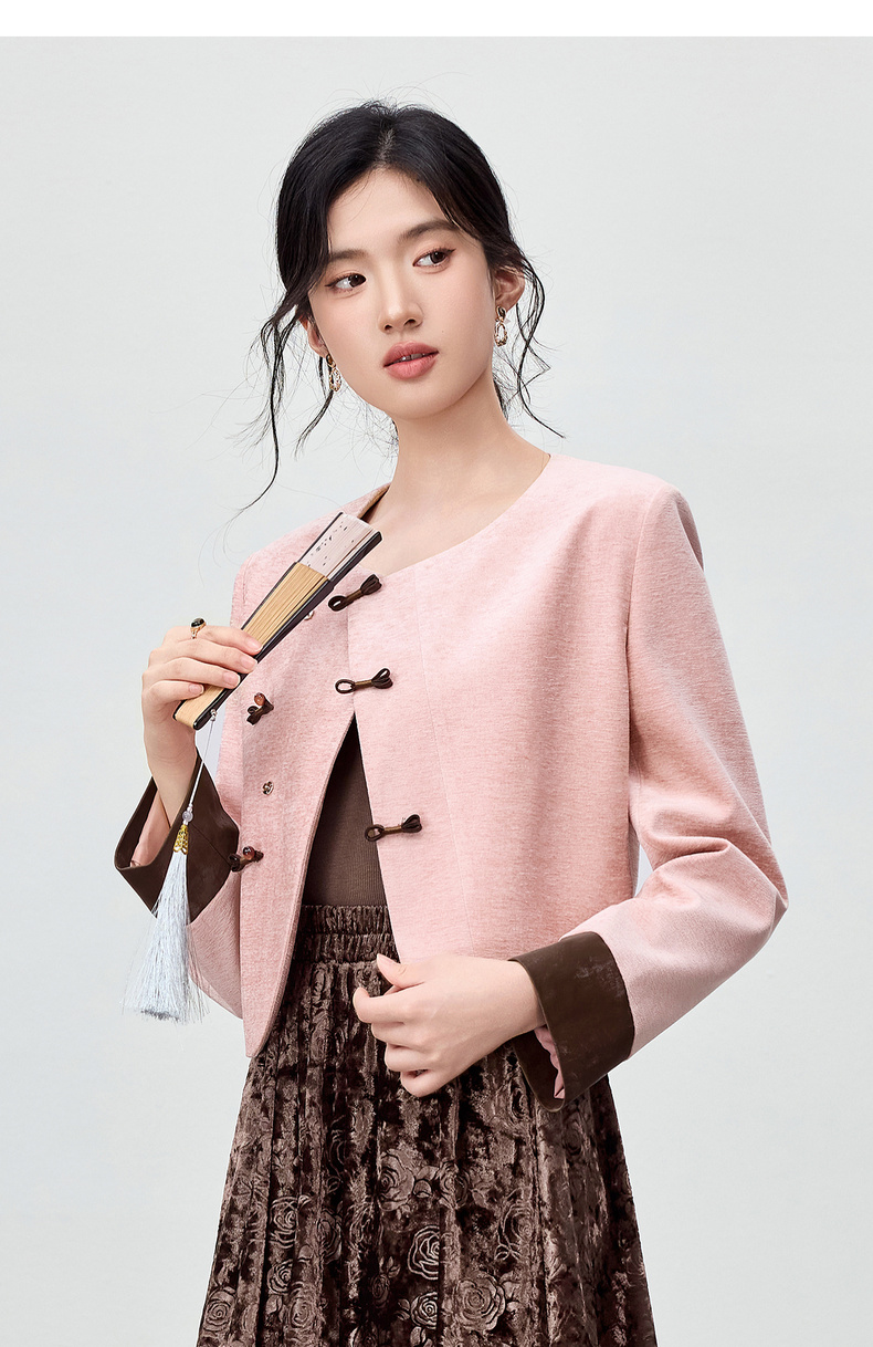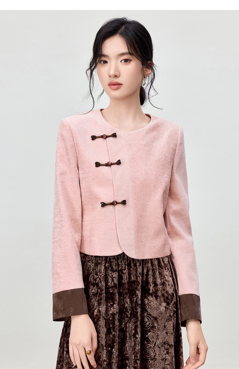 【内购】【撞色设计】通勤宴会圆领国风盘扣斜门襟垫肩双面绒感PU皮外套-Q53WB3521