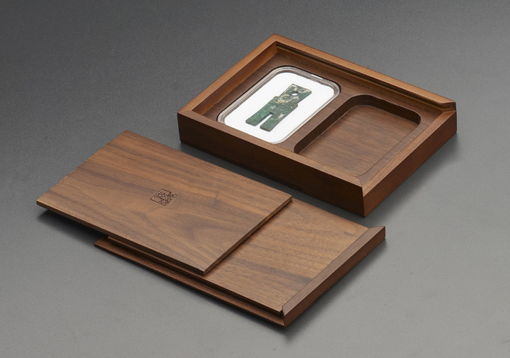 黑胡桃横向双枚装明泰大布币钱币盒,采用进口正宗美国黑胡桃精工制作,非常精美,很上档次,尺寸123*162*31mm,盒体开口向右,盒面素面无文,内隔板阴刻本色老钱庄方印商标.盒内槽孔适用于明泰大布币盒.木盒不包括图中钱币!