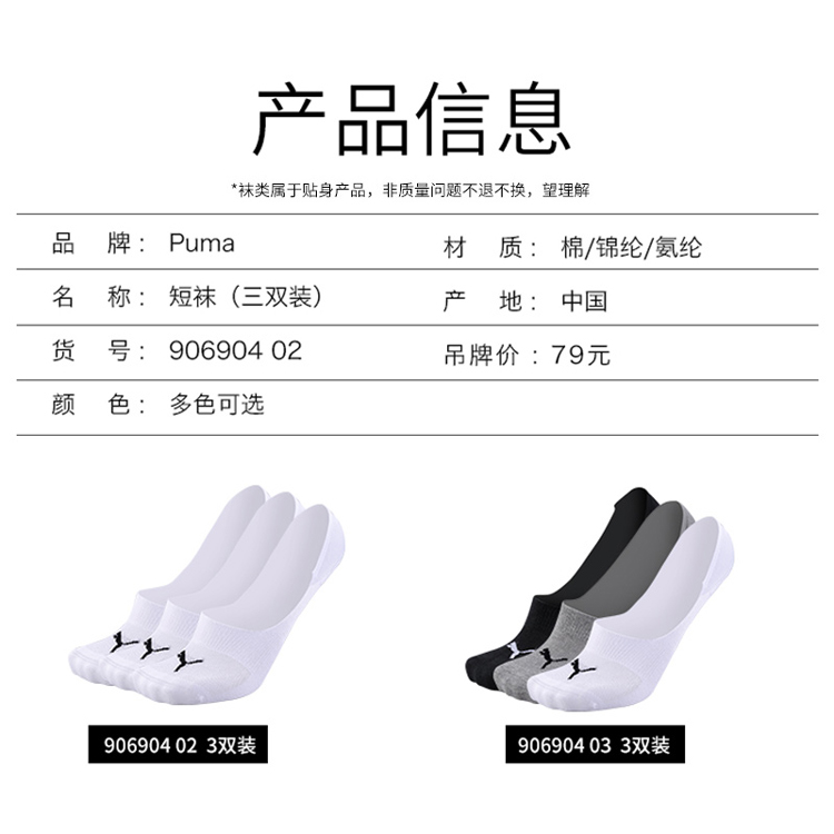 PUMA彪马UNISEX运动袜3双装休闲船袜浅口袜906904